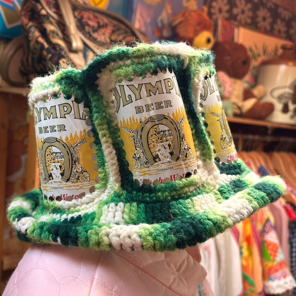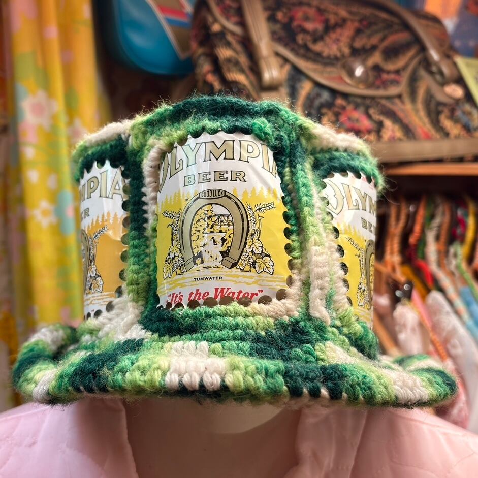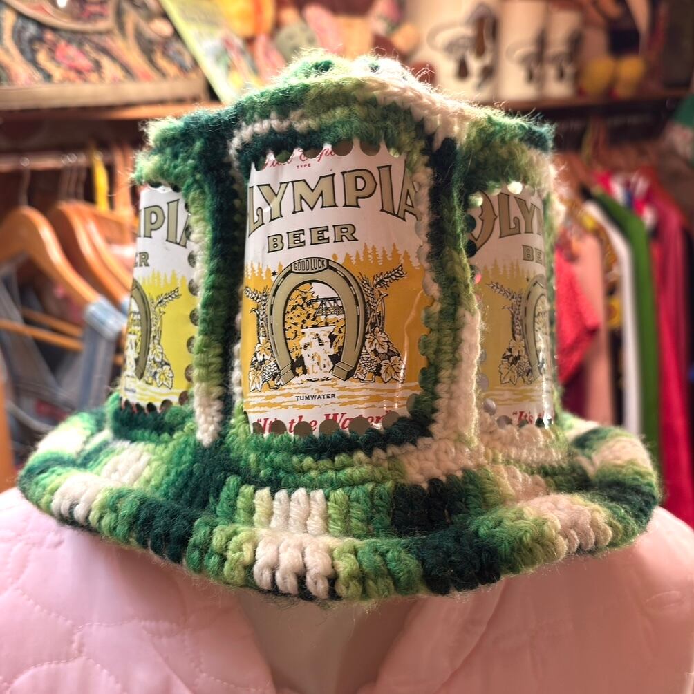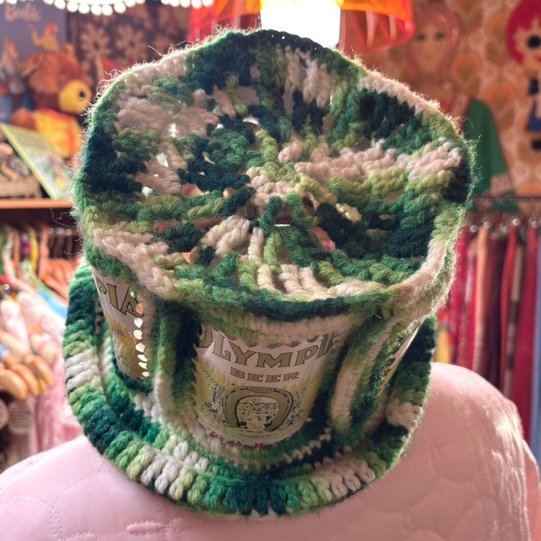 1896年創業のアメリカのビール会社 OLYMPIA BEERのビール缶をカスタマイズしたヴィンテージ ならではなユニークな手編みのハットで、グリーン、ライトグリーン、ホワイトのカラーリングやバケットハットのようなフォルムがとっても可愛いです。