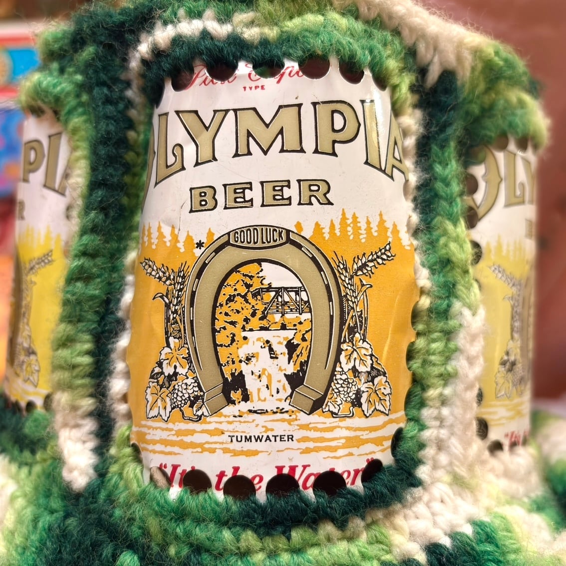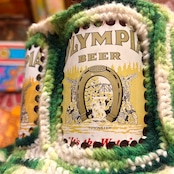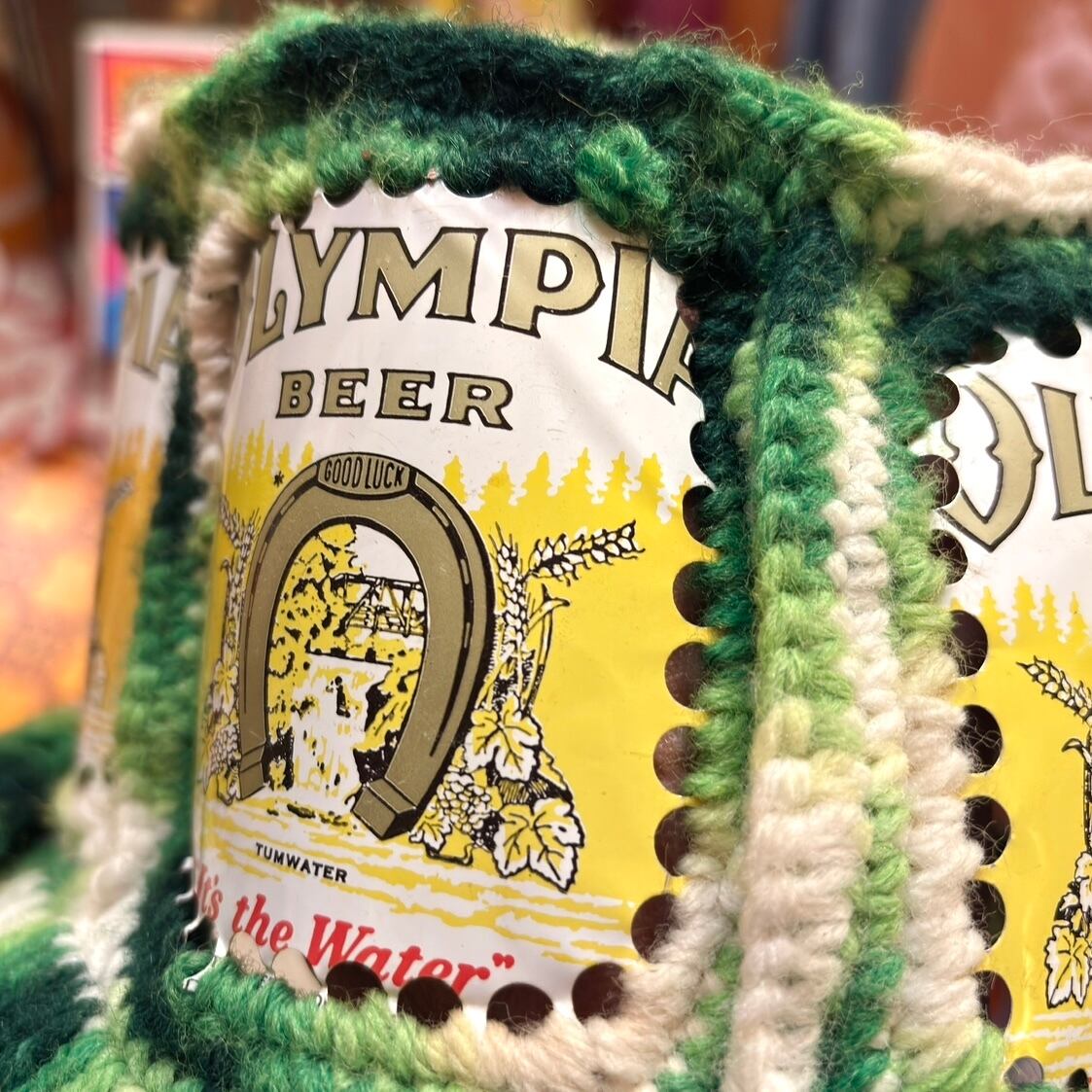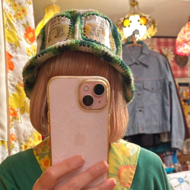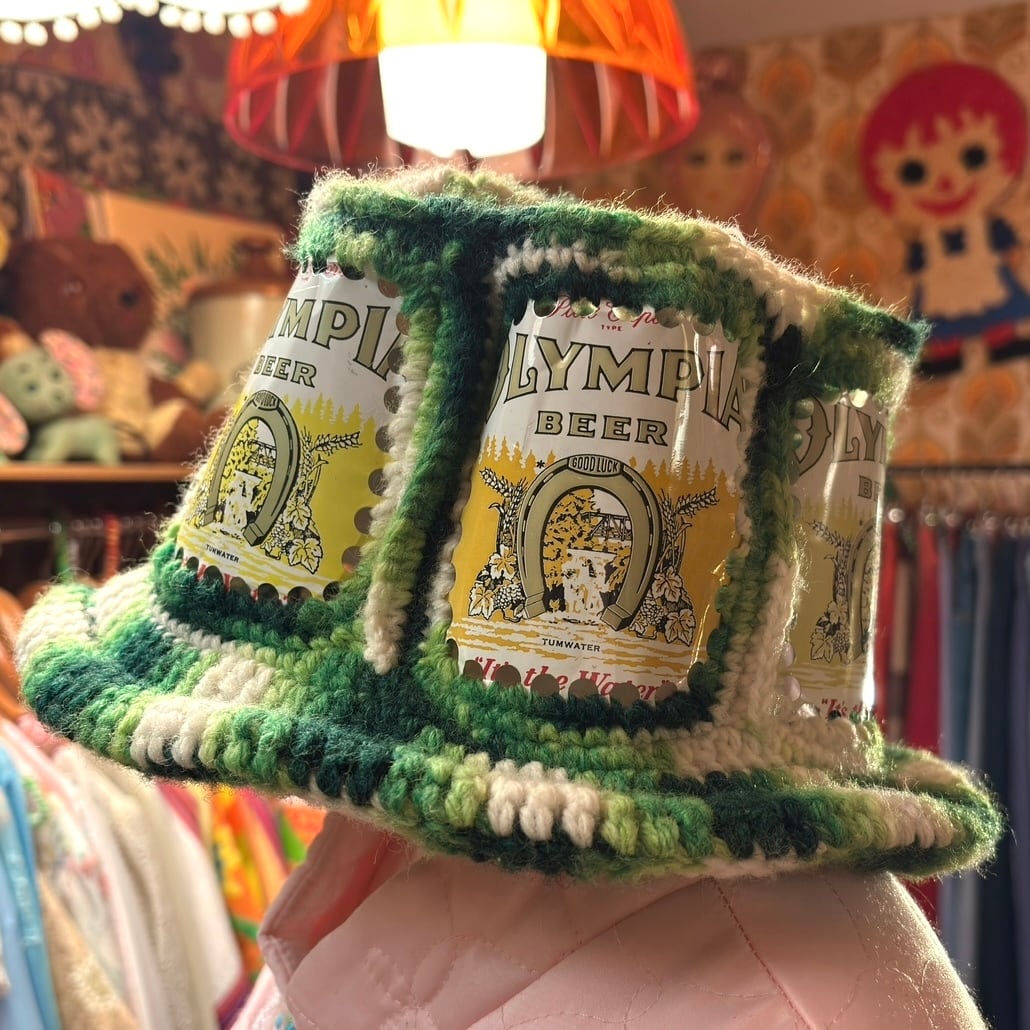 1896年創業のアメリカのビール会社 OLYMPIA BEERのビール缶をカスタマイズしたヴィンテージ ならではなユニークな手編みのハットで、グリーン、ライトグリーン、ホワイトのカラーリングやバケットハットのようなフォルムがとっても可愛いです。