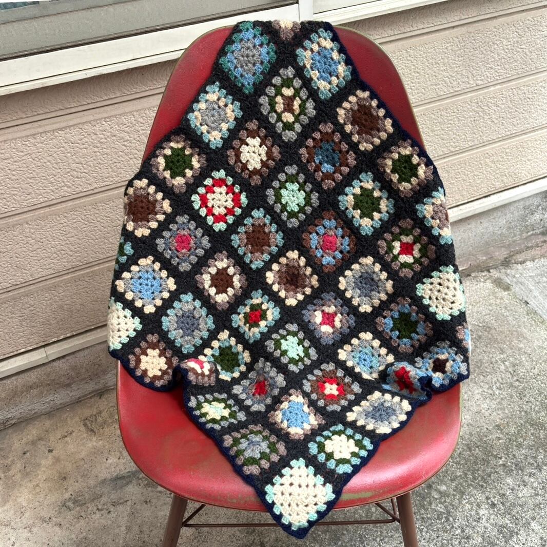 ブラックグレー、ネイビーベースに落ち着きのあるカラーリングのグラニースクエアモチーフがとっても可愛いアイテムです。