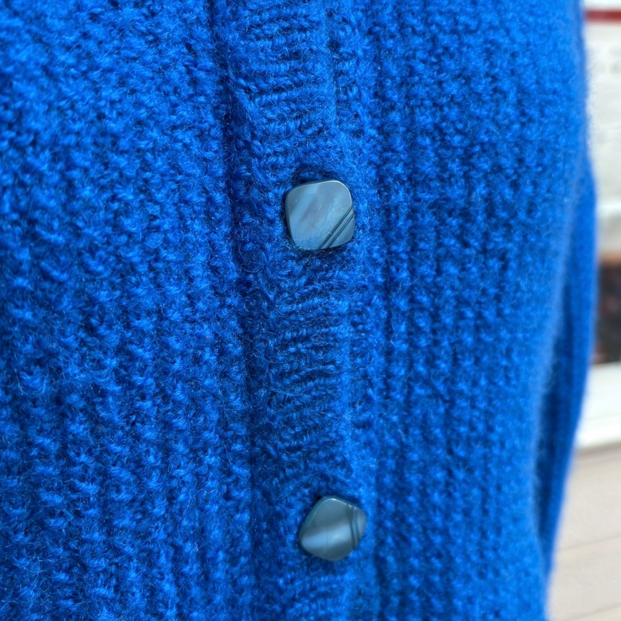 襟元中央の小さなVのデザインやラインの入ったスクエアのオールドプラスチックのボタンも可愛いポイントです。