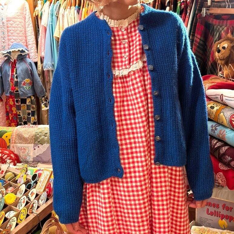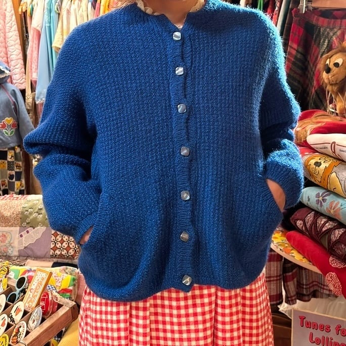 70年代 ヴィンテージ 当時のハンドメイド1点もの デザインスリーブ ニットカーディガンです。