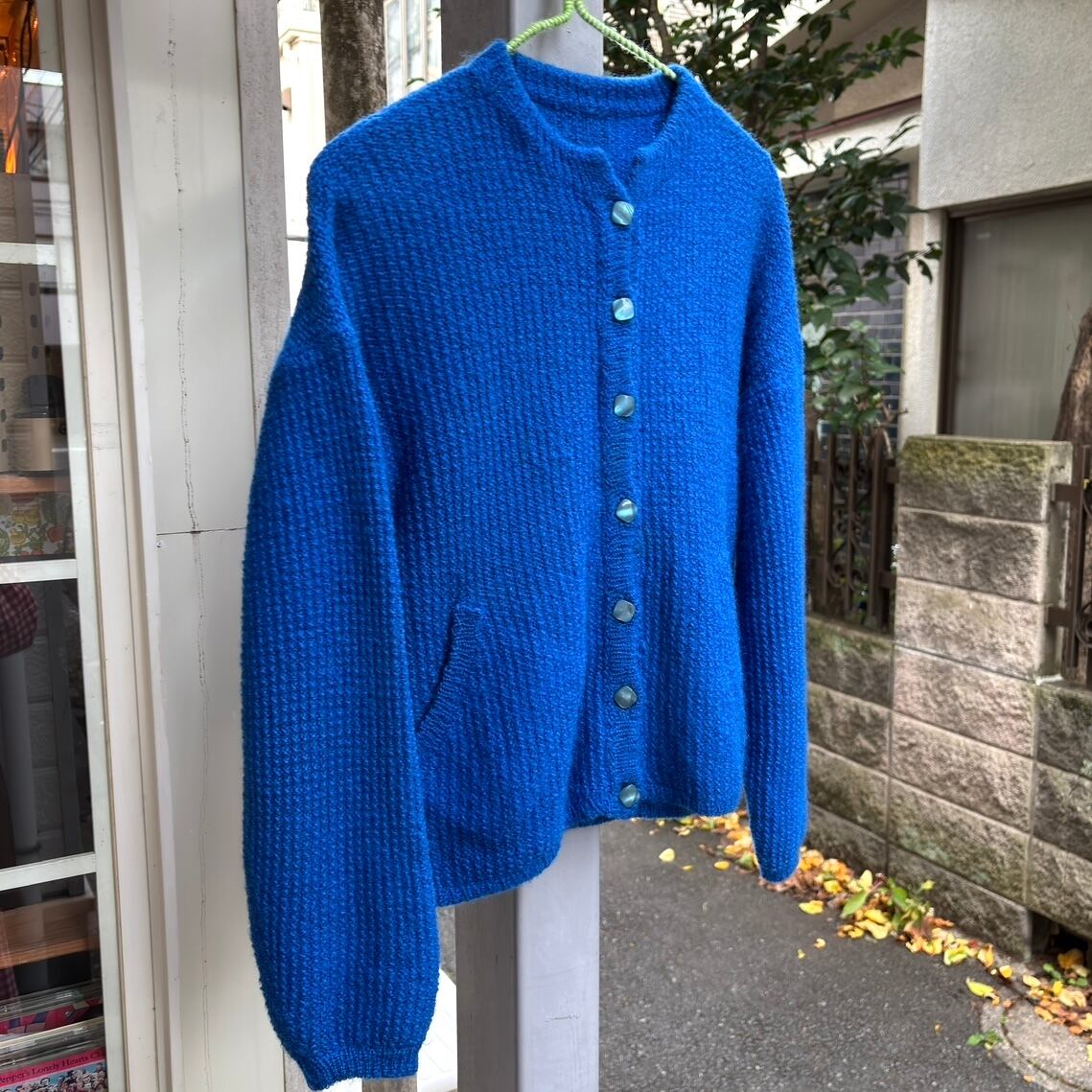 背面側の左肩に横線のようなリペア、ボタンのある編み目のラインに若干の寄れがありますが、古着に慣れている方ですと、あまり気にならない程度かと思います。