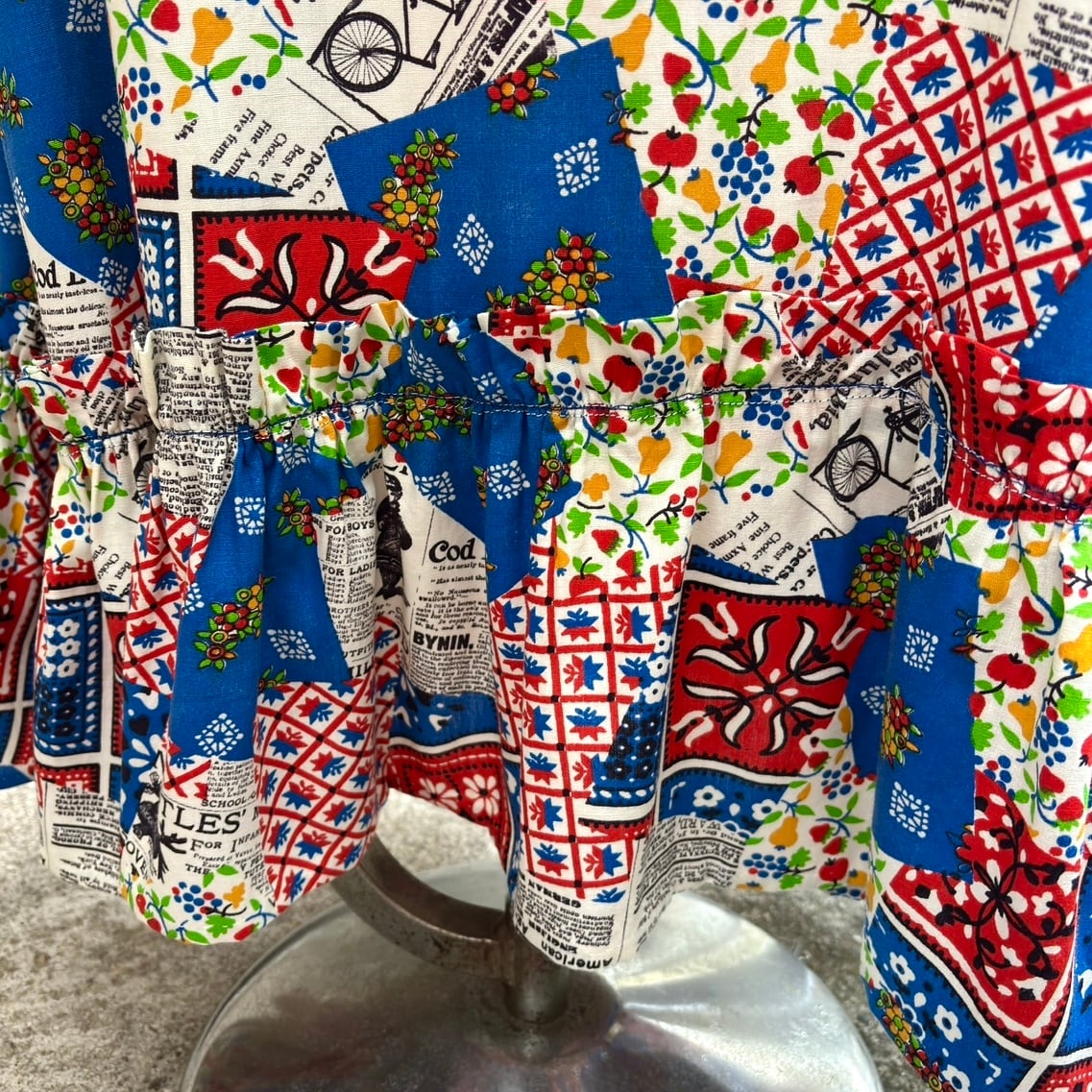 レトロポップなフラワー柄やイチゴや洋梨などのフルーツ柄、自転車や女の子や鳥などの挿絵が雰囲気のあるニュースペーパー柄のパッチワークプリントがとっても可愛い1着です。
