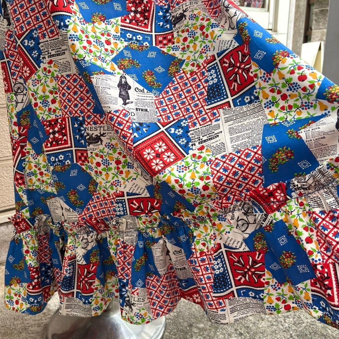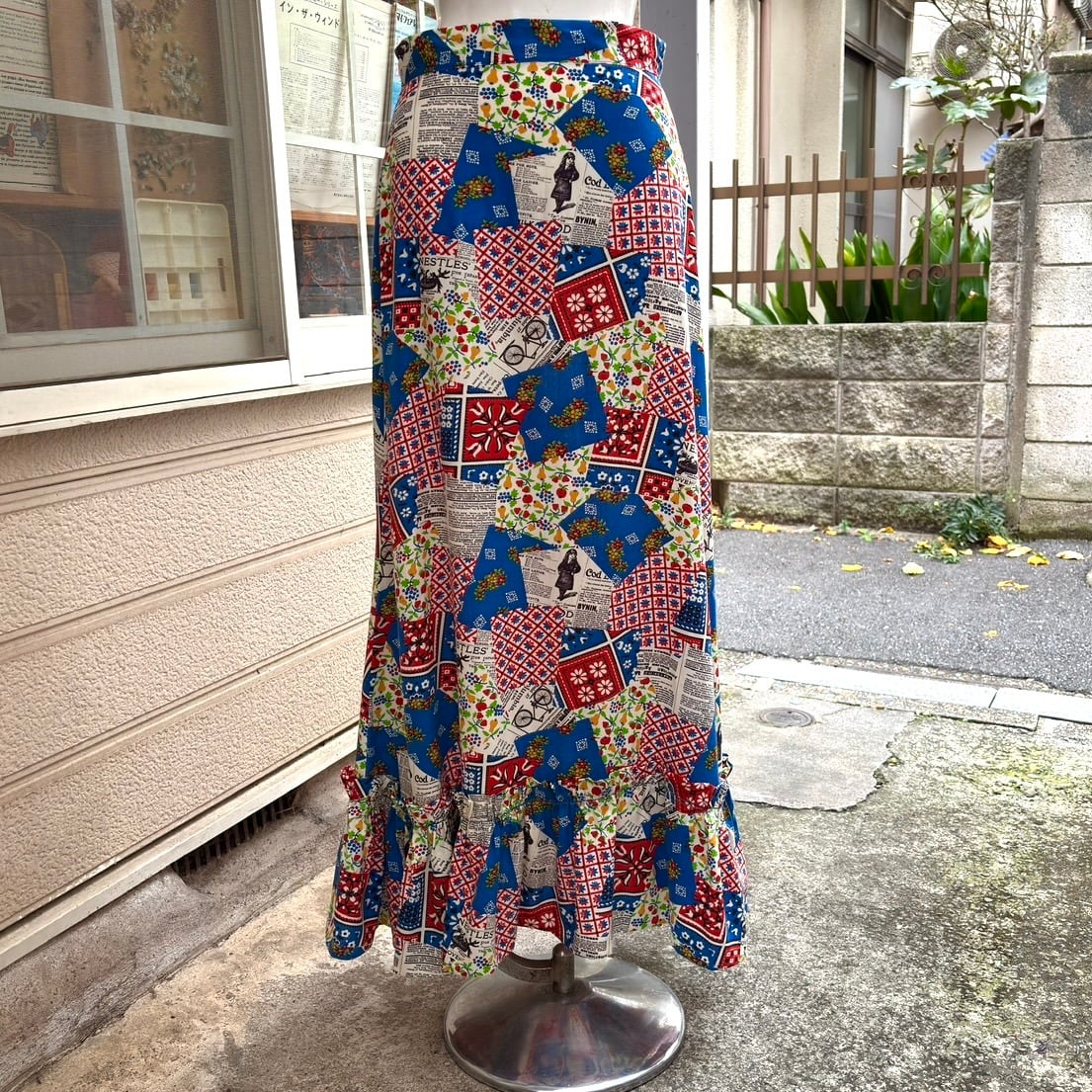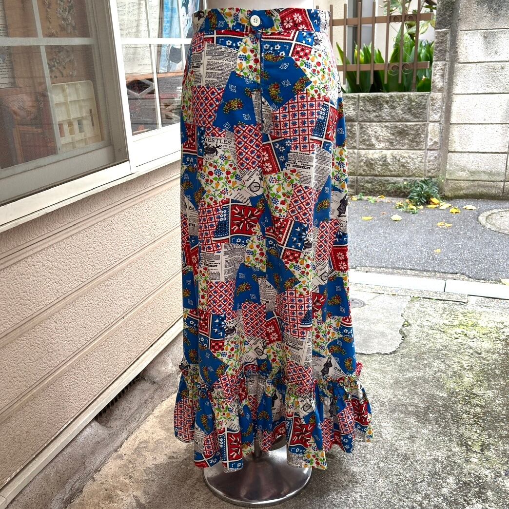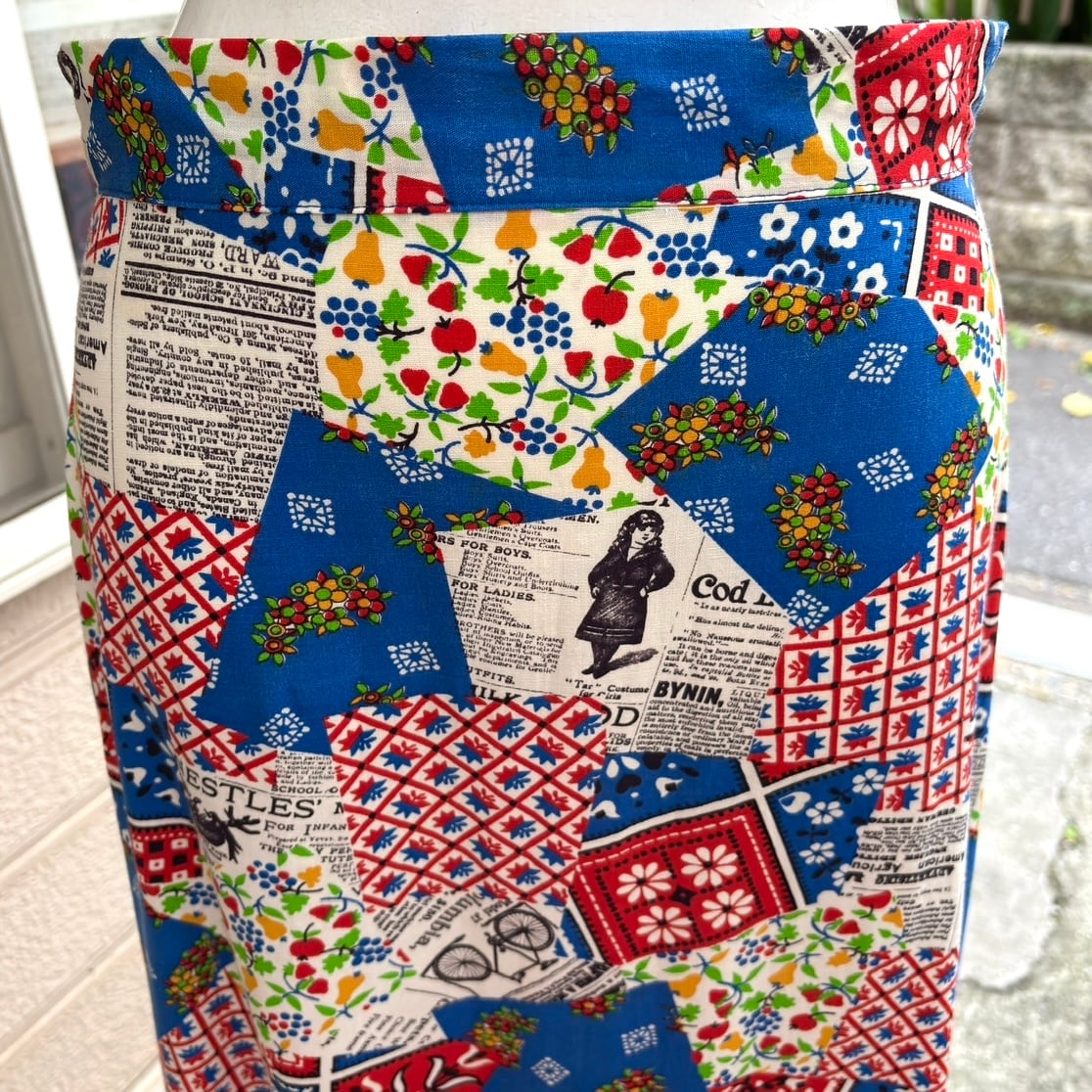 70年代 ヴィンテージ 当時のハンドメイド1点もの フルーツ&フラワー&ニュースペーパー柄 パッチワークプリント ロングスカートです。