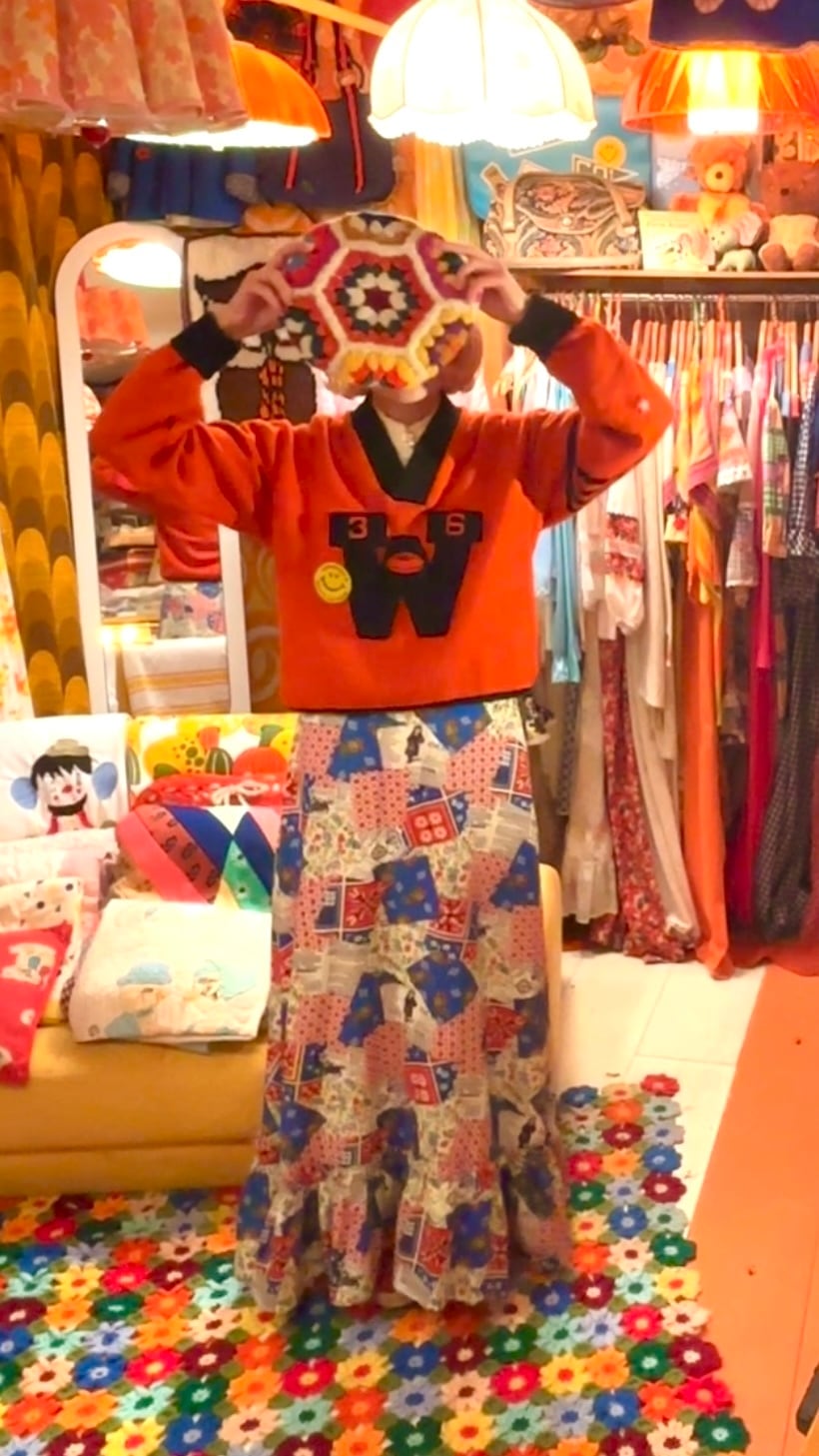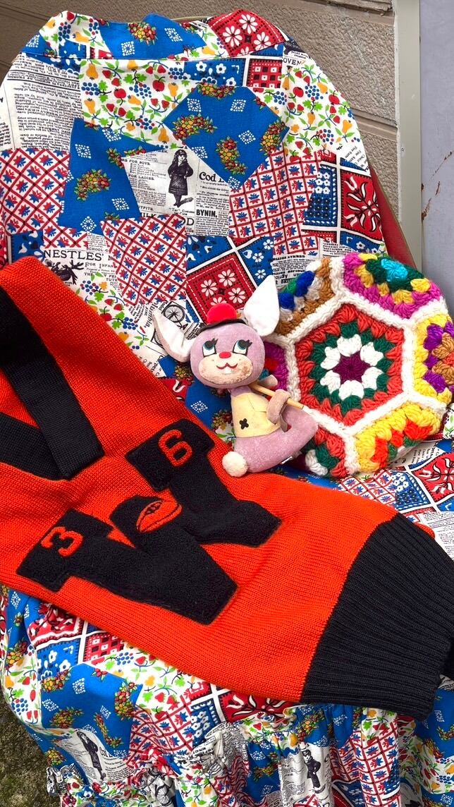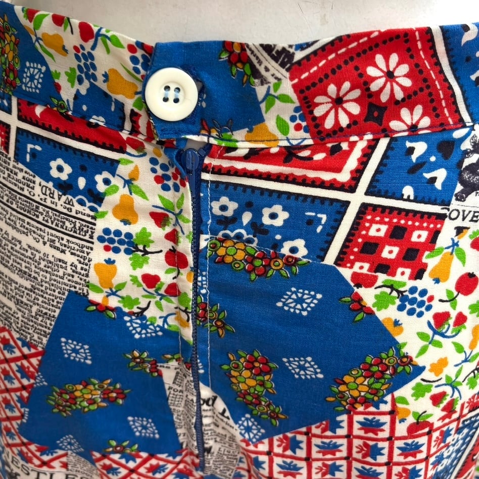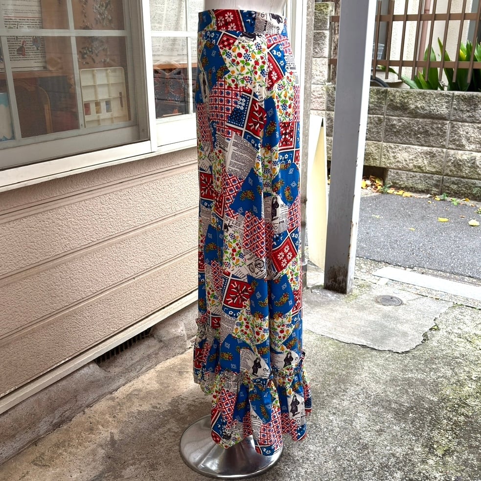 70年代 ヴィンテージ 当時のハンドメイド1点もの フルーツ&フラワー&ニュースペーパー柄 パッチワークプリント ロングスカートです。
