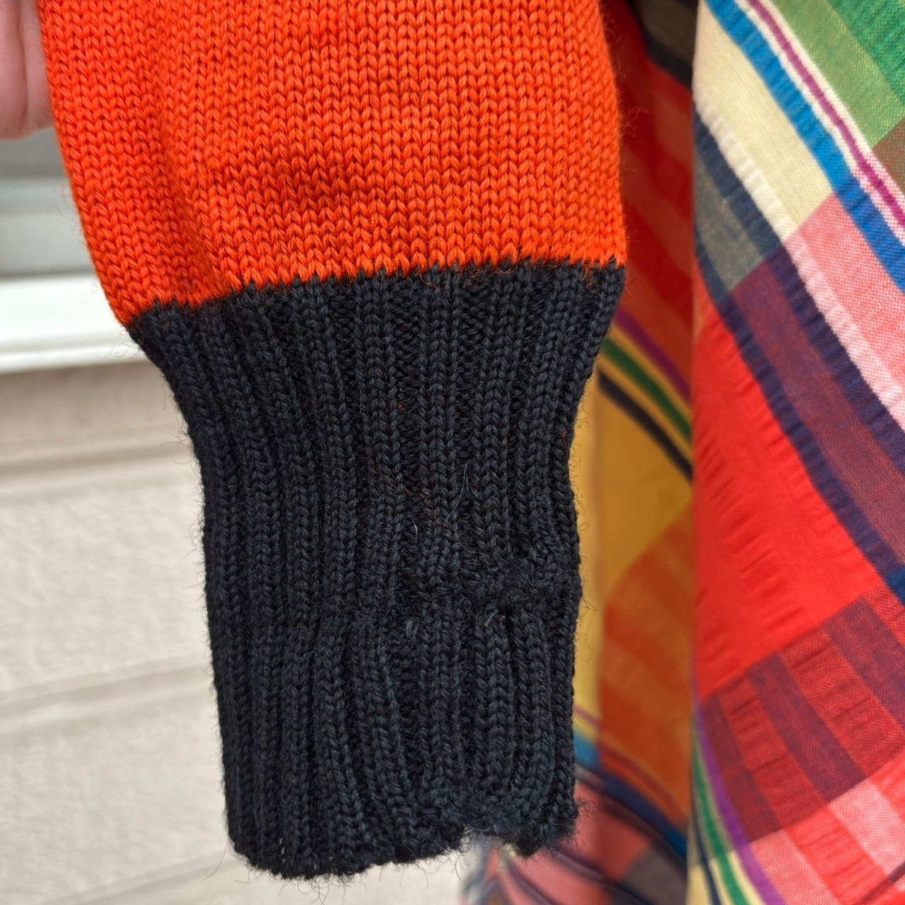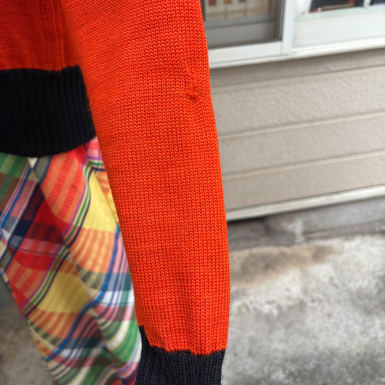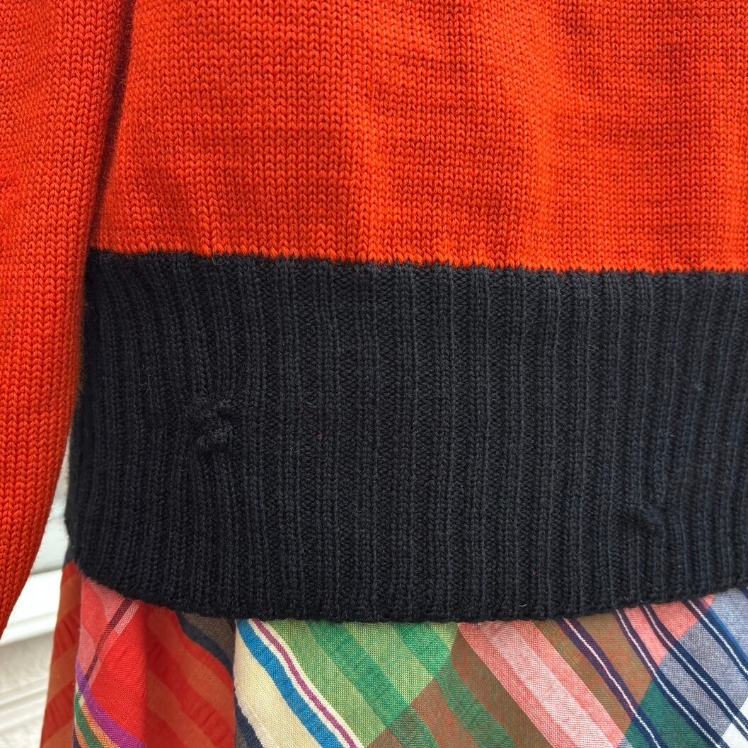 経年による袖口、裾のリブのほつれのリペア、右袖と肩の縫い目の背面側にほつれのリペア、