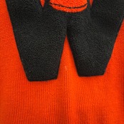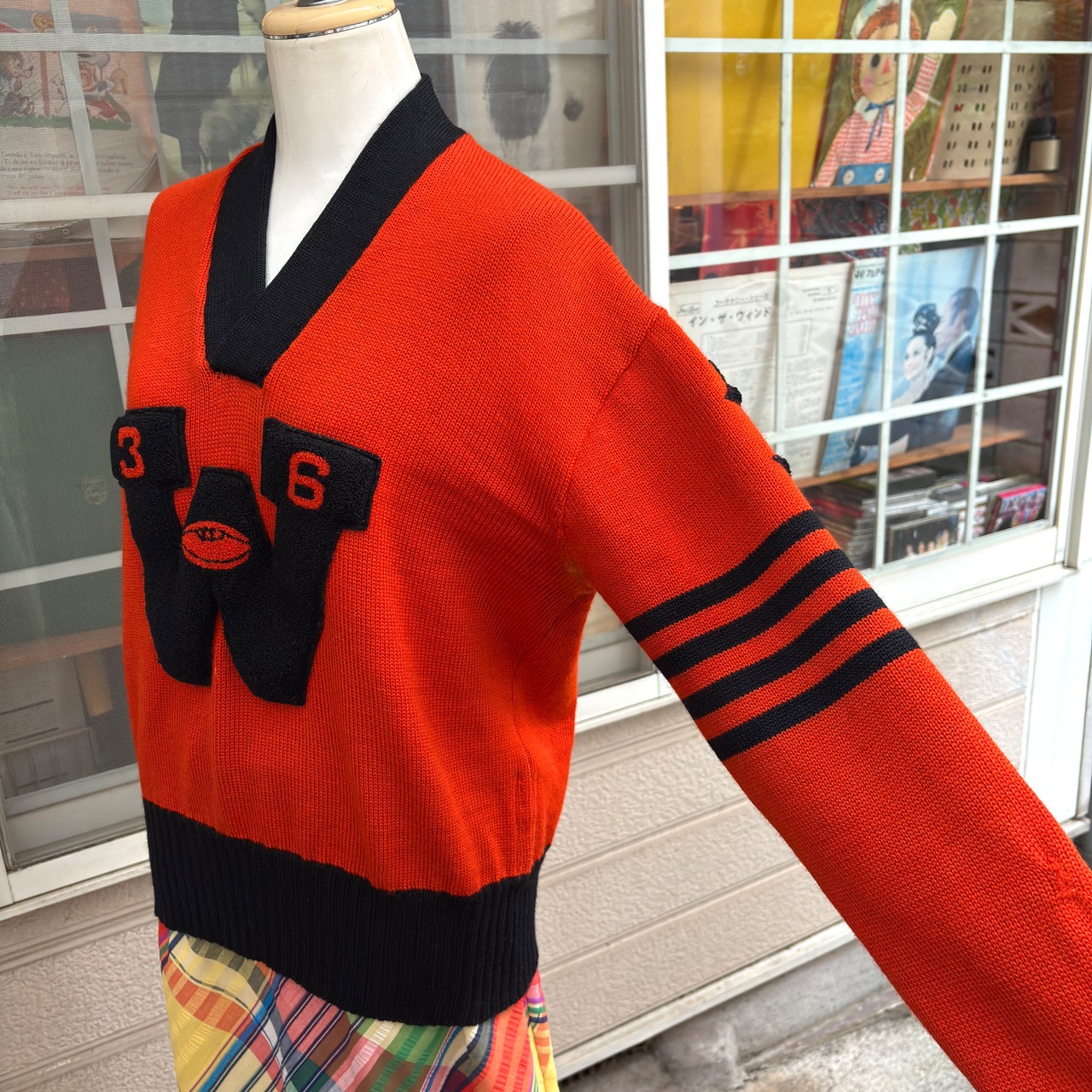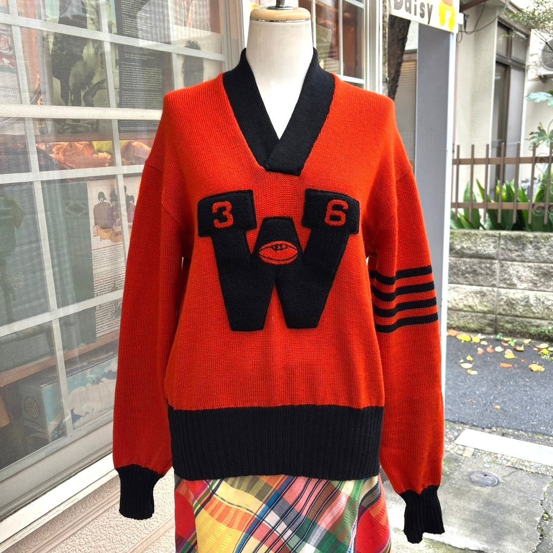 こっくりとしたオレンジカラーとブラックのカラーリングやラグビーボールモチーフやナンバーの入ったWのビッグなレタードワッペンがとっても可愛い1着です。
