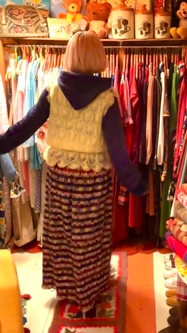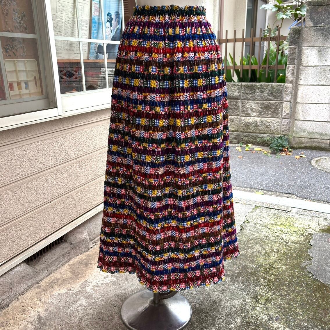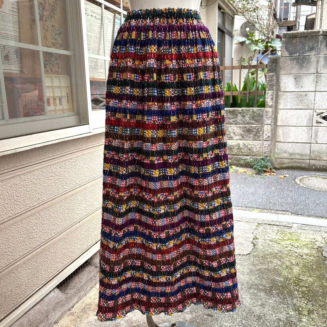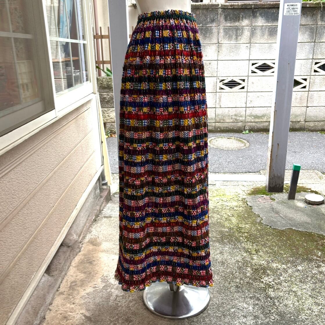 70'S USA Vintage knitting line&patchwork shirring long skirt。