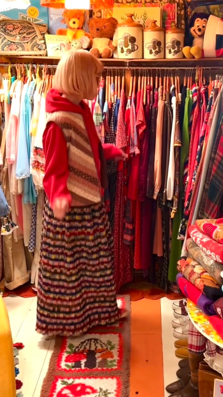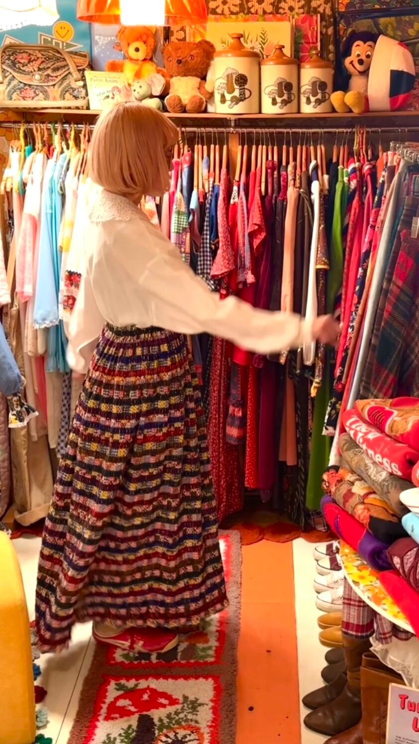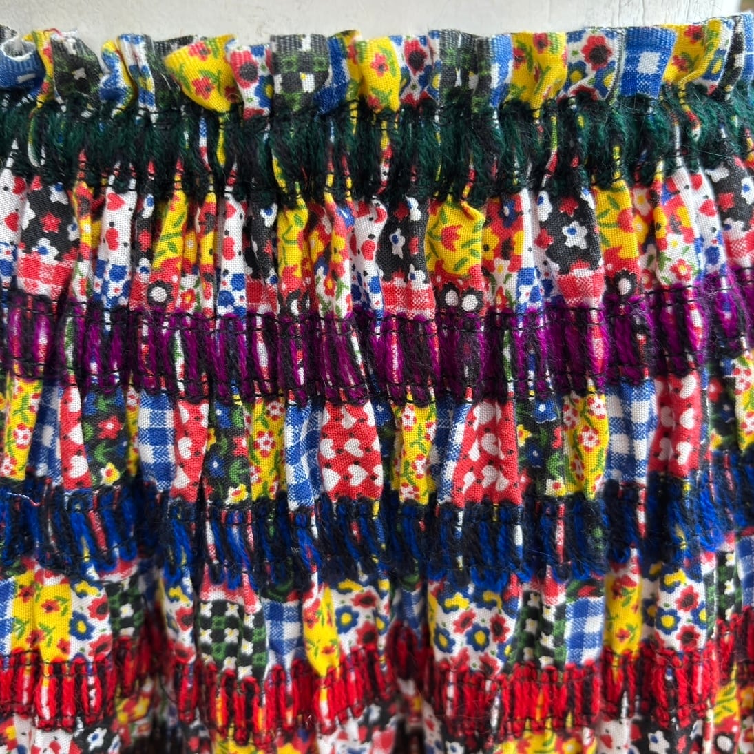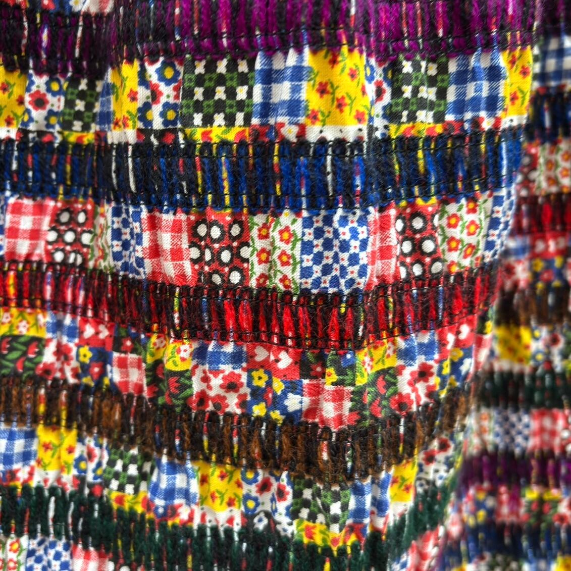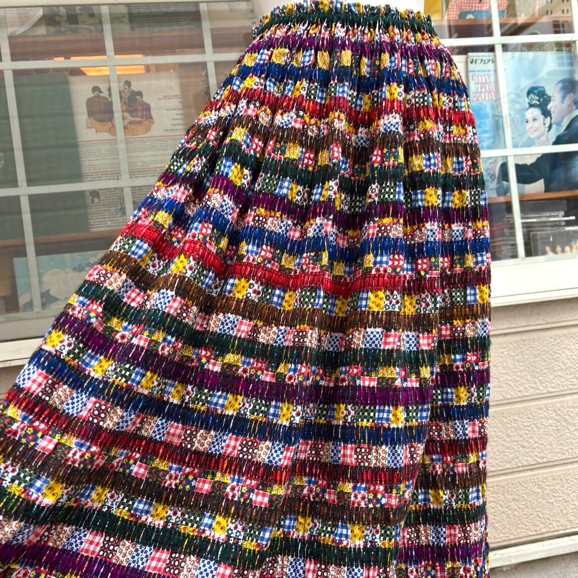 70年代 ヴィンテージ 当時のハンドメイド1点もの ニットライン&パッチワーク柄 シャーリング ロングスカートです。
