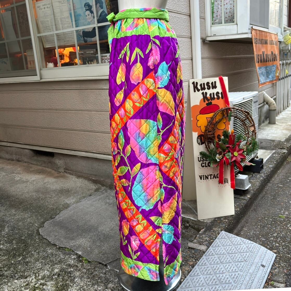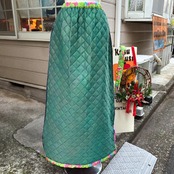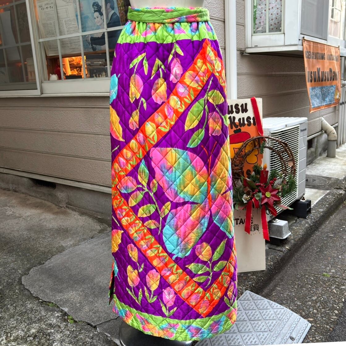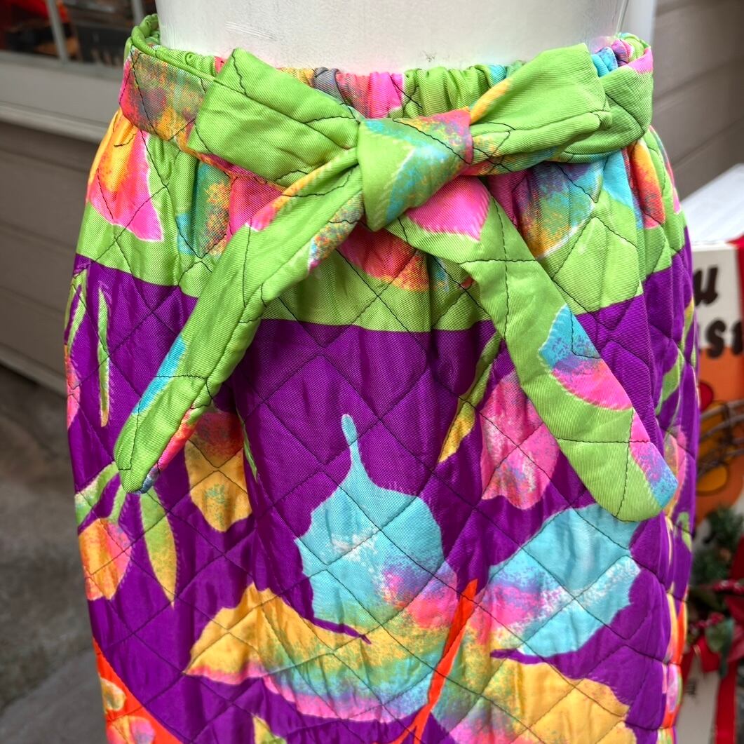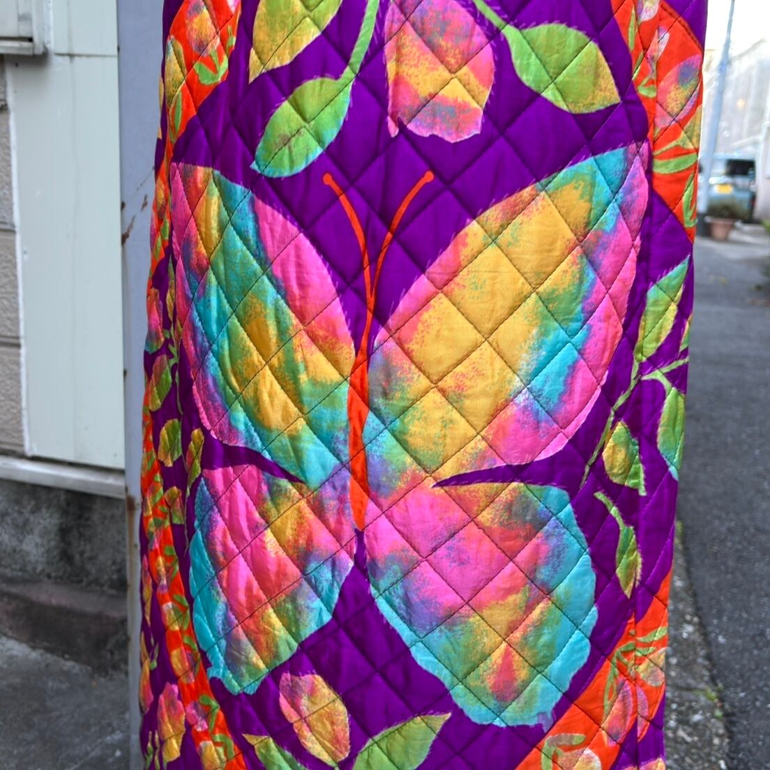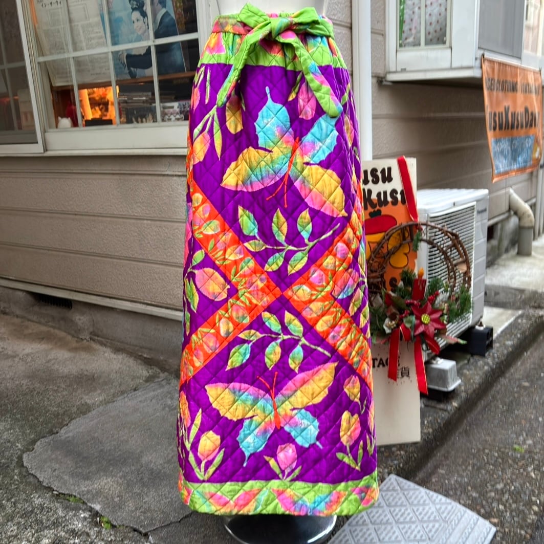 70年代 ヴィンテージ 当時のハンドメイド1点もの チューリップ&バタフライ サテン キルティングロングスカートです。