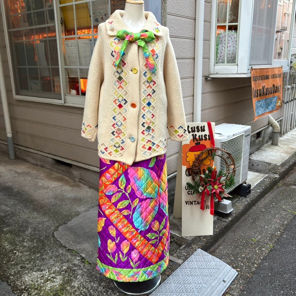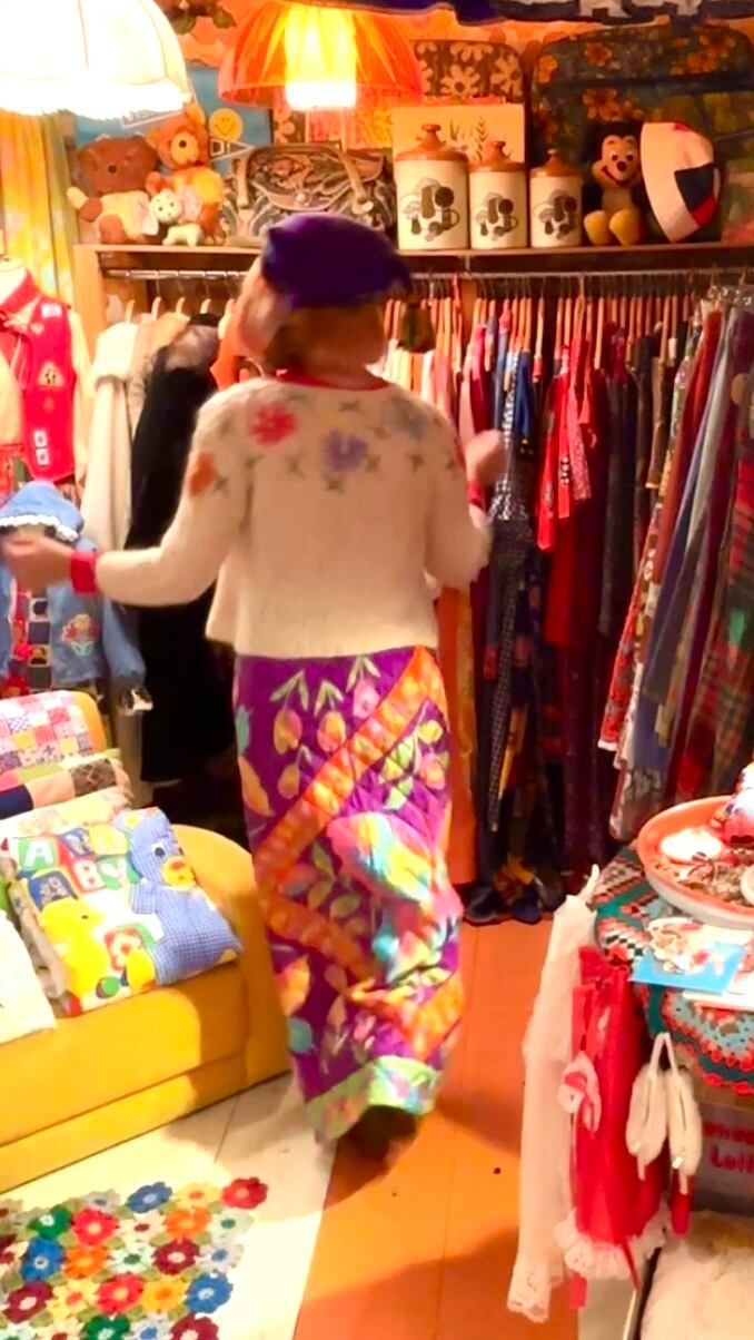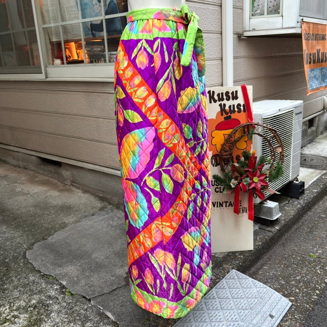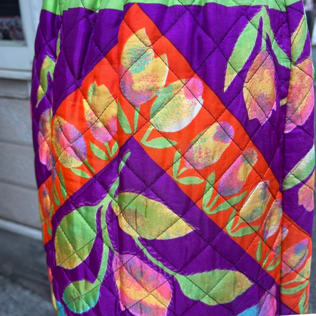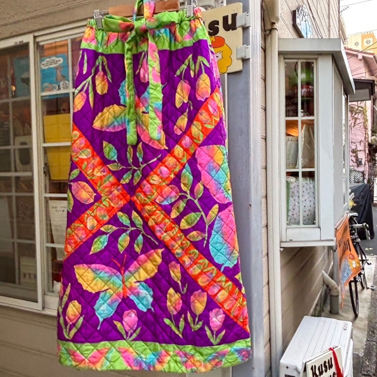70年代 ヴィンテージ 当時のハンドメイド1点もの チューリップ&バタフライ サテン キルティングロングスカートです。