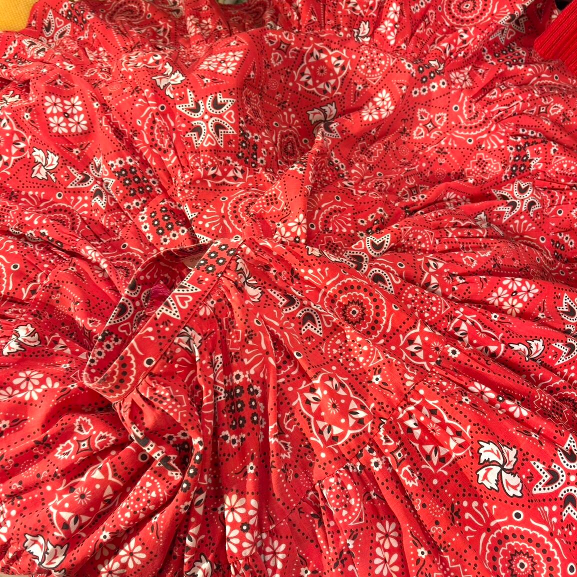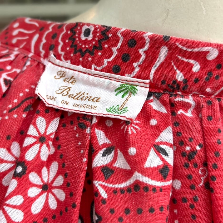 朱色よりのレッドカラーにホワイト、ブラックのバンダナ柄がとっても可愛い1着です。