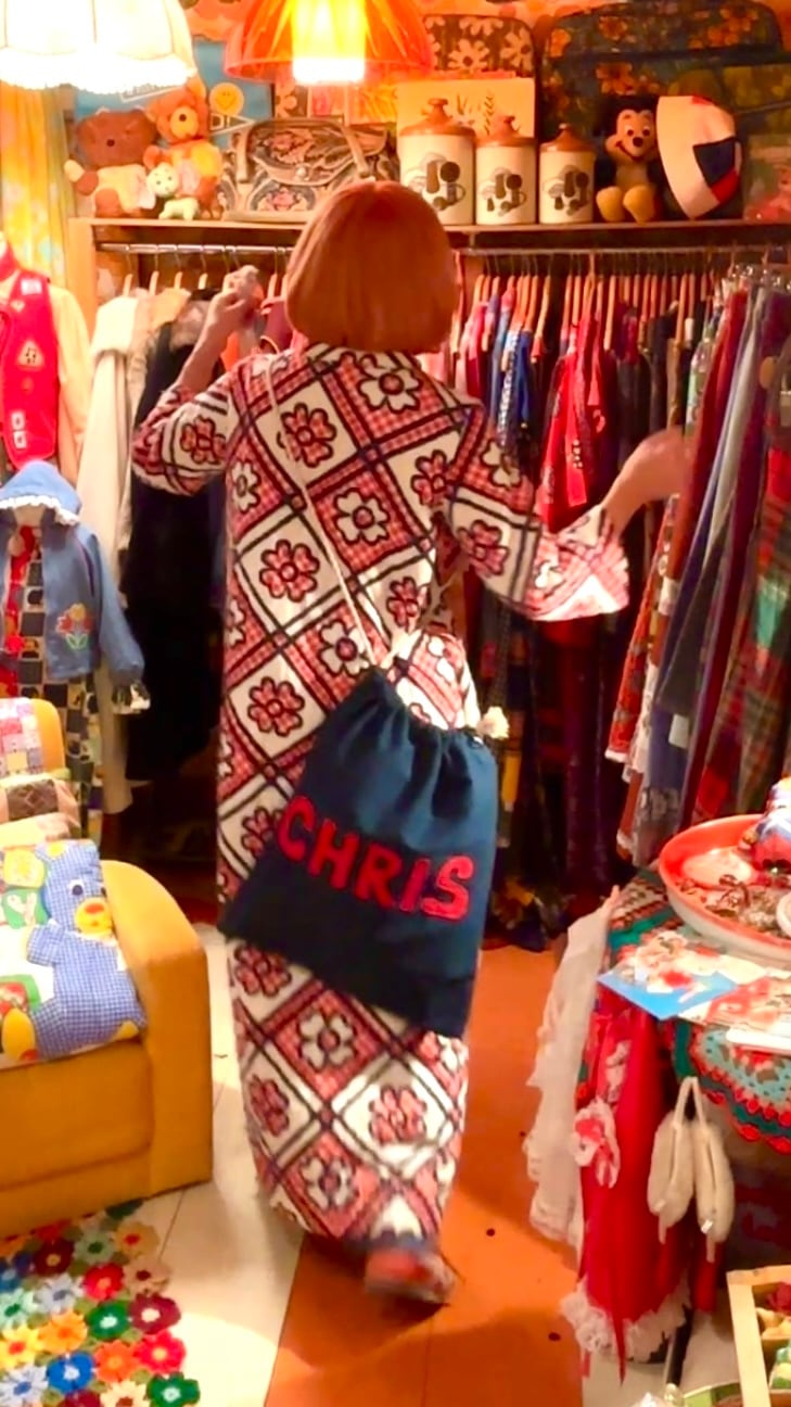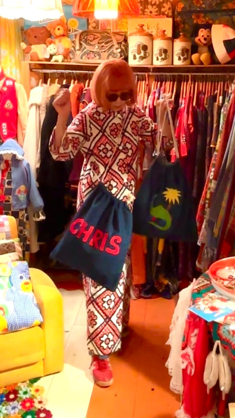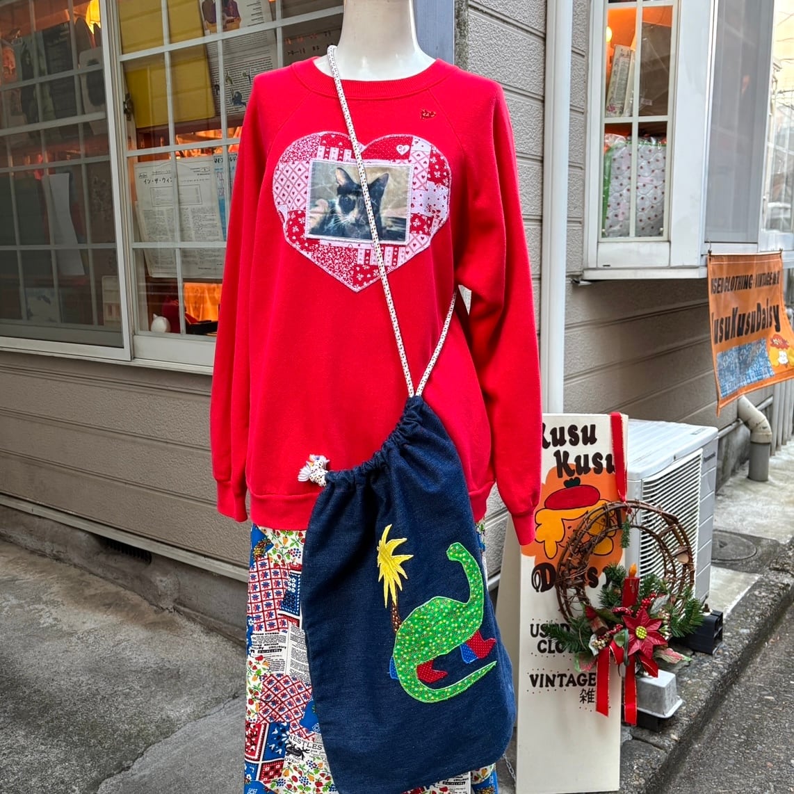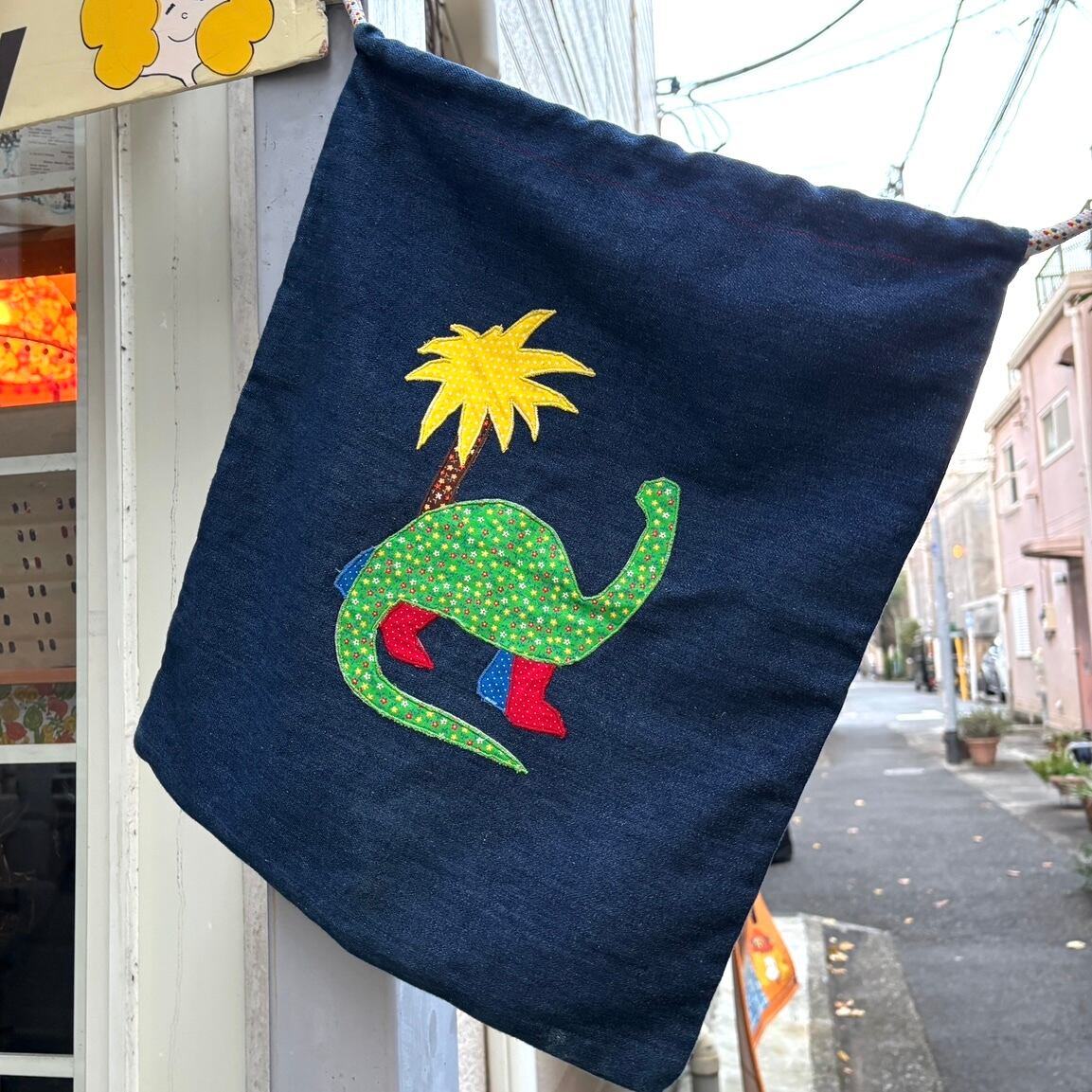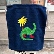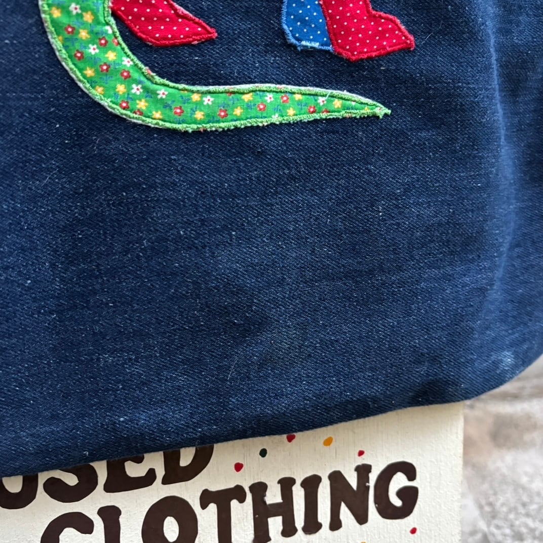ヴィンテージ ならではな風合いのあるデニム生地に片面は恐竜や椰子の木のパッチワーク、もう片面はネームのパッチワークがとっても可愛いアイテムです。