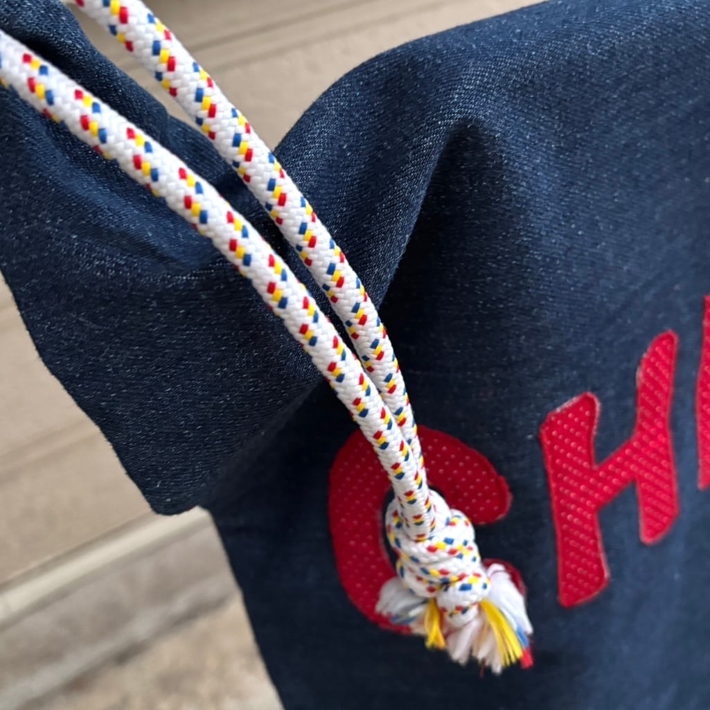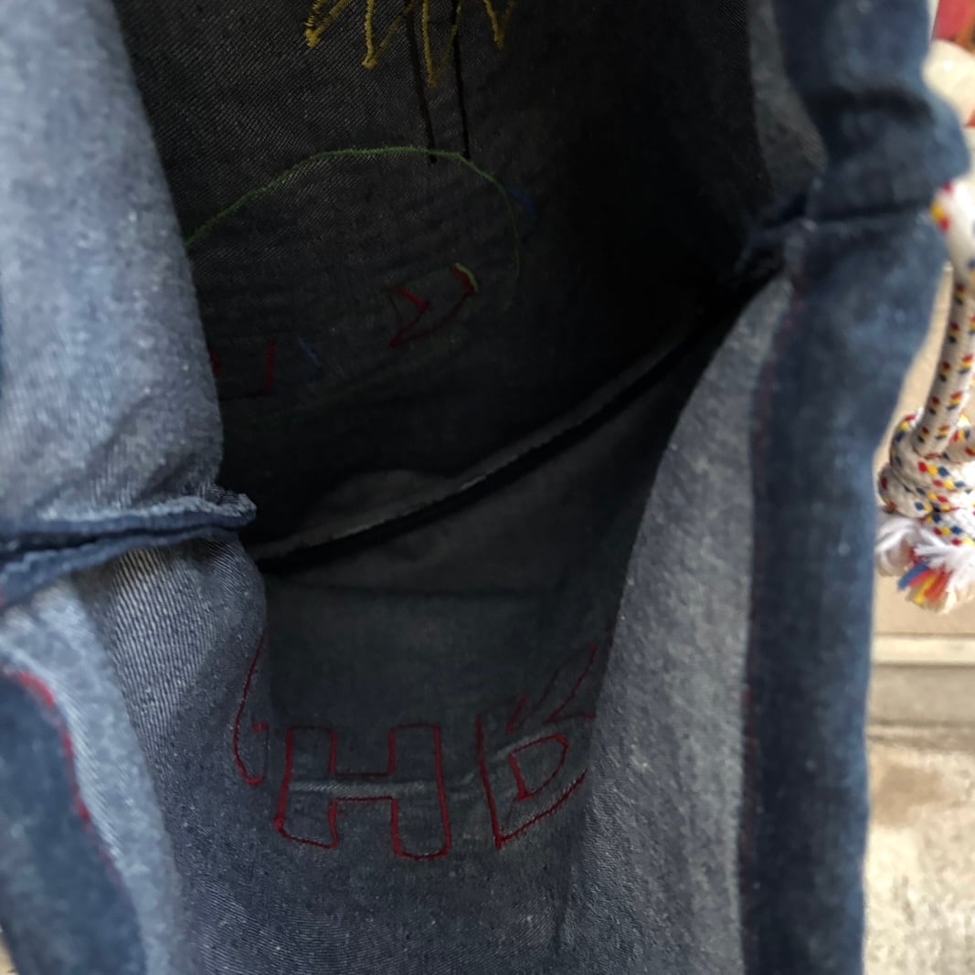 ロープ紐の通っている部分や下の方にデニム生地の色むら、パッチワークの縫い目に若干の経年感が見られますが、ヴィンテージ のあじとして捉えて頂けたらと思います。