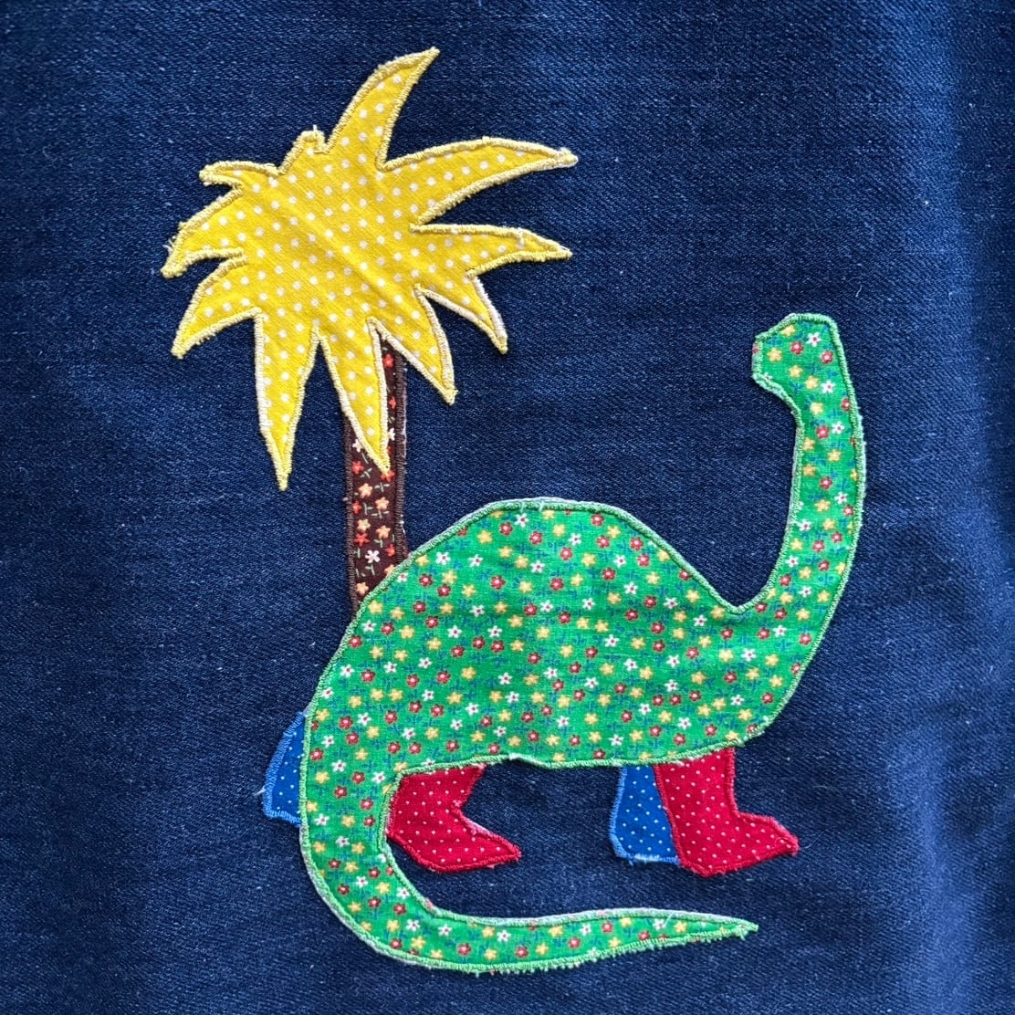 ネームのパッチワークのピンドットの生地やフォント、恐竜や椰子の木のパッチワークのピンドットやフラワー柄の生地も可愛いポイントです。