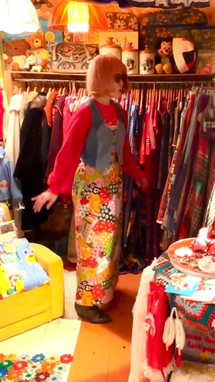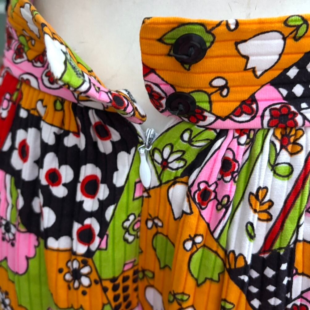 ライトオレンジ、ライトグリーン、ピンク、レッド、ブラック、ホワイトのカラフルでハッピーなカラーリングやポップなフラワー模様のパッチワークプリントがハッピーでとっても可愛い1着です。
