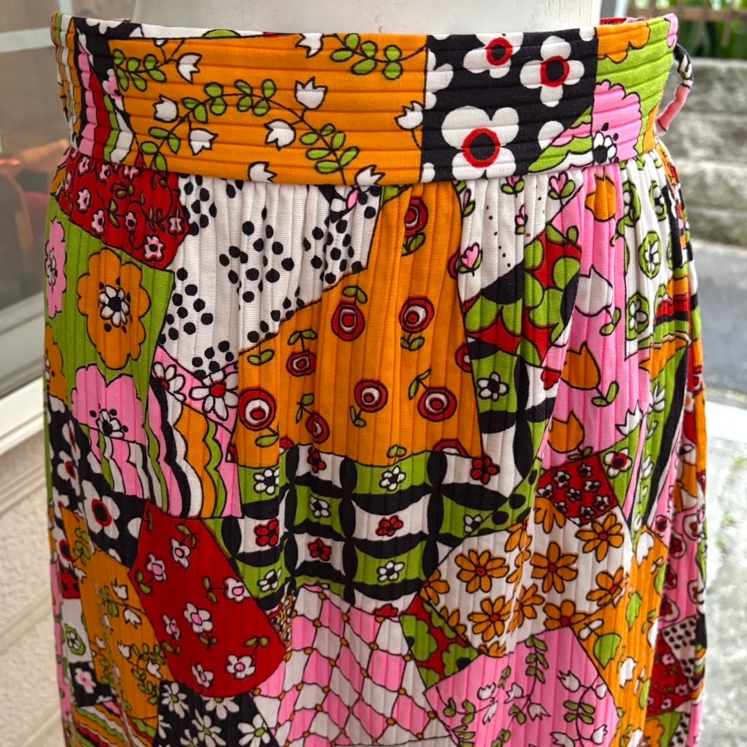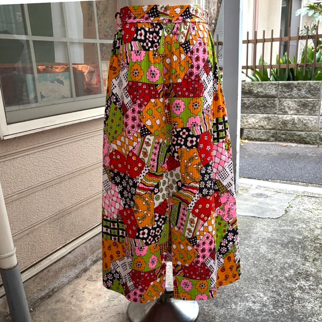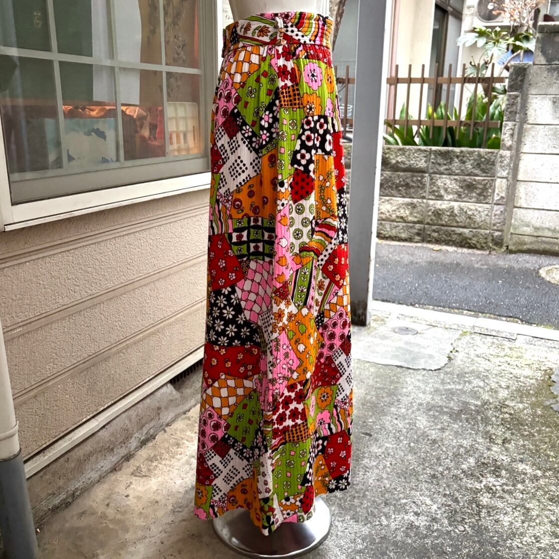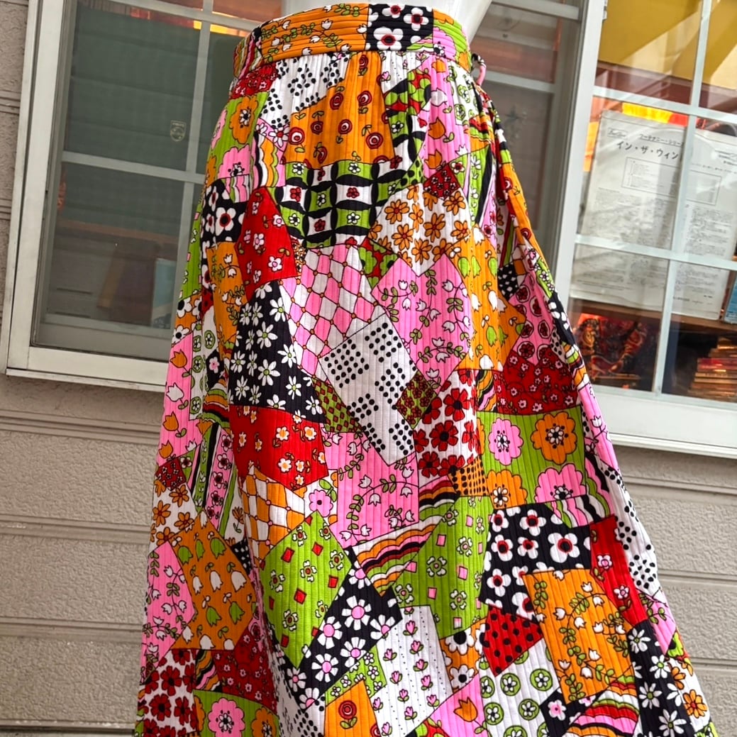 70年代ヴィンテージ クレイジーパターン フラワー柄パッチワークプリント ロングスカートです。