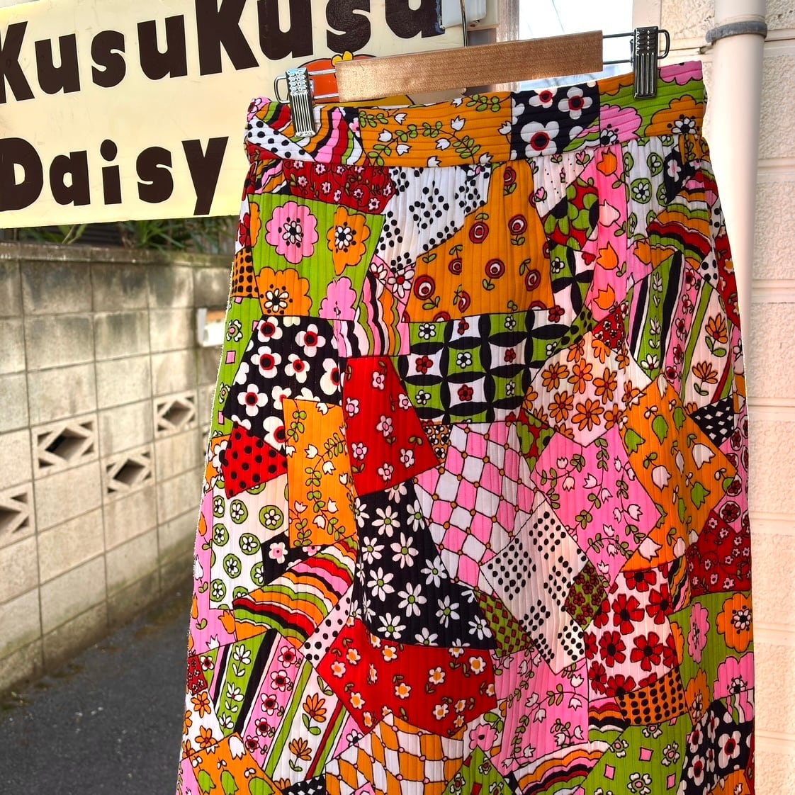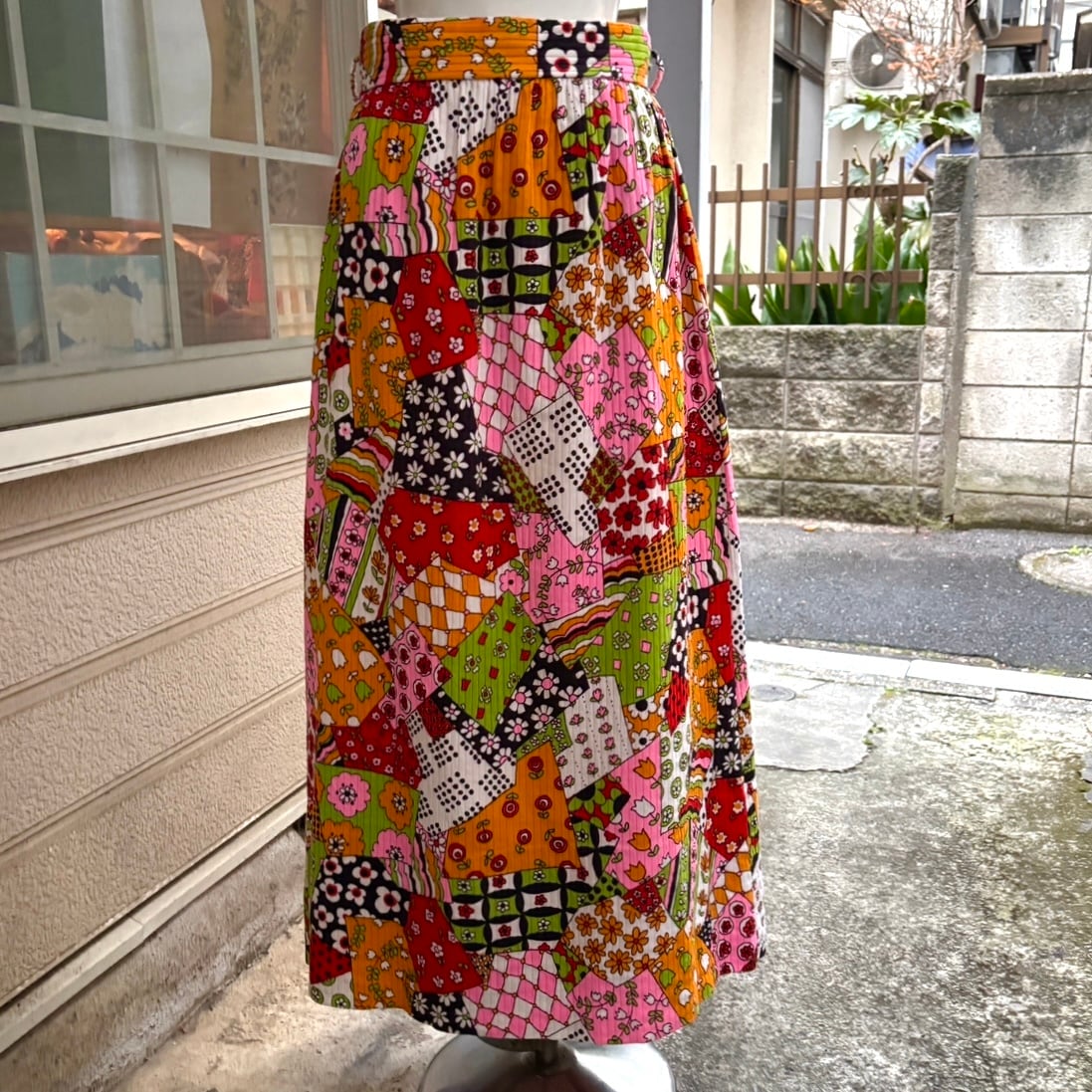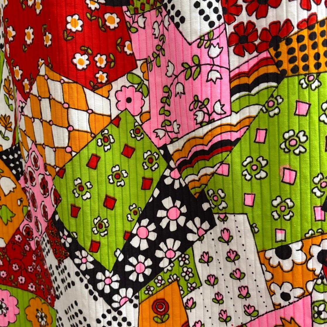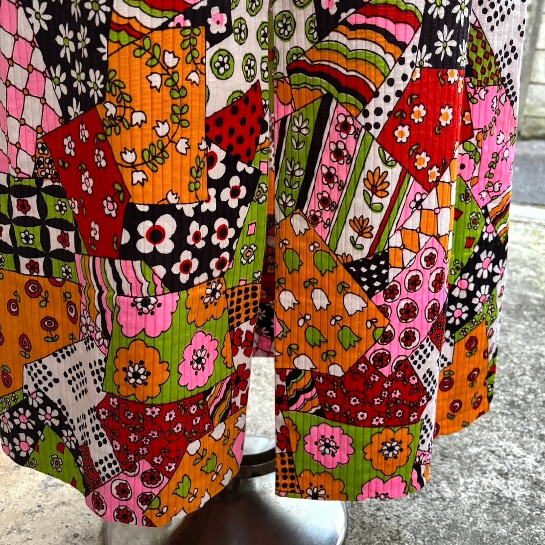 70年代ヴィンテージ クレイジーパターン フラワー柄パッチワークプリント ロングスカートです。