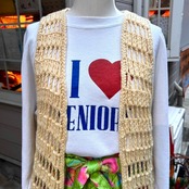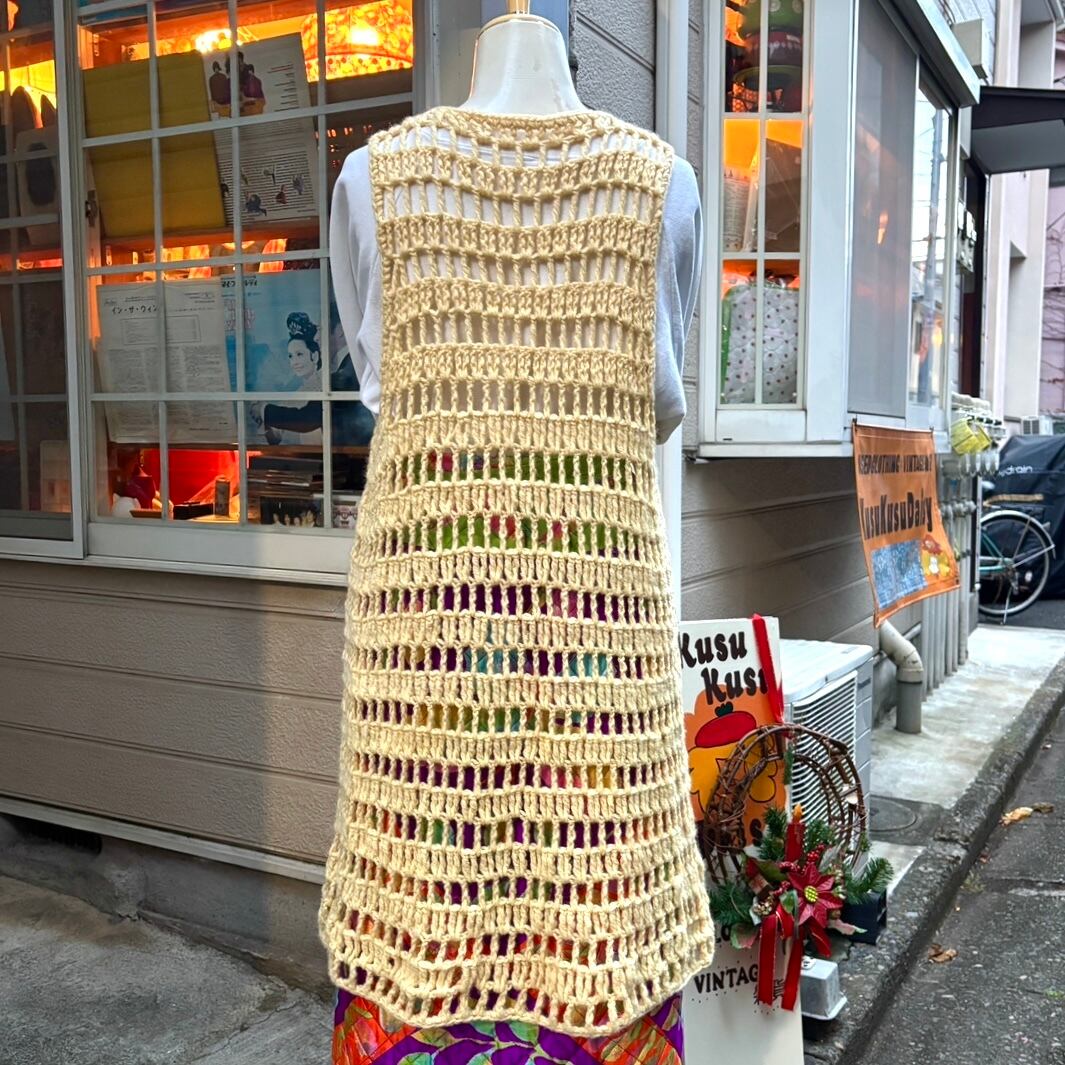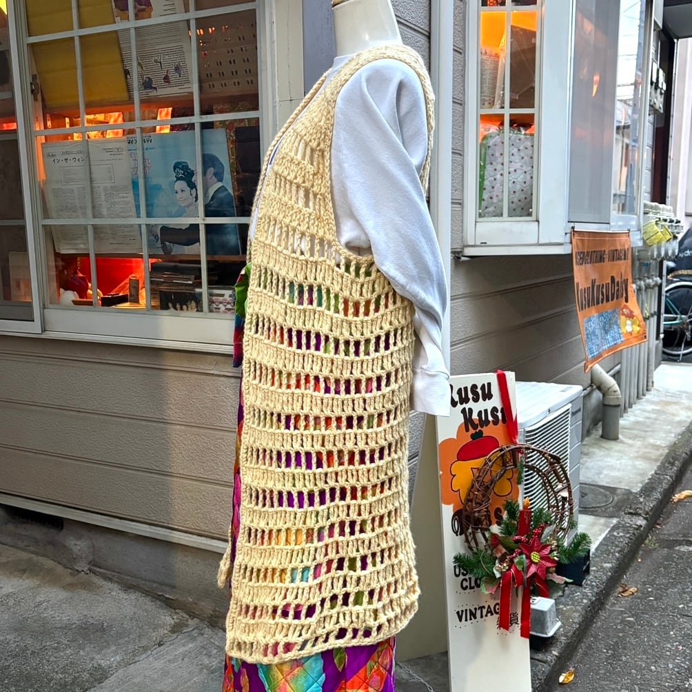 70年代 ヴィンテージ ライトイエロー クロシェ ニット ロングベストです。