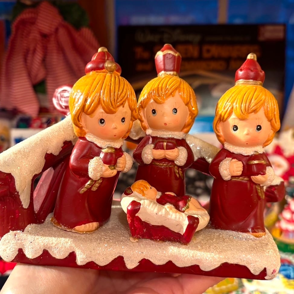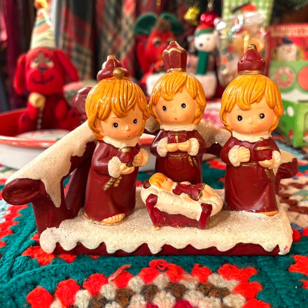 キリストの誕生の際の3人の博士が「黄金」「乳香」「没薬」の3つの贈り物を捧げ礼拝したとされるお話しをモチーフにした置物で、それぞれ違う帽子をかぶって贈り物を持ったポーズやつぶらな表情がとっても可愛いアイテムです。