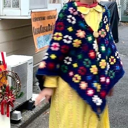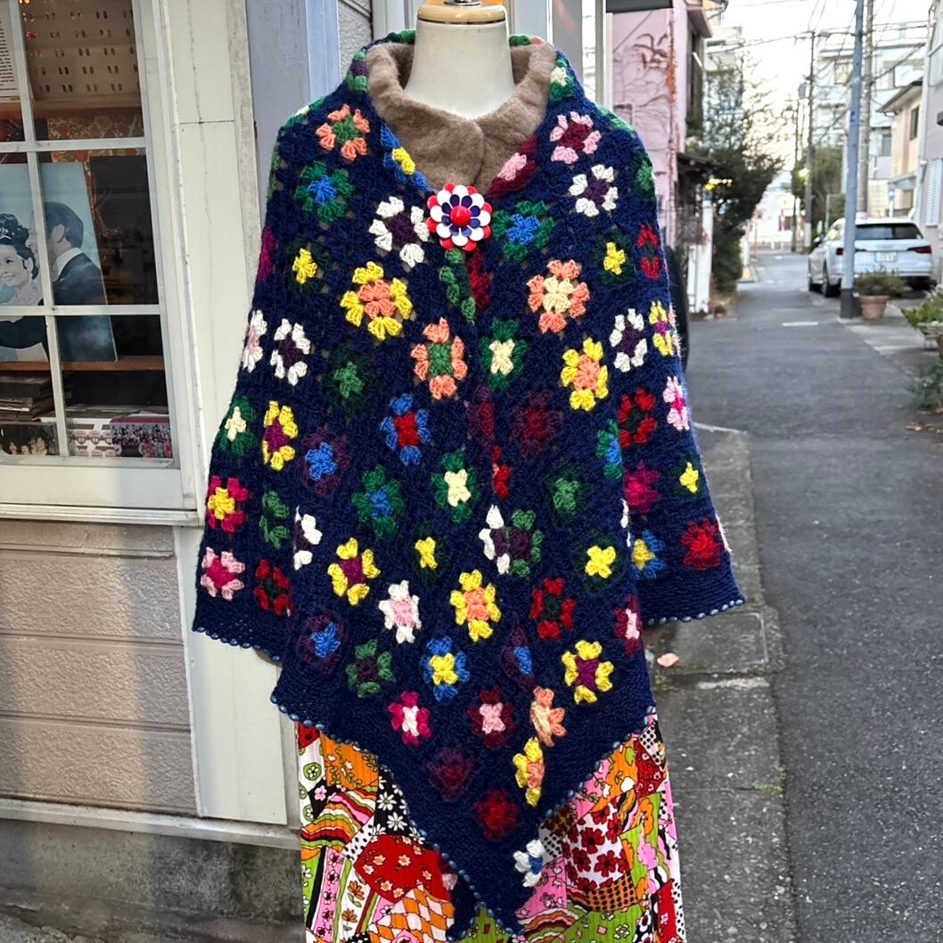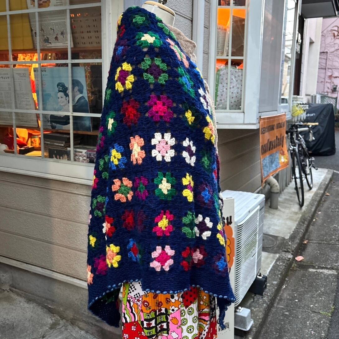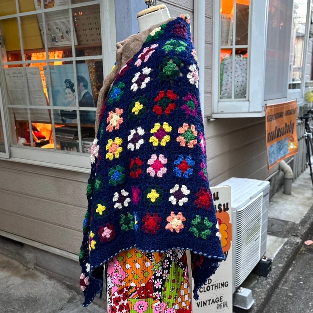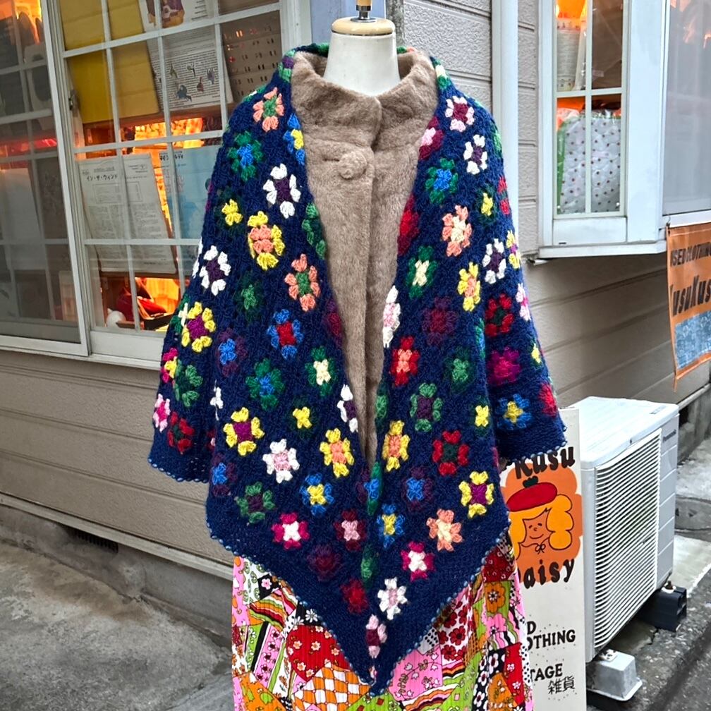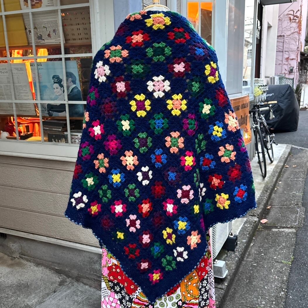 70年代から80年代 ヴィンテージ 当時のハンドメイド1点もの グラニースクエア フラワーモチーフ ビーズデコレーション ニットショールです。