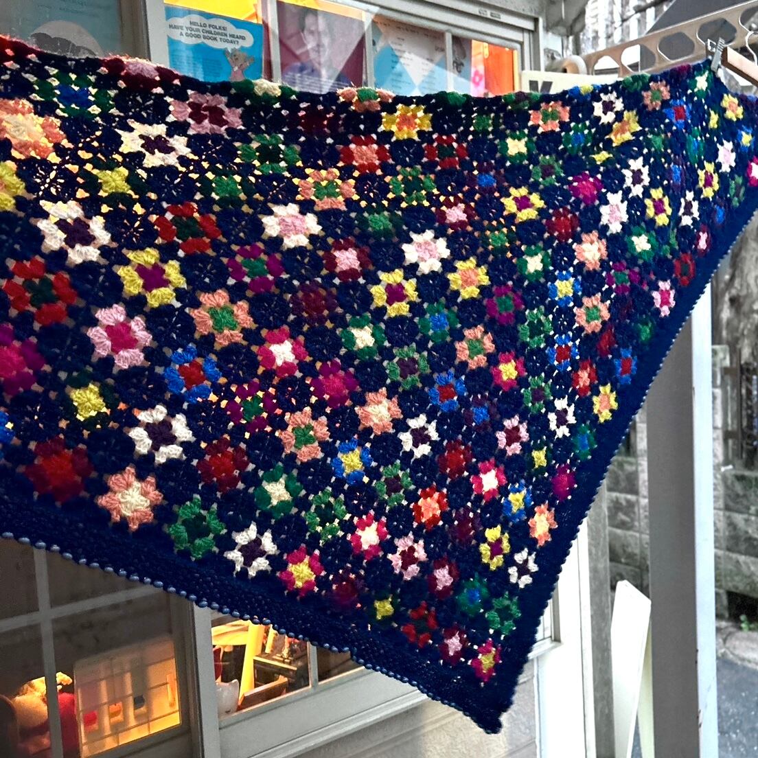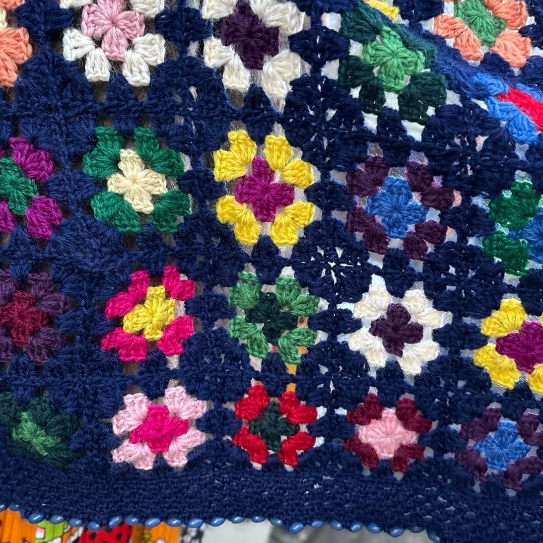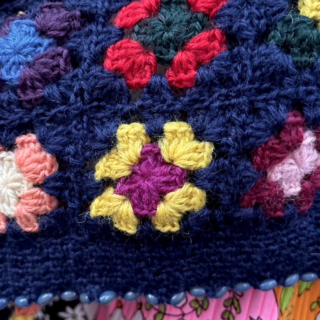 ブラックに近いネイビーベースにカラフルなフラワーモチーフのグラニースクエアがとっても可愛いアイテムです。