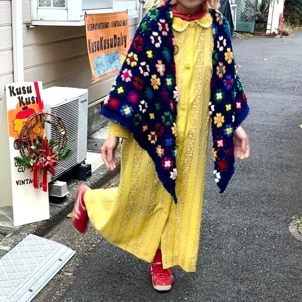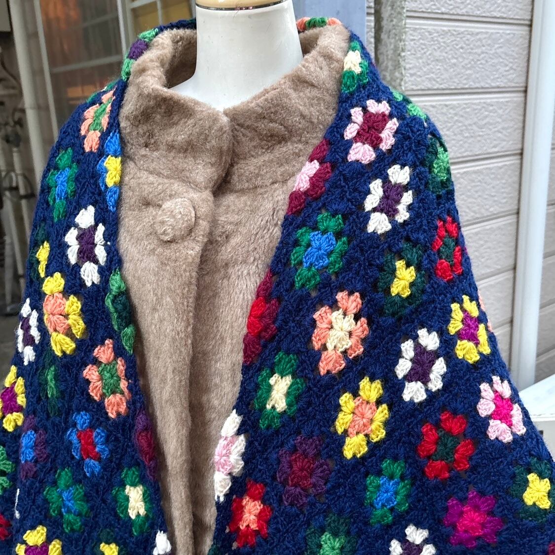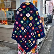 70'S〜80'S USA Vintage Granny Square flower motif bead decoration knit shawl。