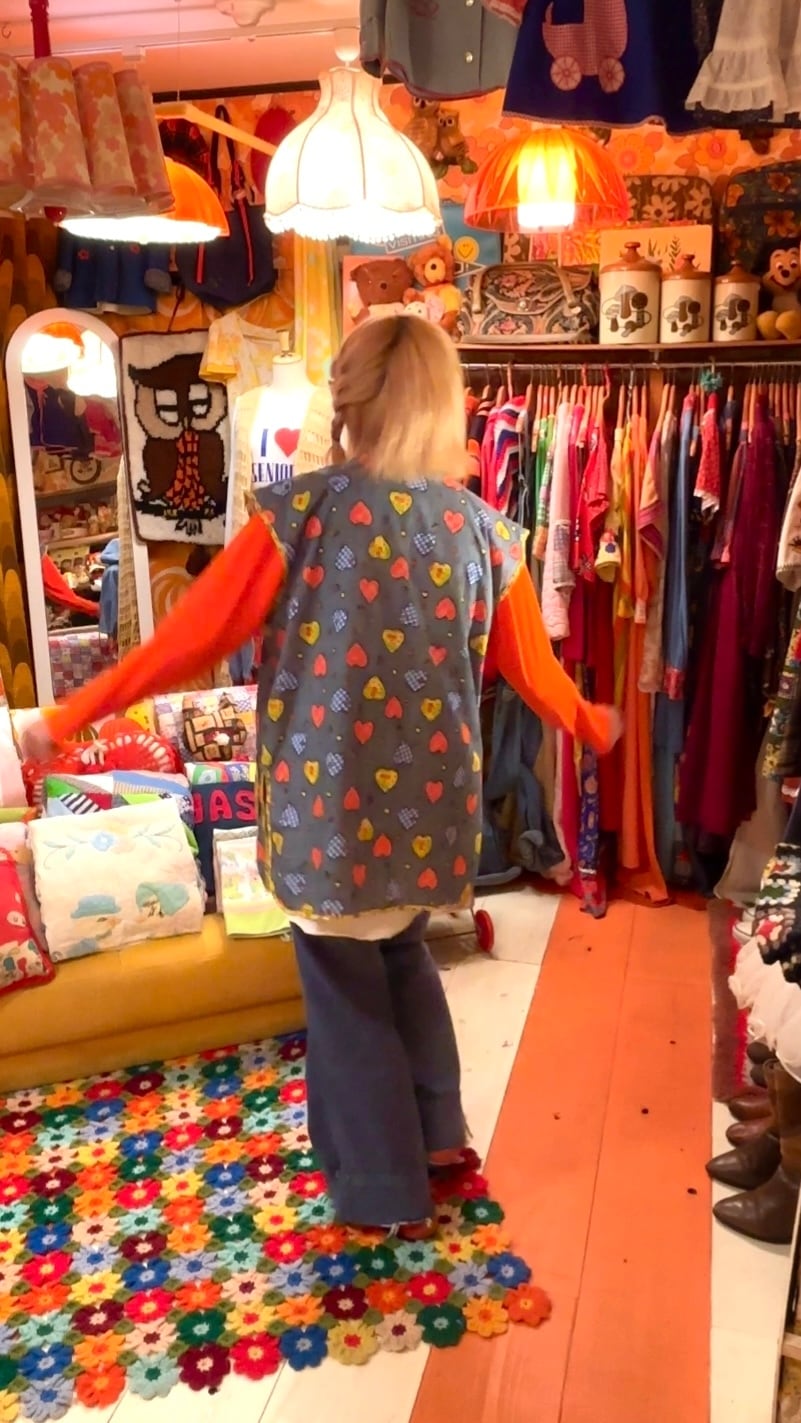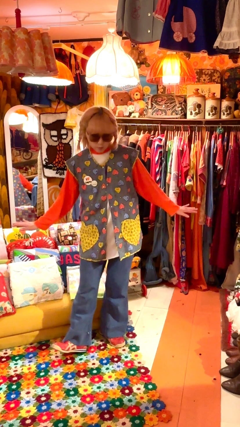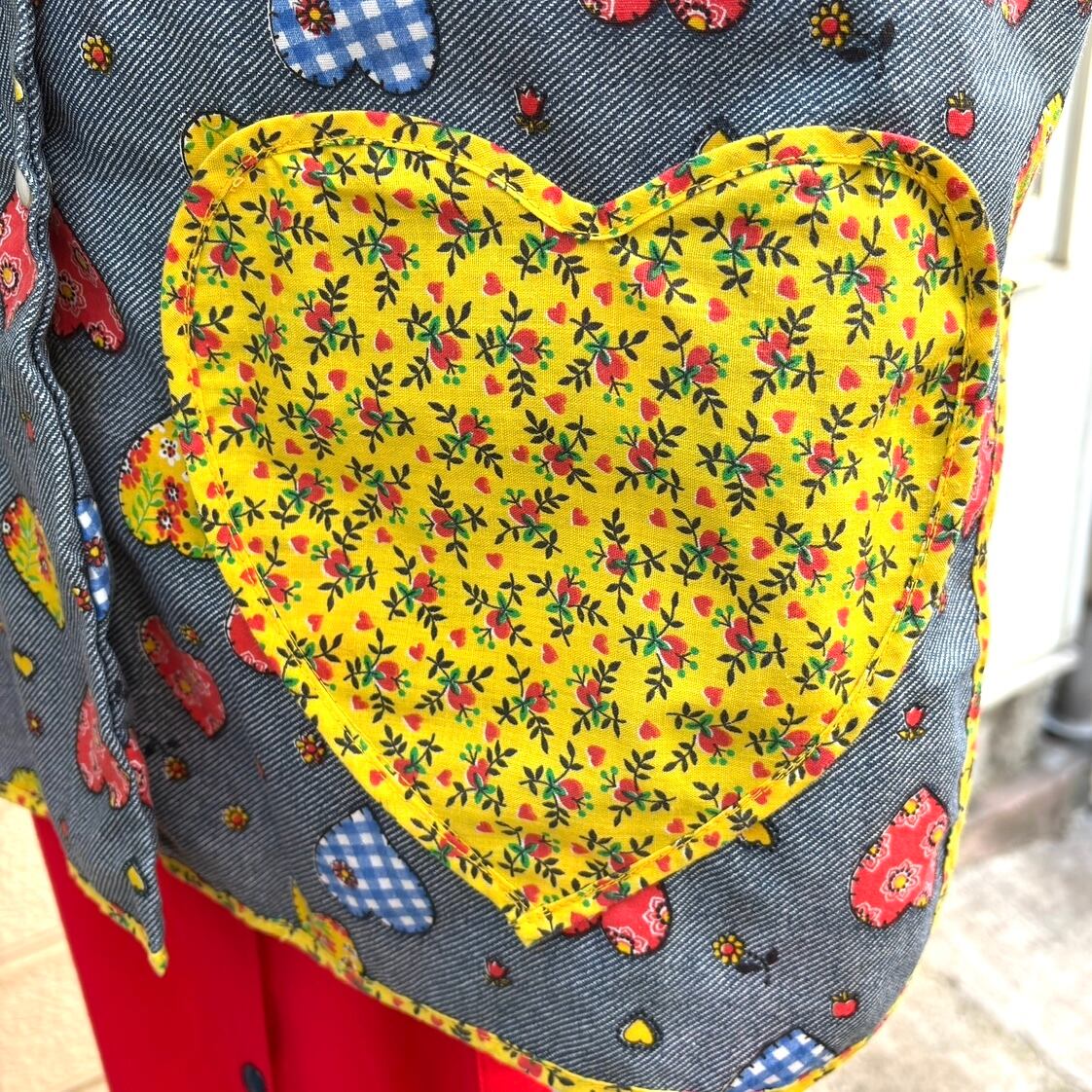 デニム柄ベースにバンダナやフラワー、ギンガムチェックのハートのパッチ模様や小さなリンゴやチューリップ、ハートやフラワーのプリント、ハートのポケットが70年代ならではな とっても可愛い1着です。