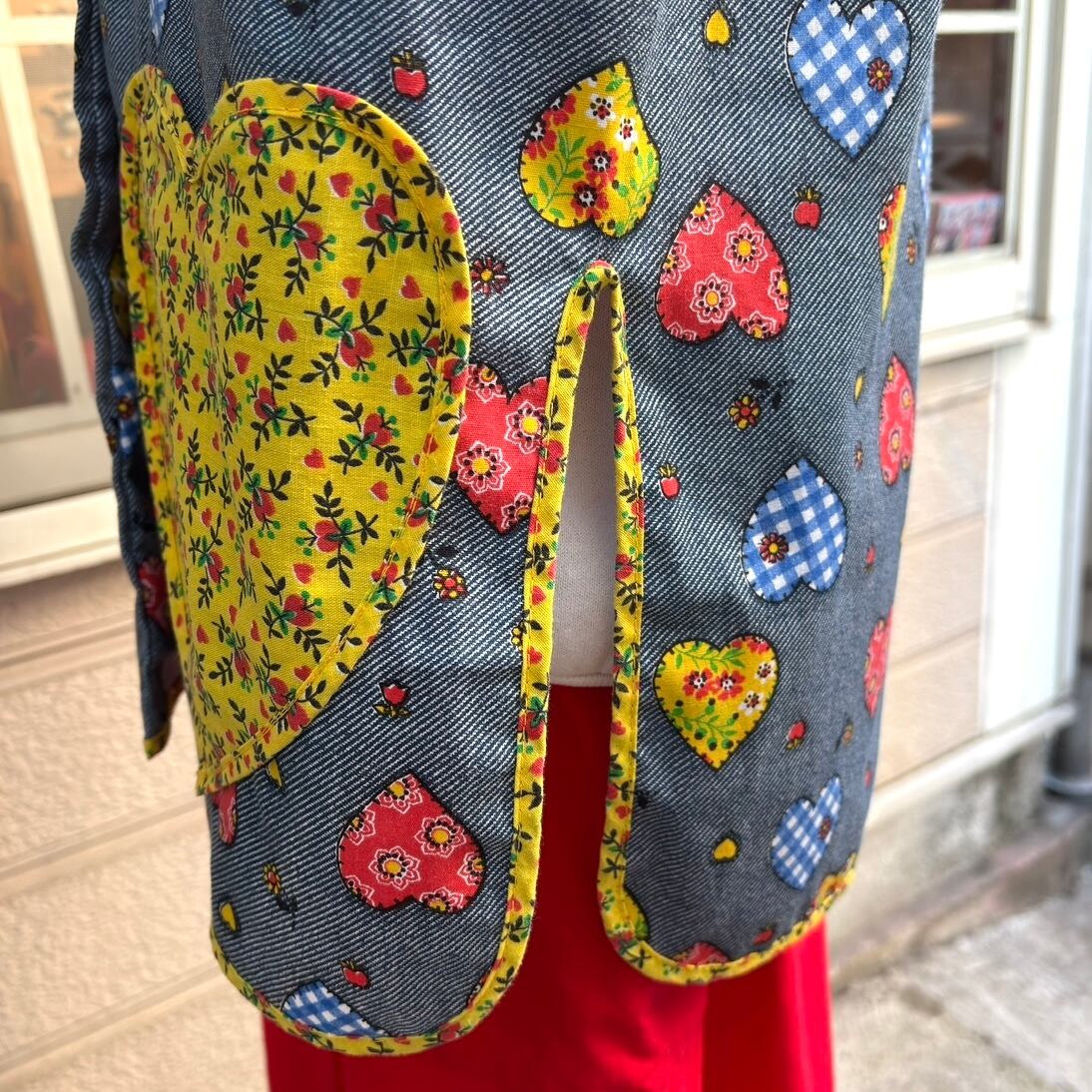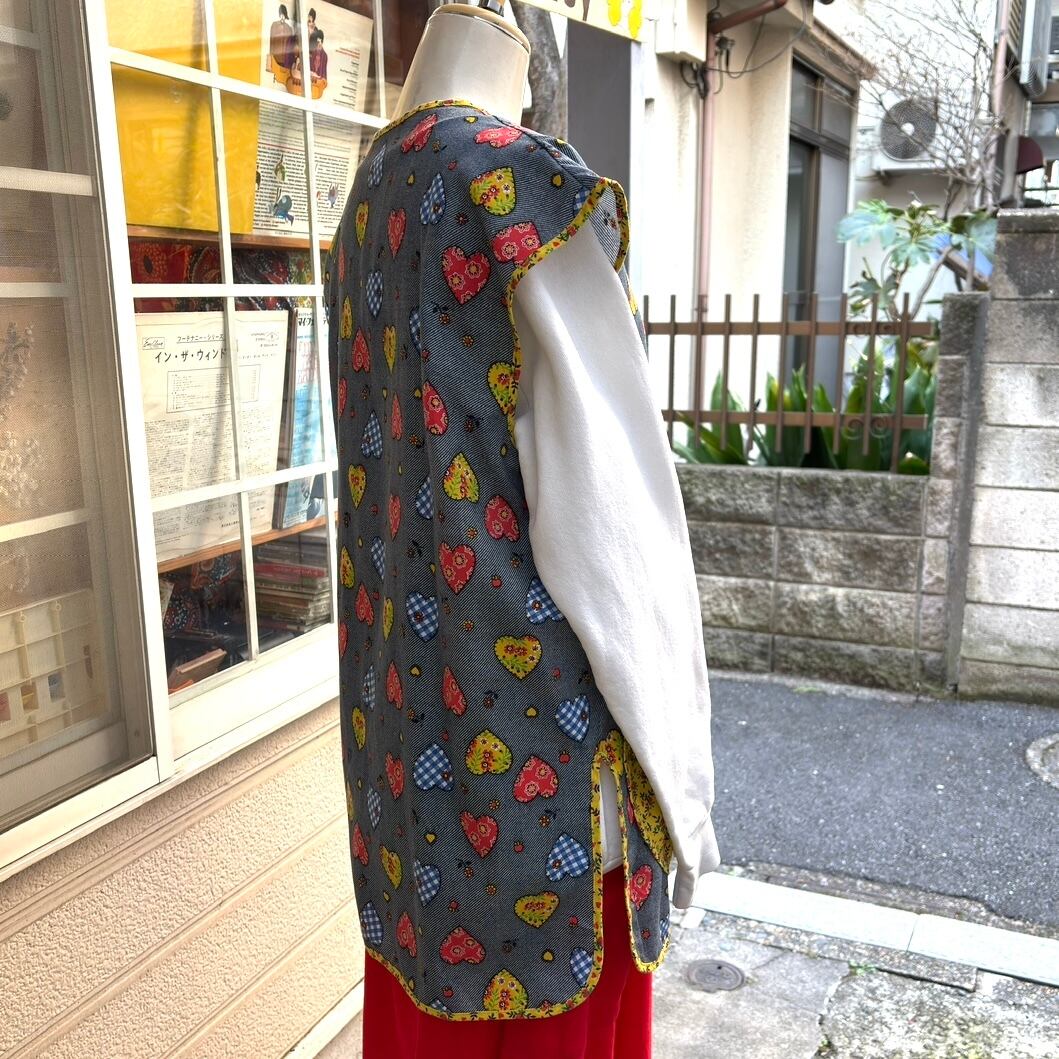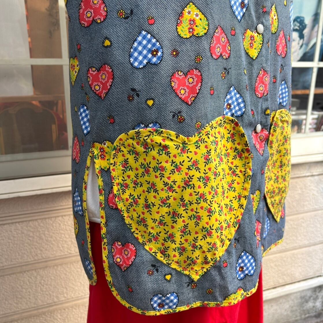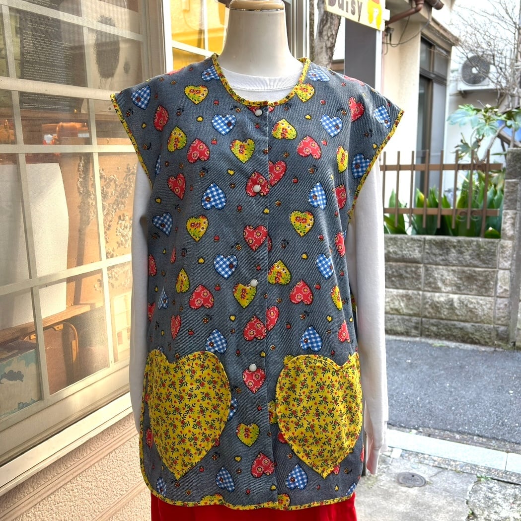 70年代 ヴィンテージ 当時のハンドメイド1点もの ハート柄、ハートポケットの前開きトップスです。