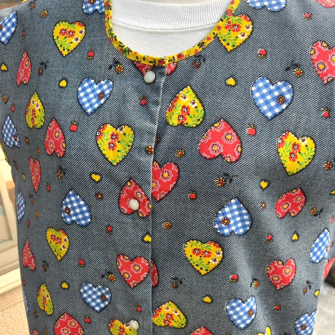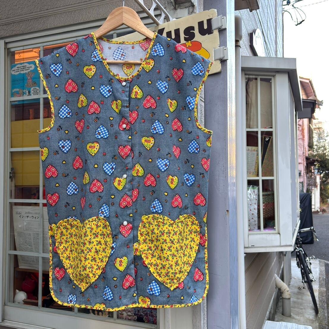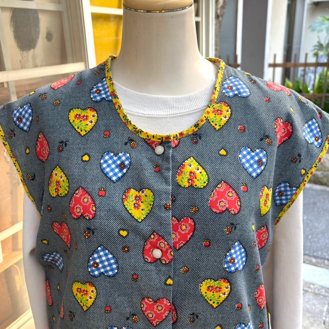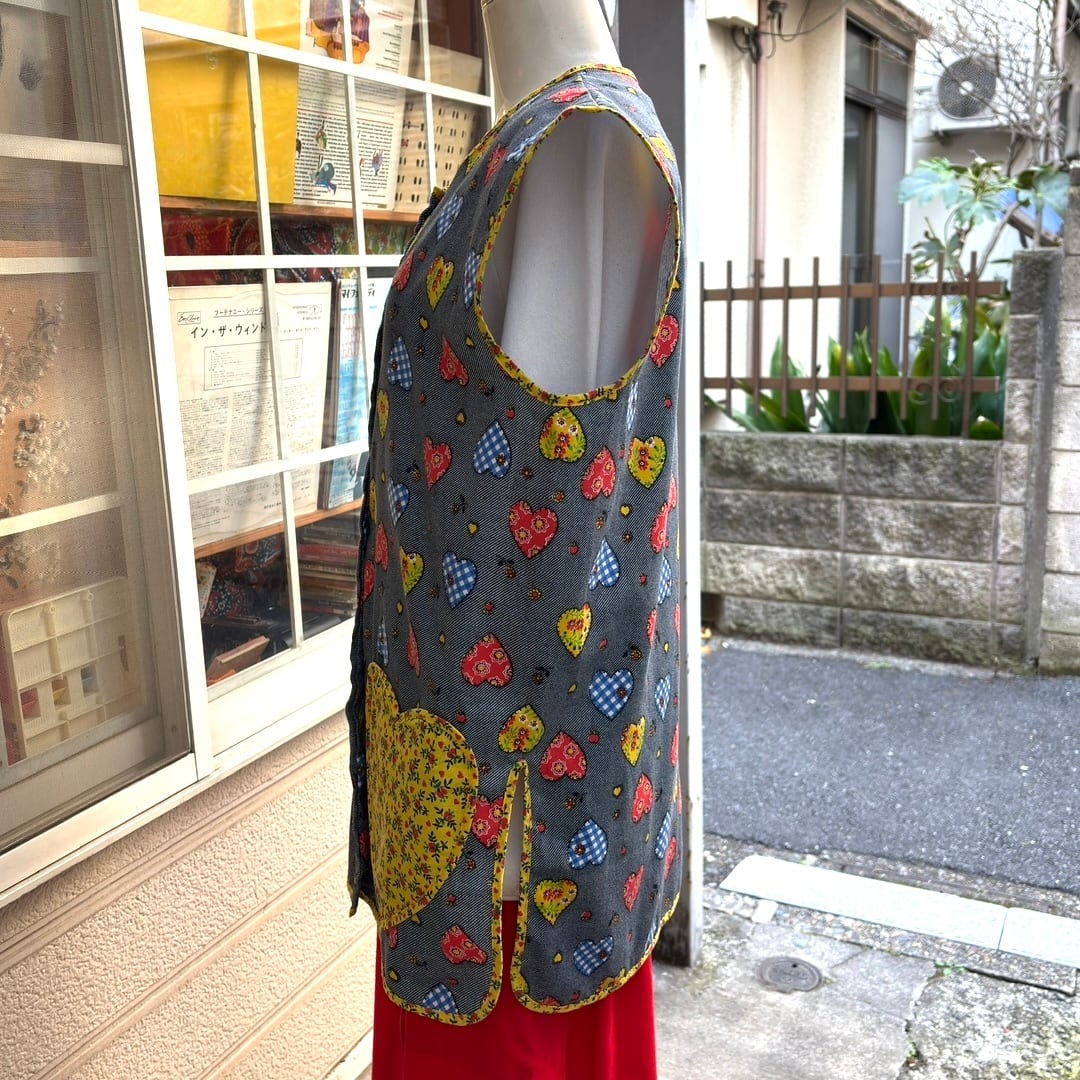 70年代 ヴィンテージ 当時のハンドメイド1点もの ハート柄、ハートポケットの前開きトップスです。
