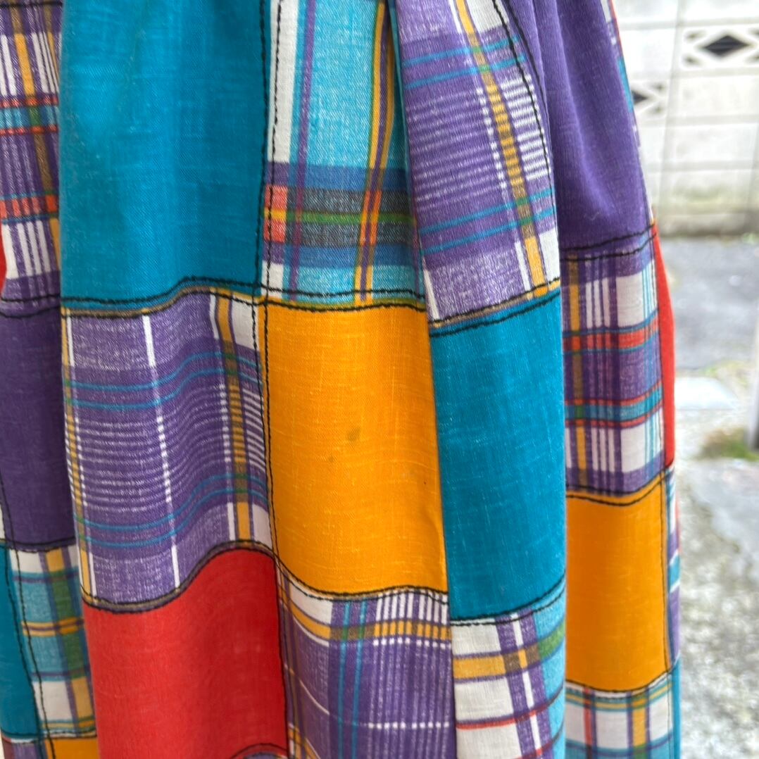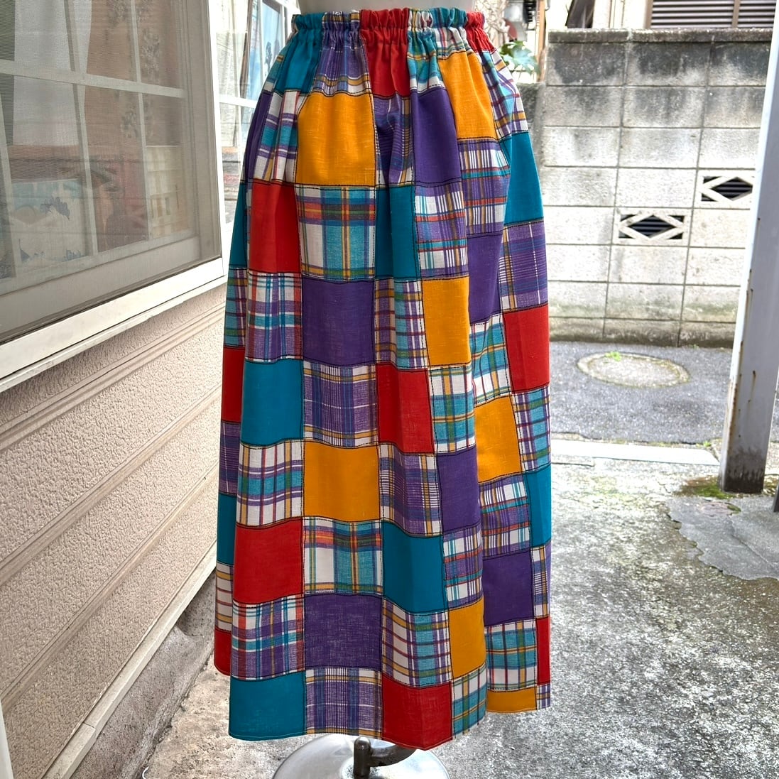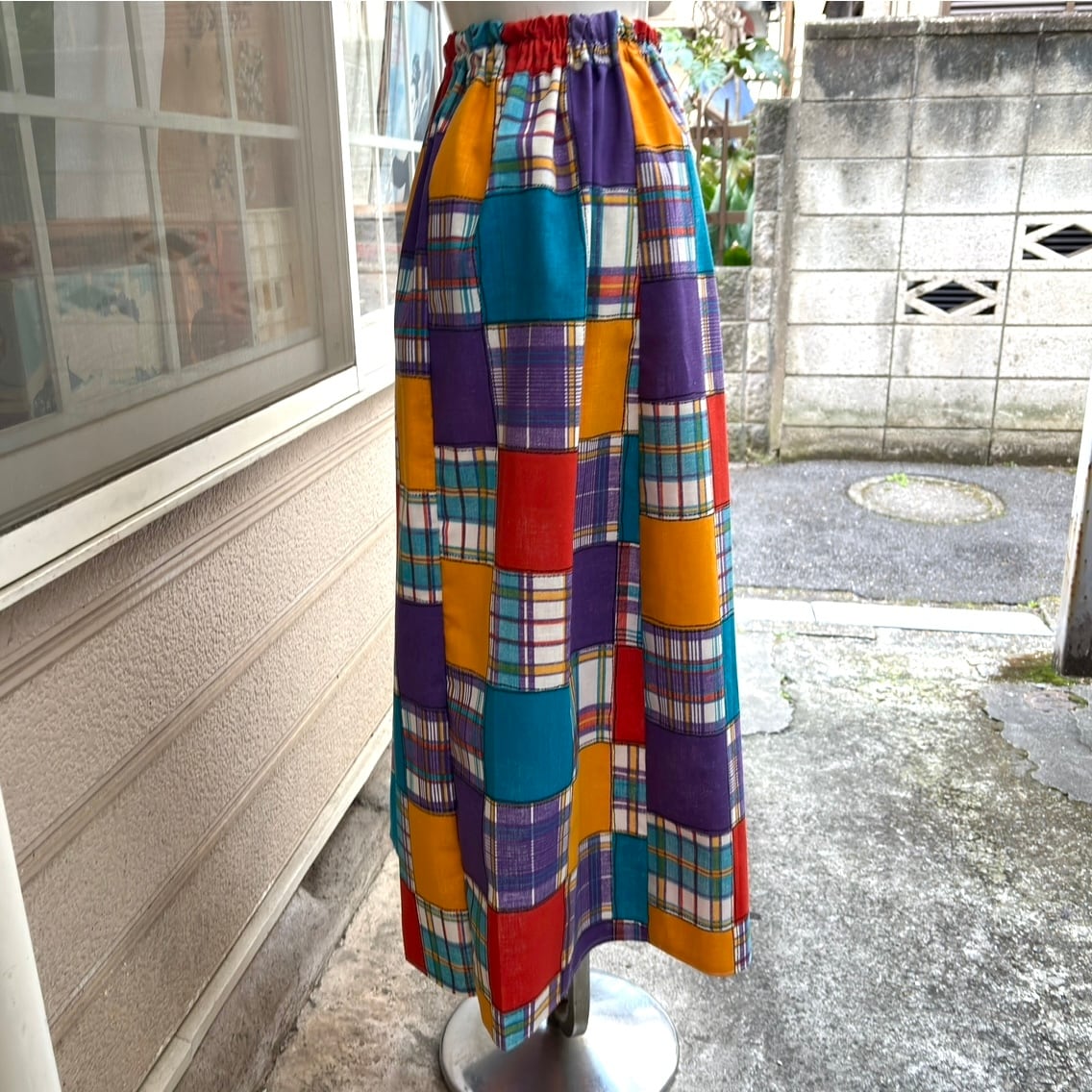 70年代 ヴィンテージ 当時のハンドメイド1点もの カラフルチェック パッチワーク柄 スカートです。