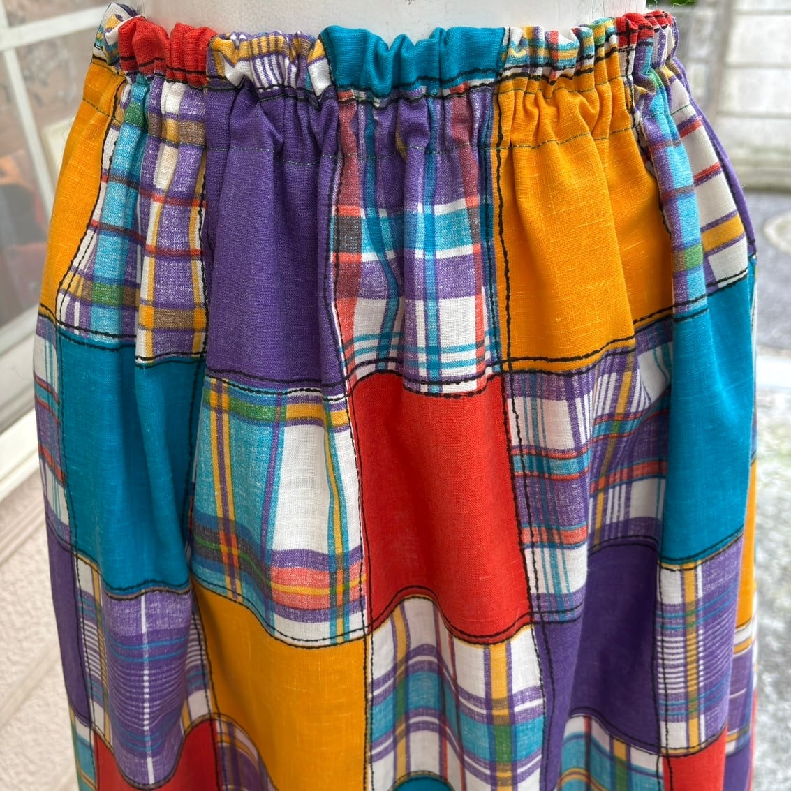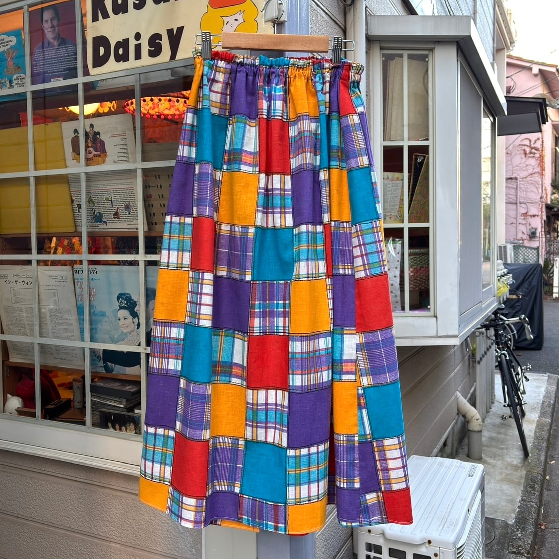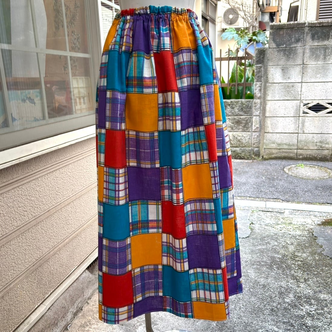 70年代 ヴィンテージ 当時のハンドメイド1点もの カラフルチェック パッチワーク柄 スカートです。