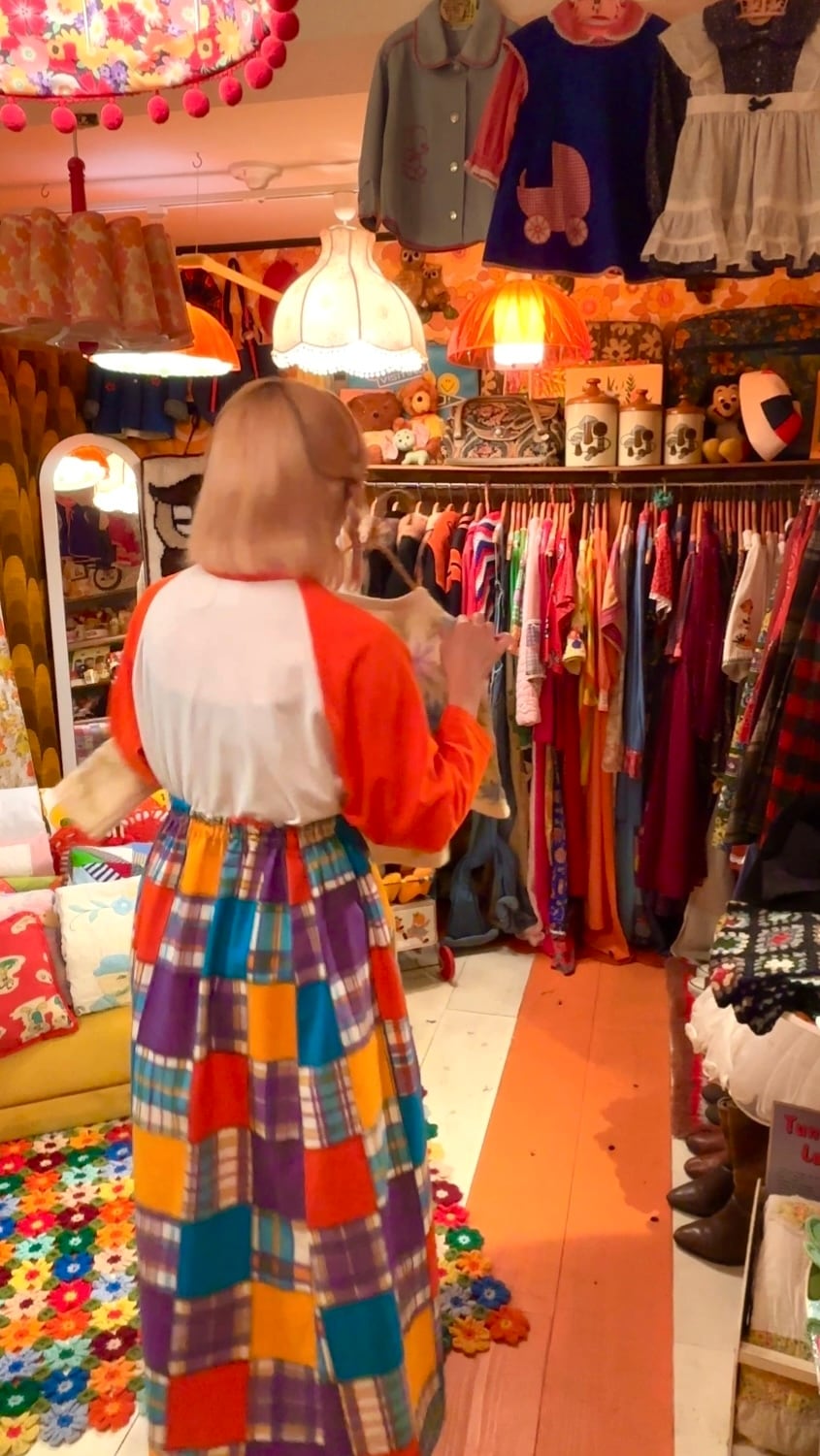 張り感がありヴィンテージ ならではな風合いのあるコットンの生地感、カラフルなパッチワーク柄がとっても可愛い1着です。