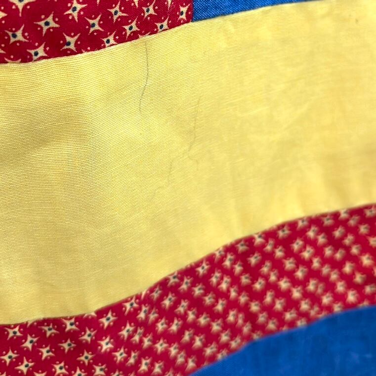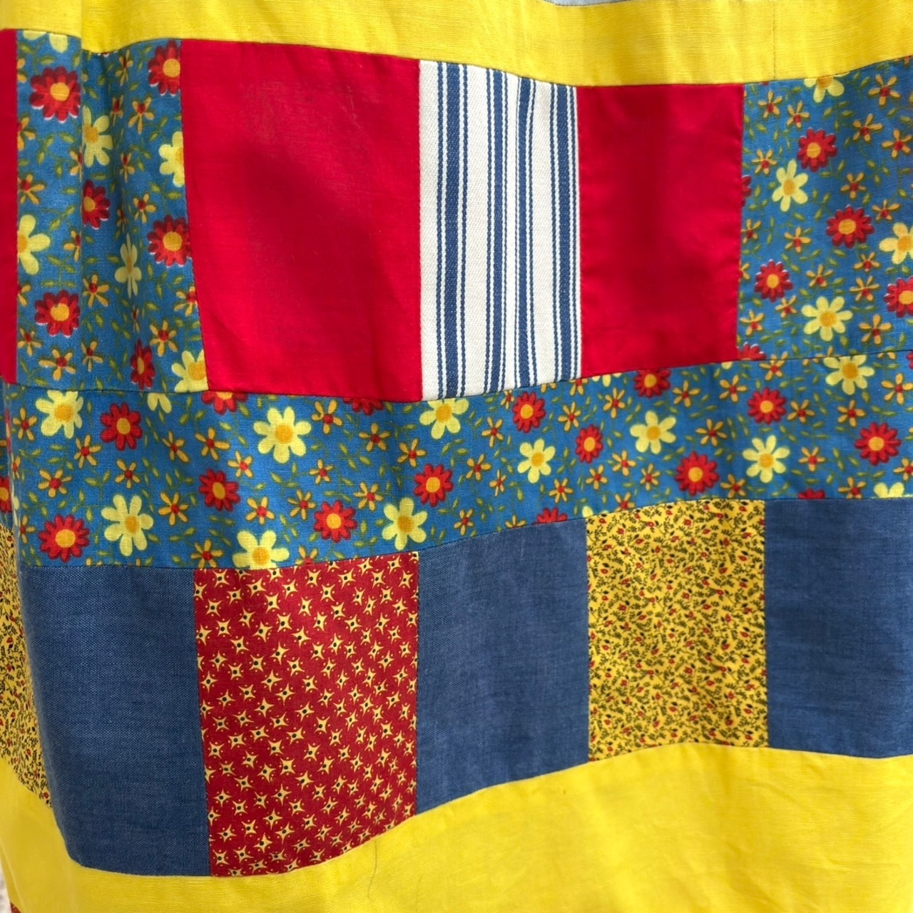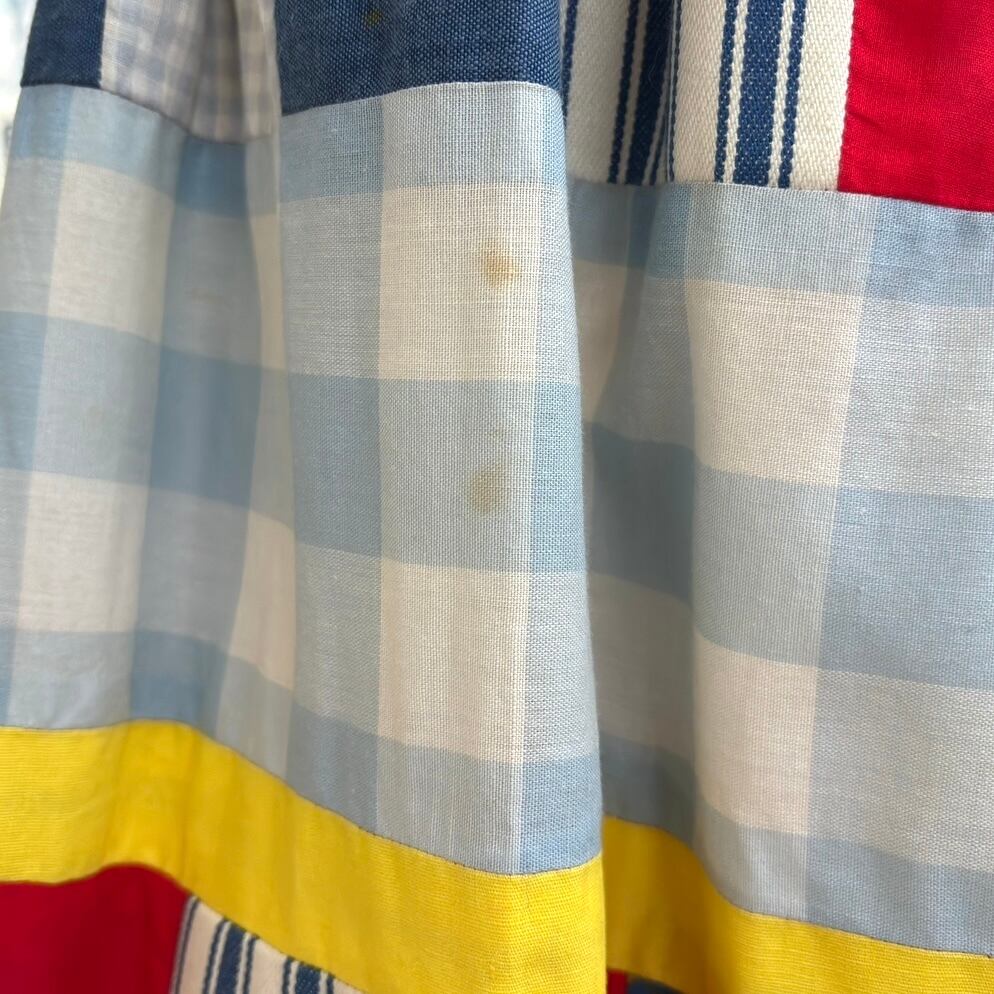 ウエストより20cm辺りの(大きめの)ギンガムチェックの部分に点々とした僅かなシミ、ウエストより35cm辺りのマルチストライプとレッドの部分に点々としたペン跡のようなシミ、裾より38cm辺りのライトイエローの部分に線のようなペン跡が見られますが、柄に紛れて大きく目立つことは無いかと思います。
