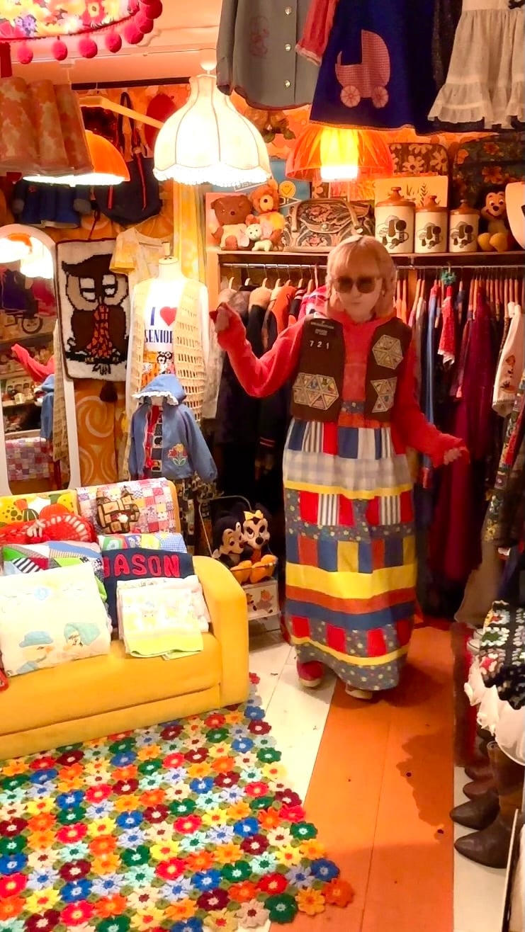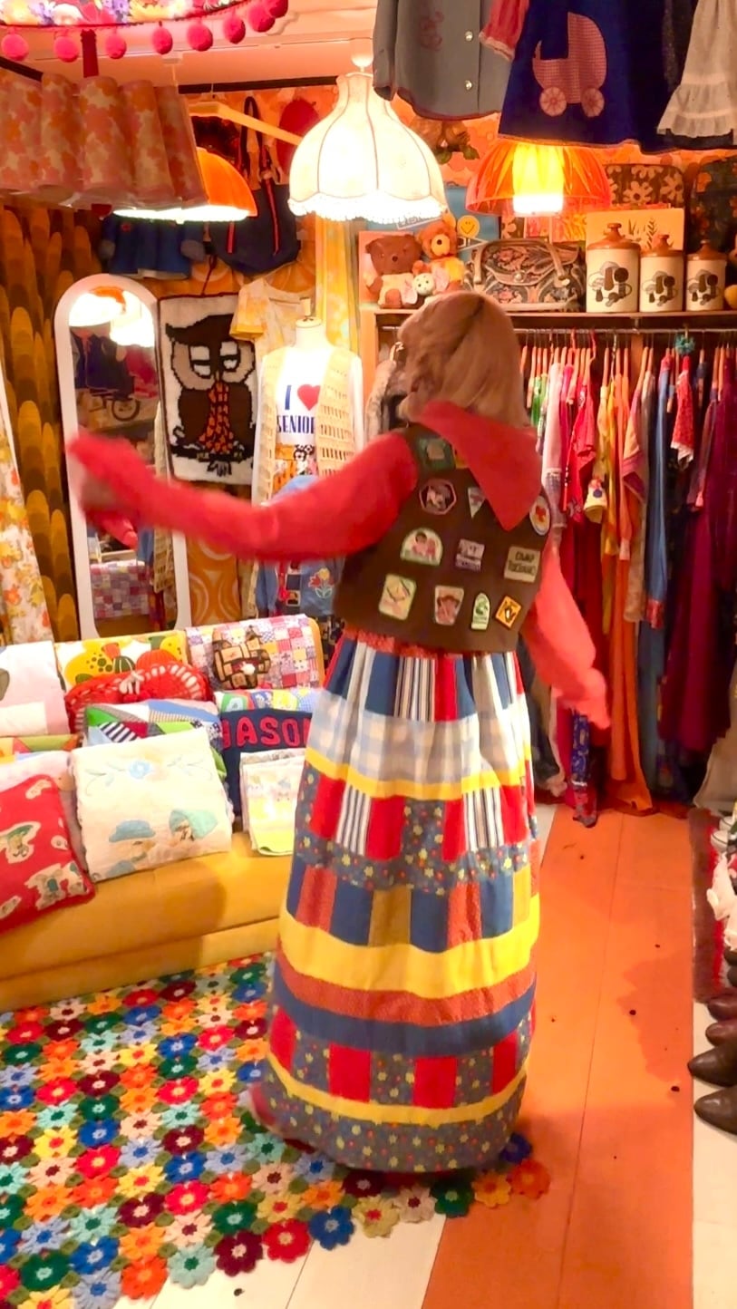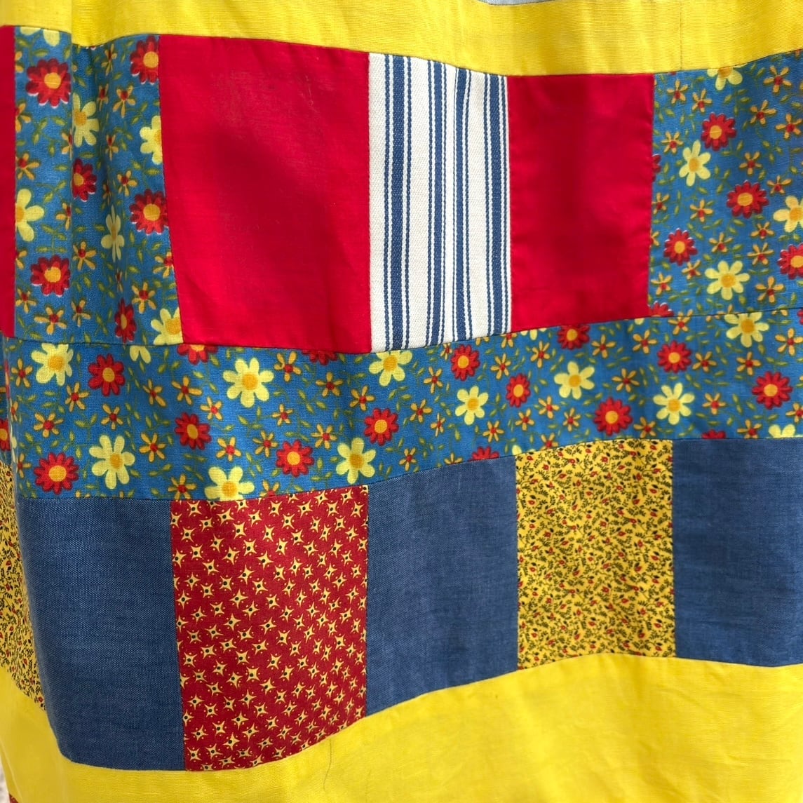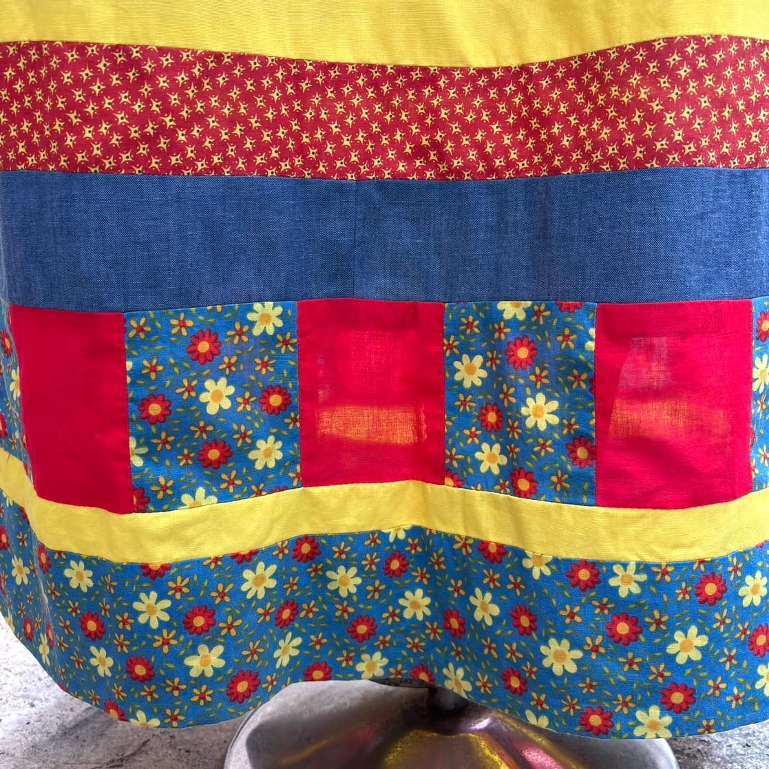 レトロなフラワー柄やギンガムチェック、マルチストライプ、レッドやデニムのカラフルなパッチワークがとっても可愛い1着です。