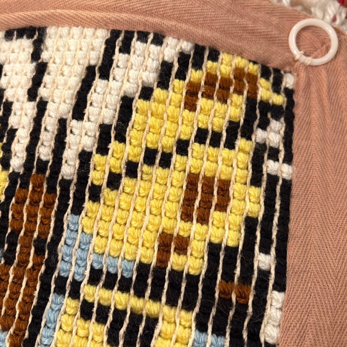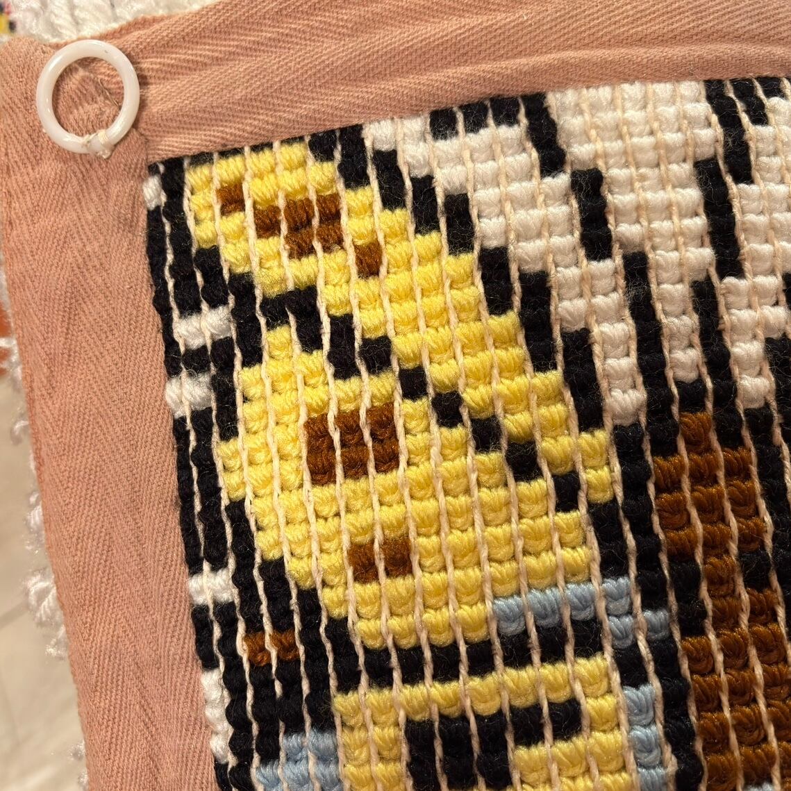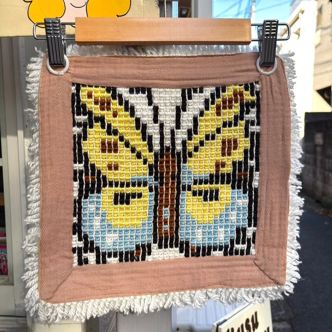 裏側にプラスチック製のリングが2つあり、ラグとしてはもちろん、タペストリーとして壁に飾って頂いても可愛いかと思います。