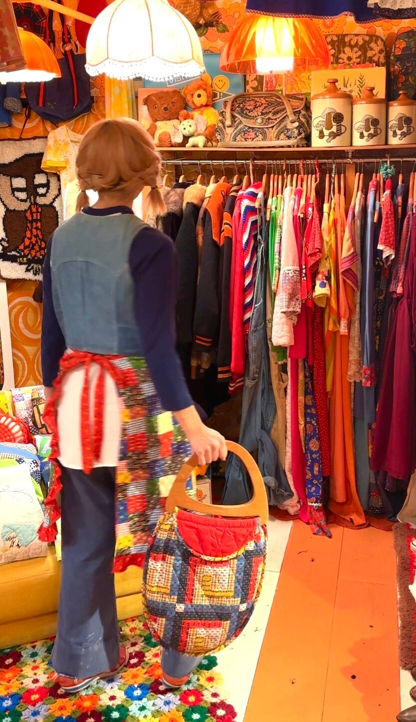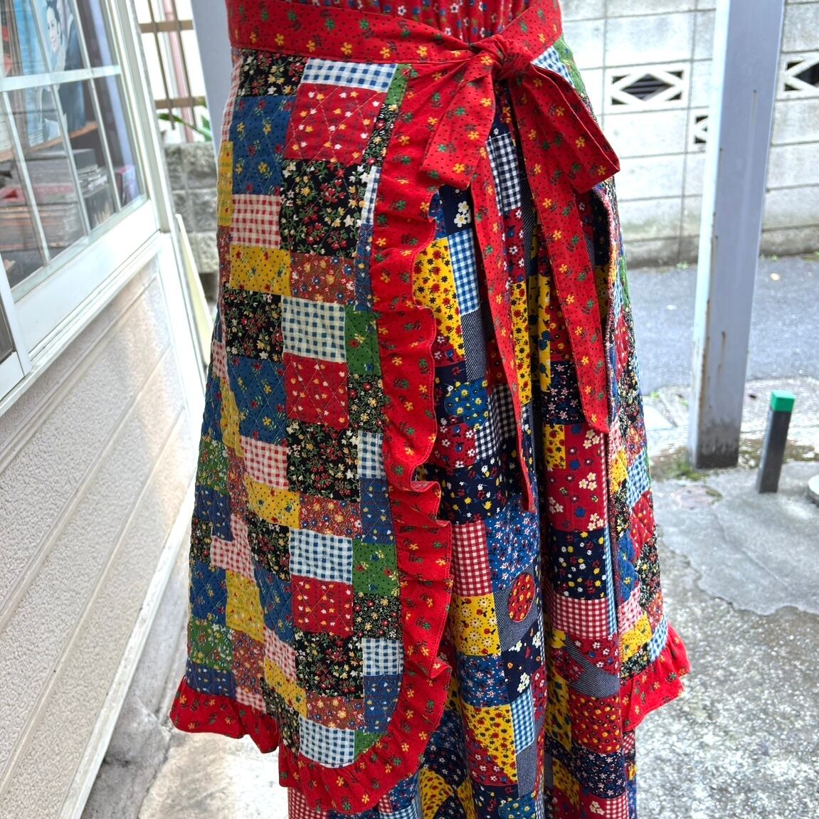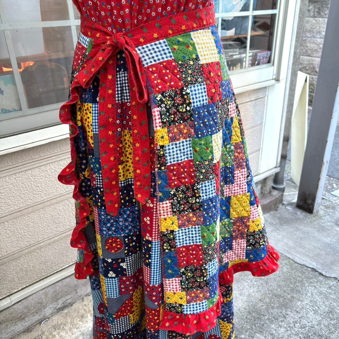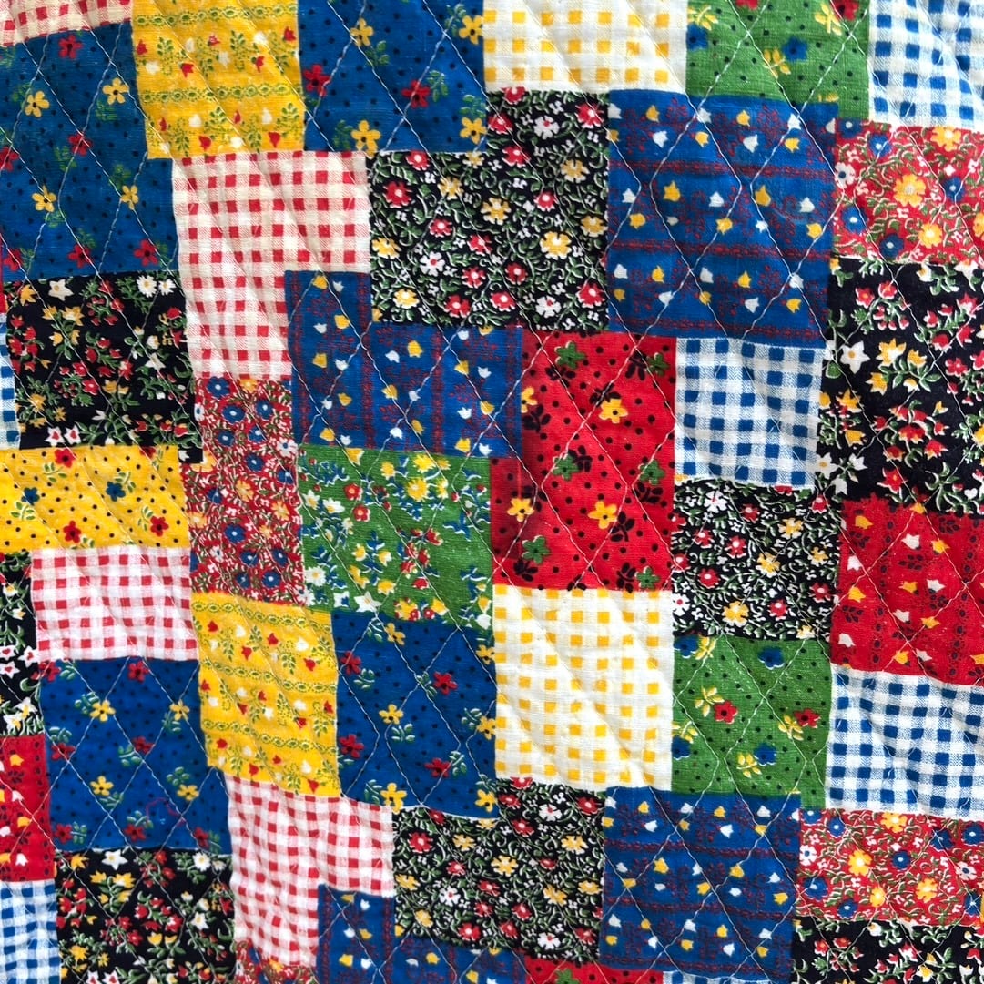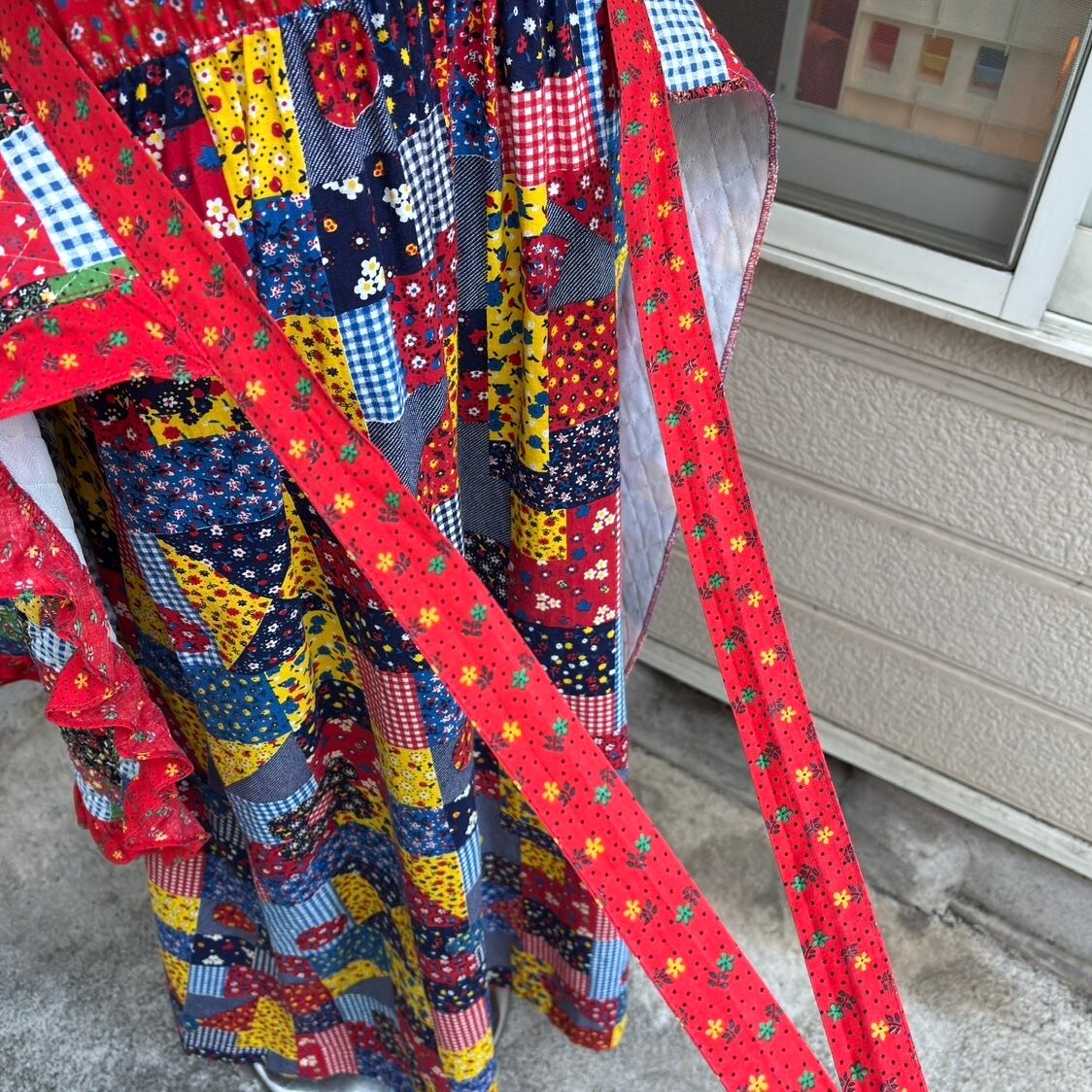 70年代 ヴィンテージ 当時のハンドメイド1点もの パッチワーク柄 キルティング エプロンです。