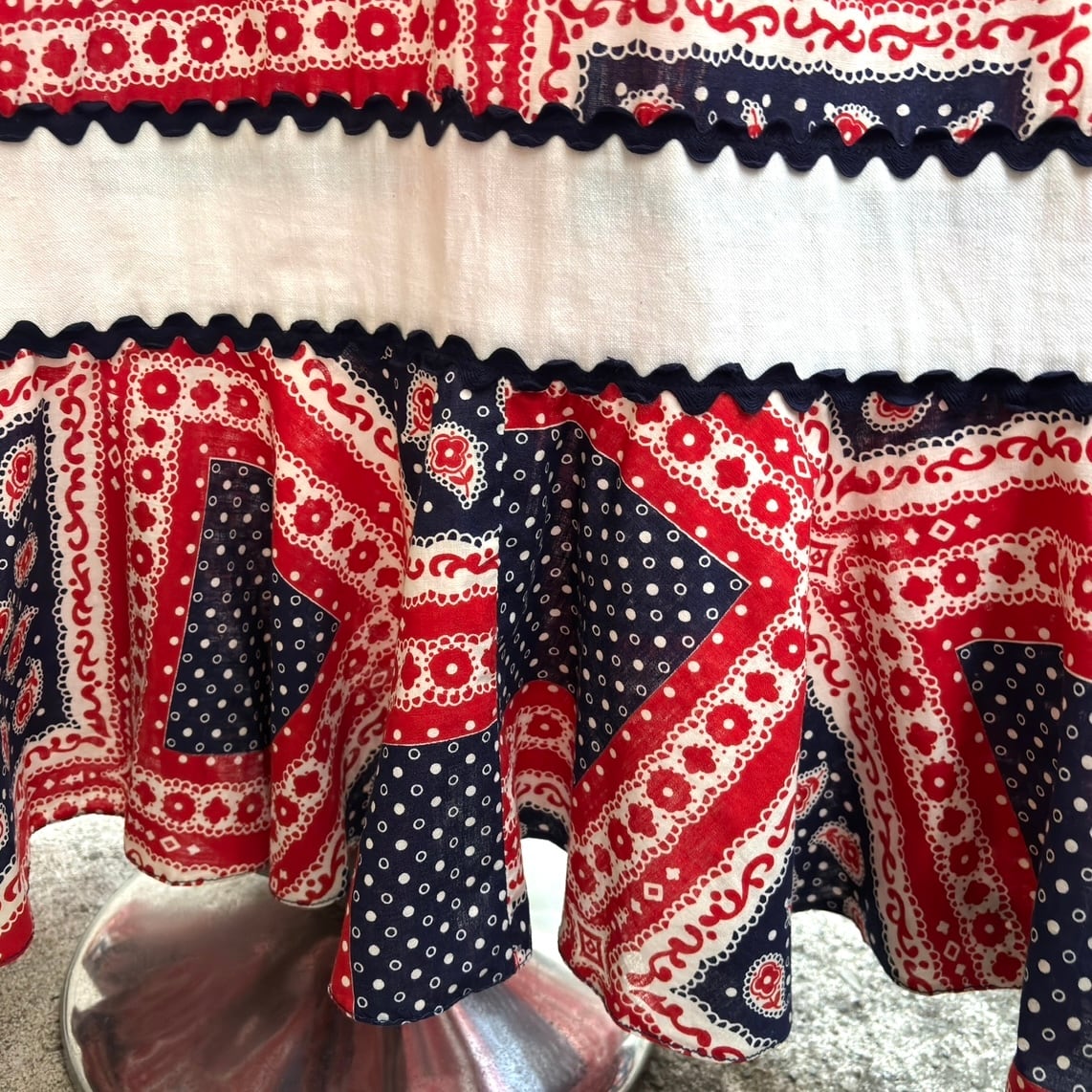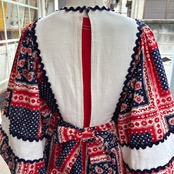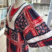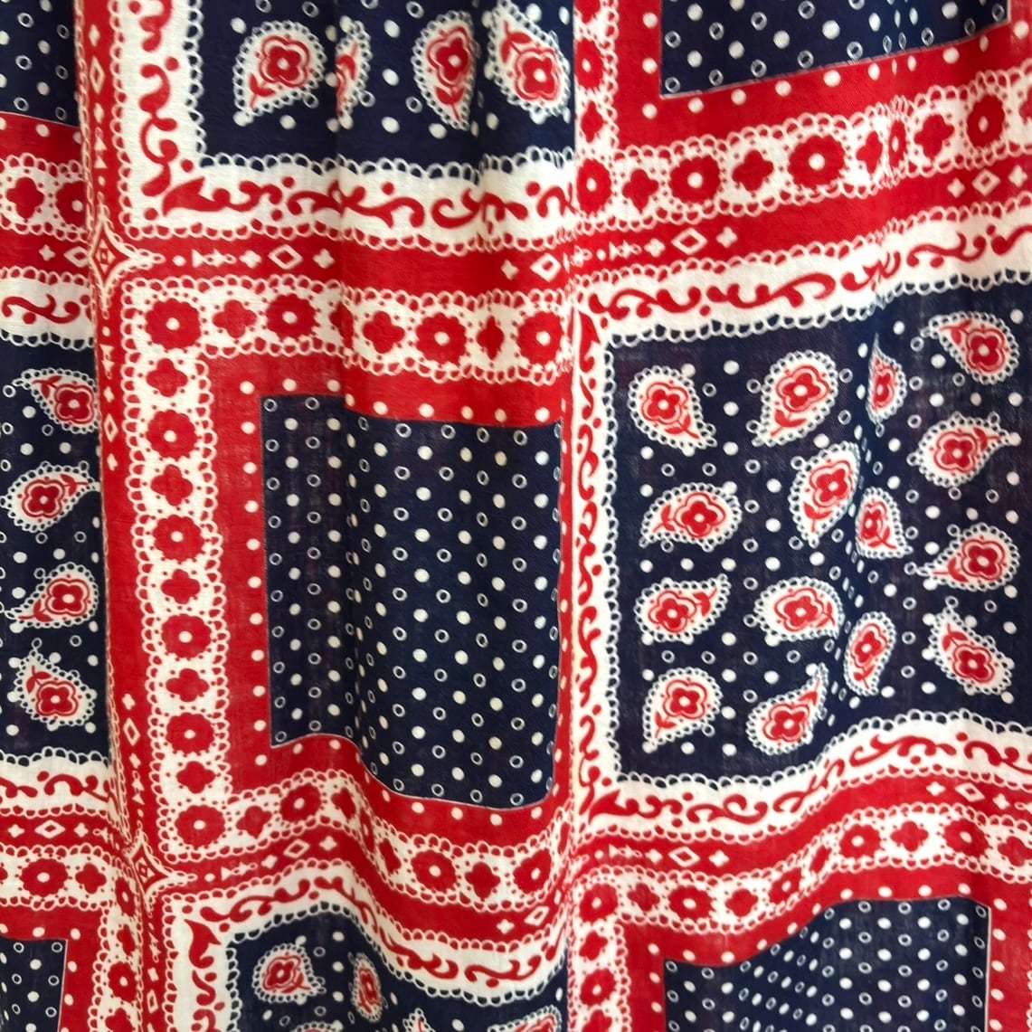 レッド、ホワイト、ネイビーのトリコロールなカラーリング、フラワーやペイズリー、ピンドットのポップなバンダナモチーフのパッチワーク柄がとっても可愛い1着です。