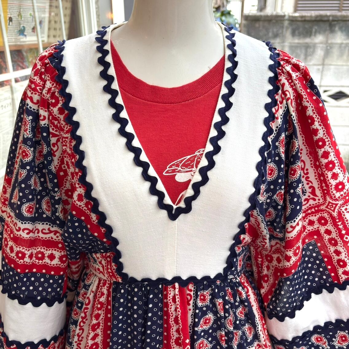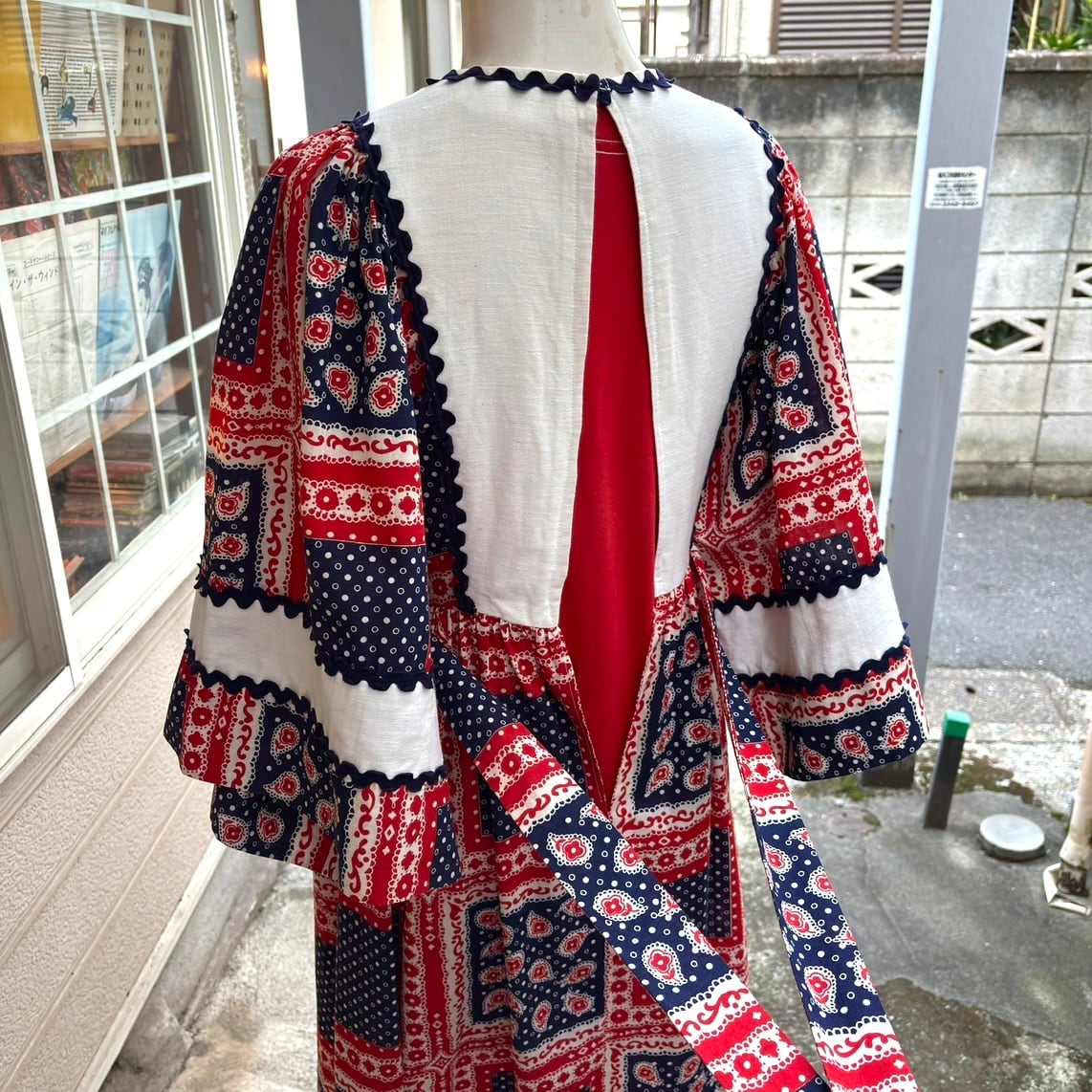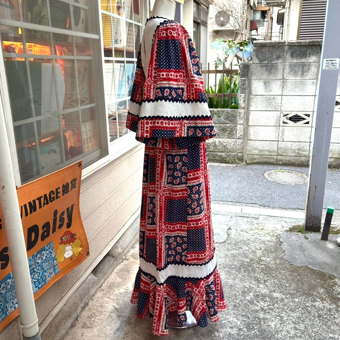 70年代 ヴィンテージ バンダナパッチワーク柄 フレアスリーブ ドレスです。