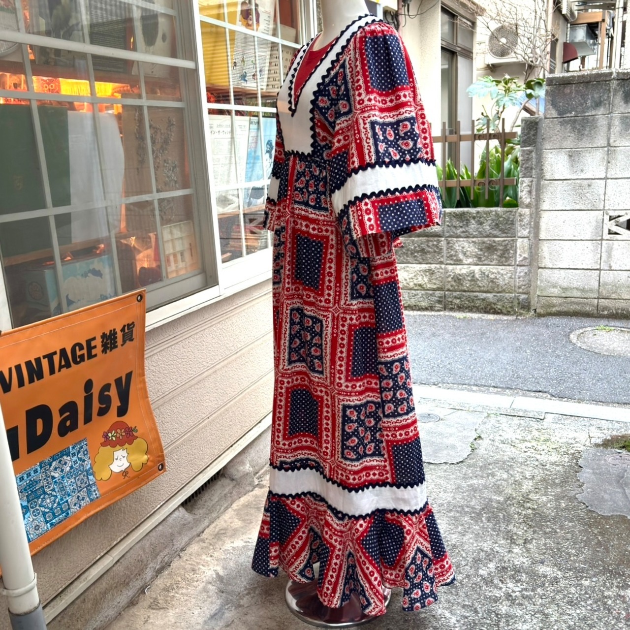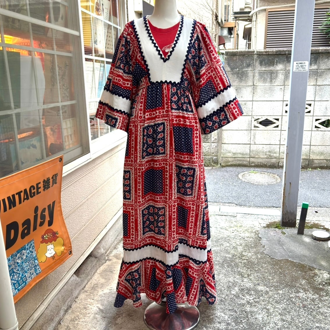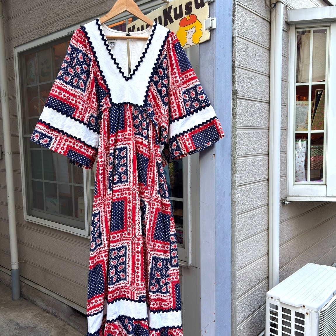 70年代 ヴィンテージ バンダナパッチワーク柄 フレアスリーブ ドレスです。