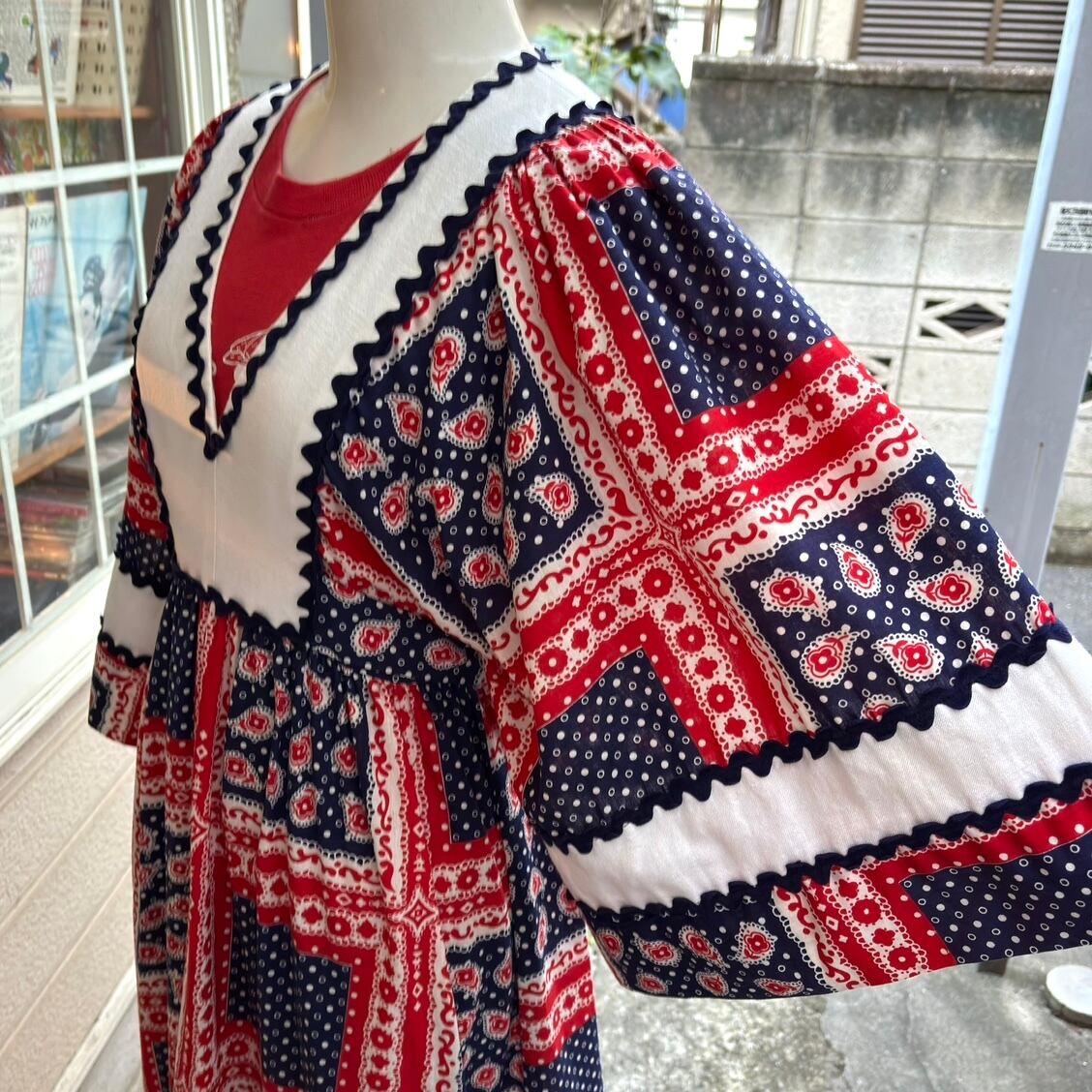 70'S USA Vintage bandana patchwork pattern flare sleeves dress。