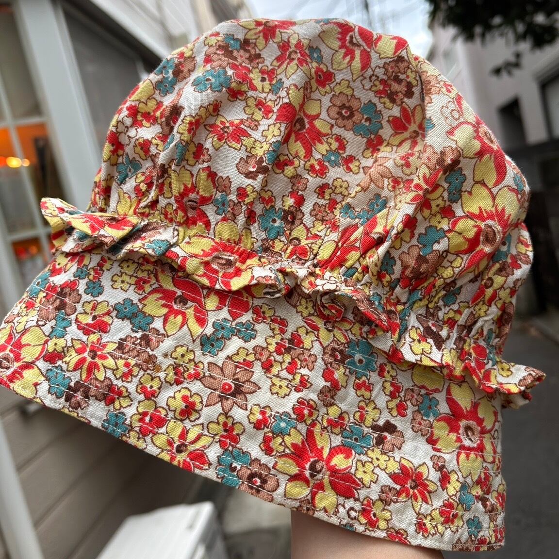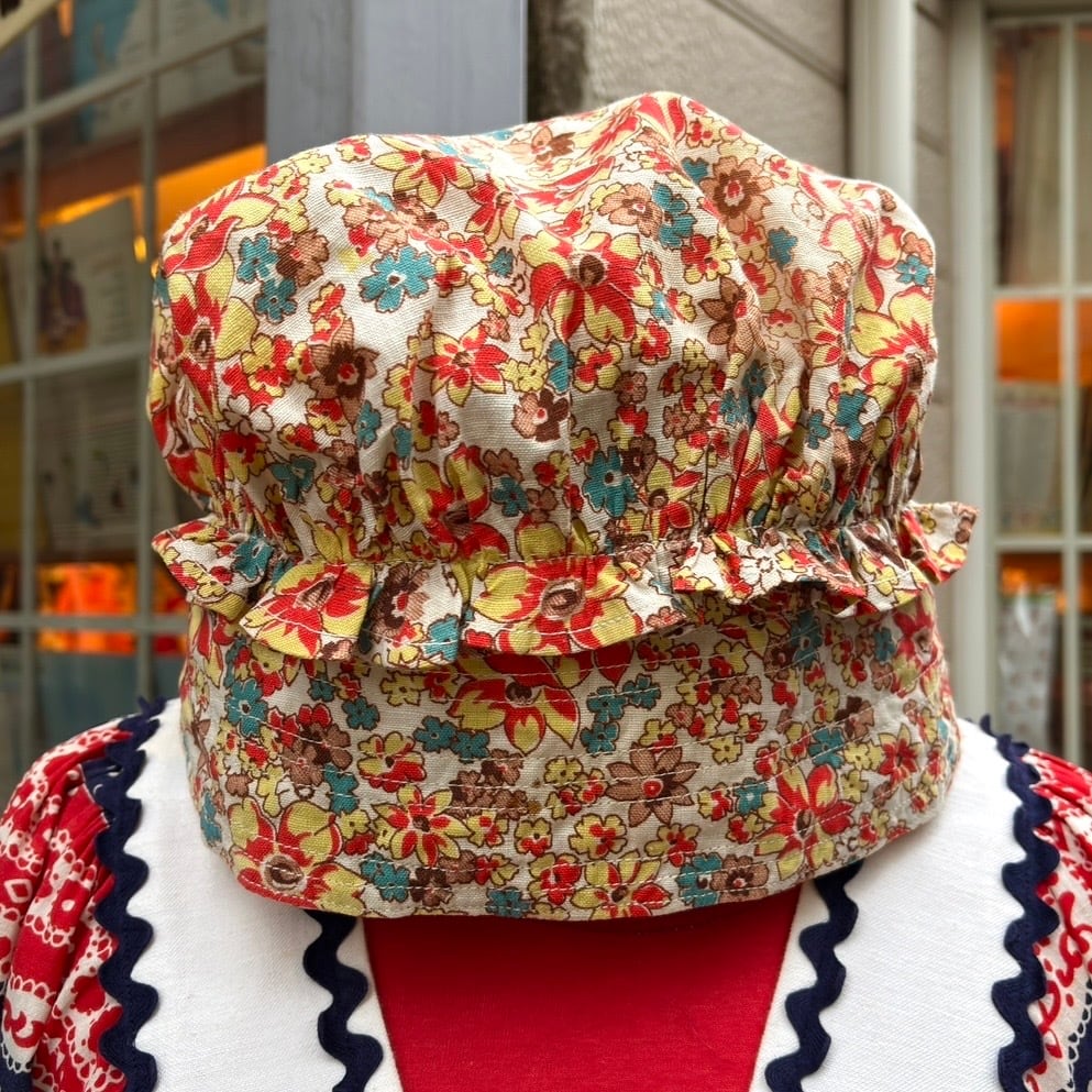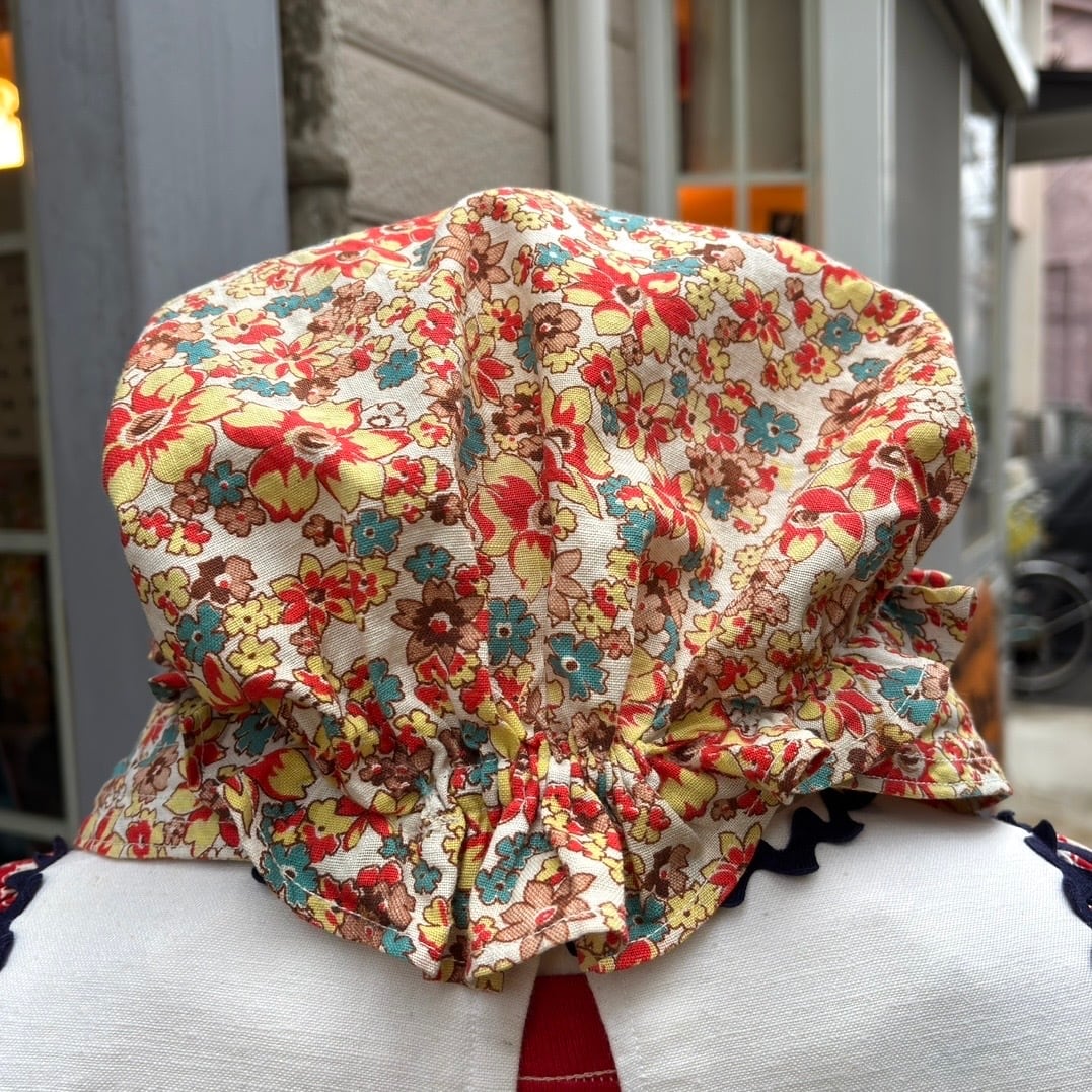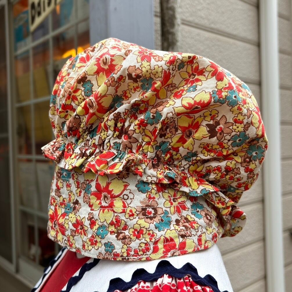 70年代 ヴィンテージ 当時のハンドメイド1点もの フラワー柄 ボンネットハットです。
