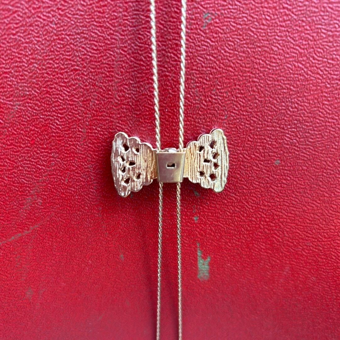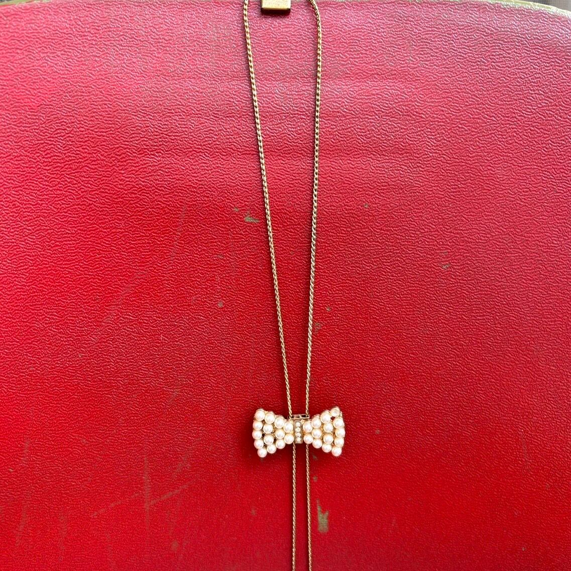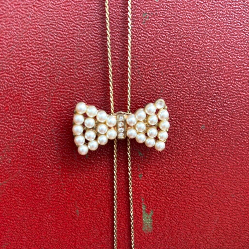 ゴールドのロングチェーンにパールビーズやビジューが埋め込まれたリボン、ループタイのデザインがとっても可愛いアイテムです。