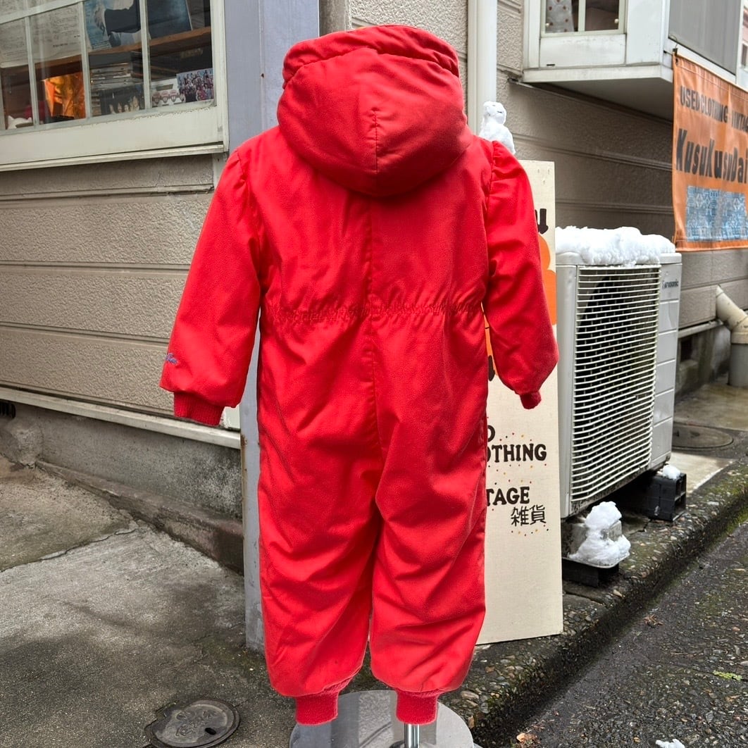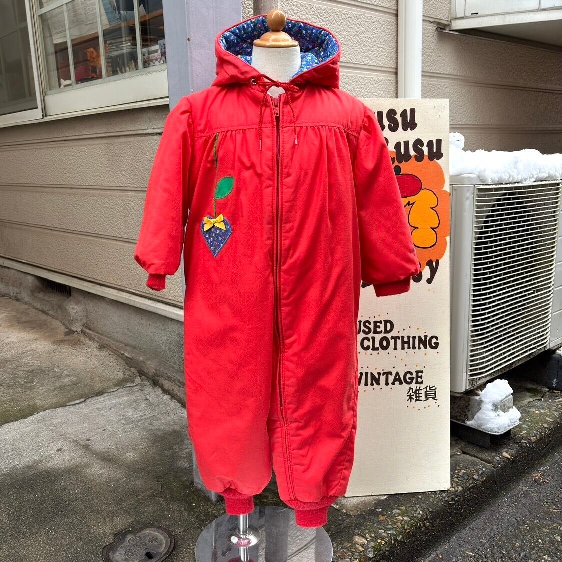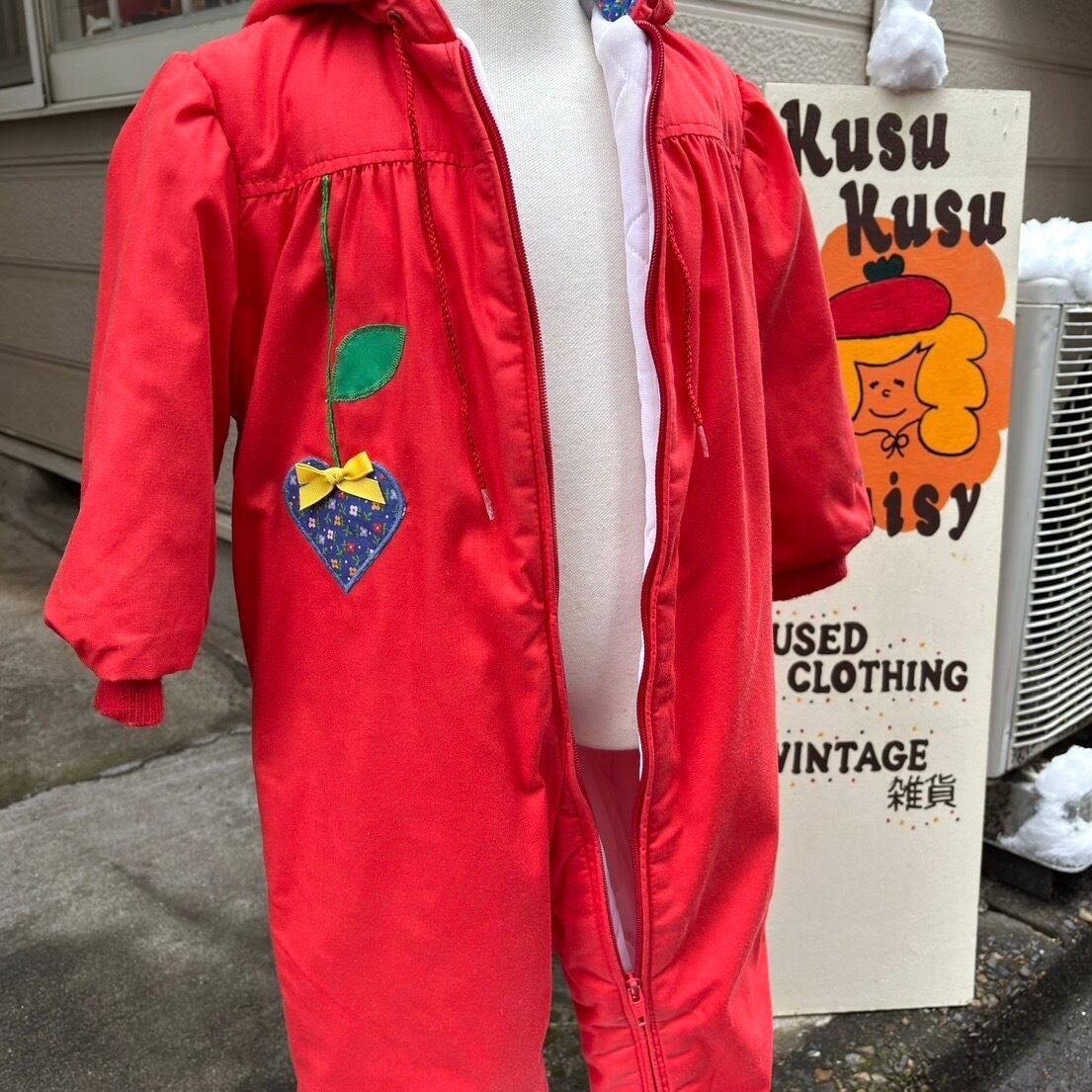 朱色のボディーにポップなハートフラワーパッチやオールインワンのデザインがとっても可愛い1着です。