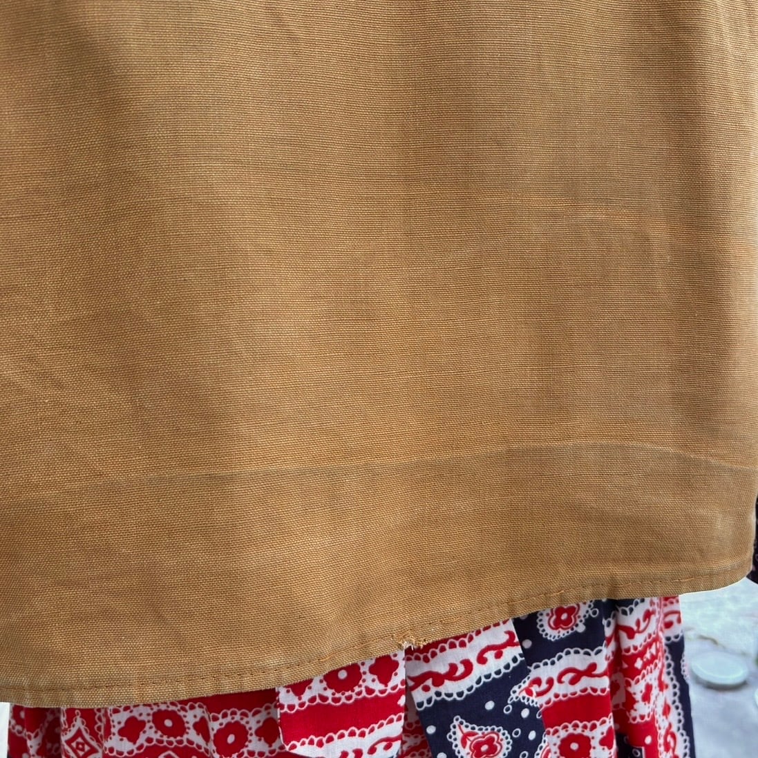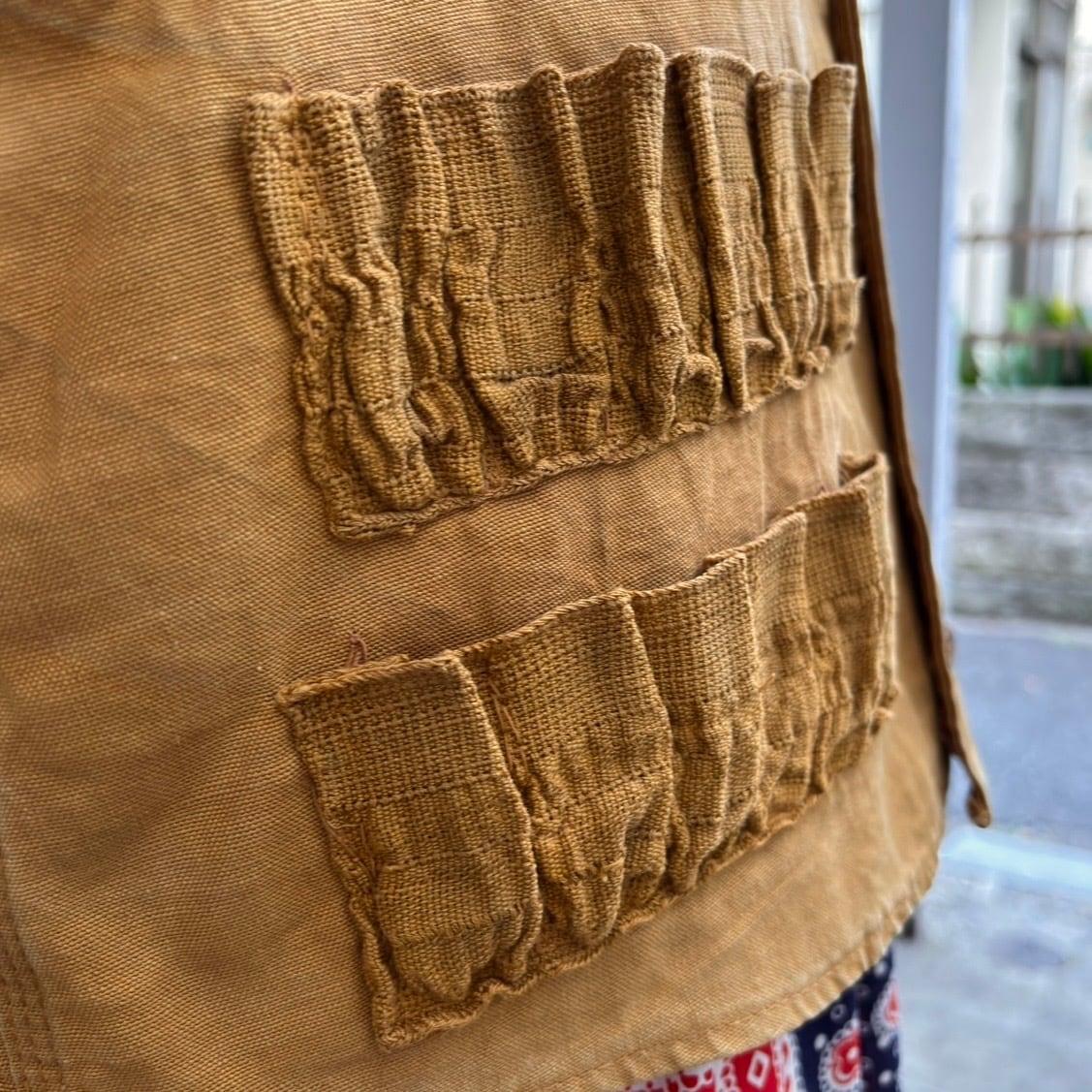 経年によるシミやシワのくせ、弾を入れていたポケットの生地に僅かな糸のよれ、背面側の裾中央に小さなほつれのリペア、ステッチの縫い目の僅かなゆるみが見られますがヴィンテージならではなあじとして捉えて頂けたらと思います。