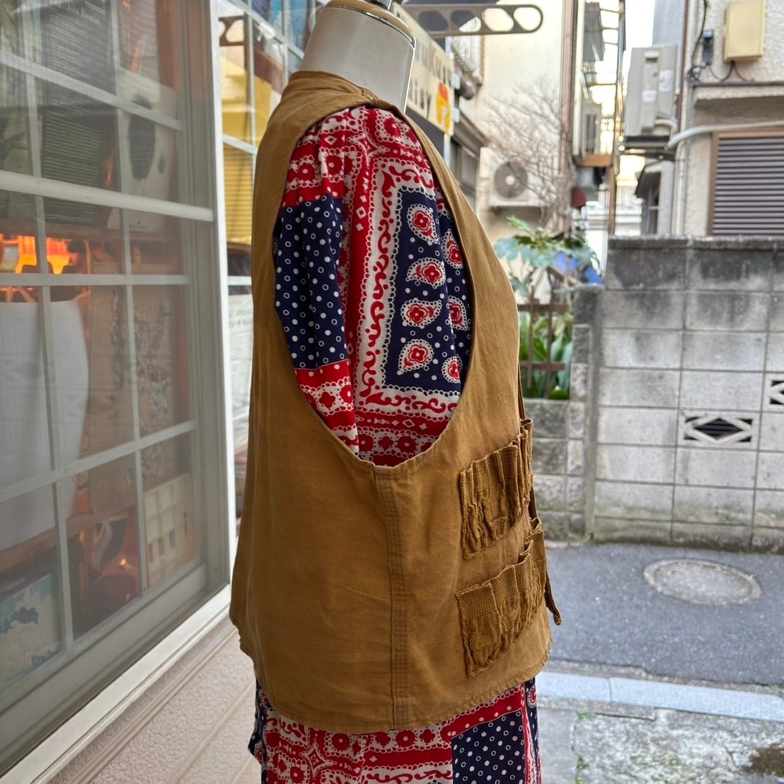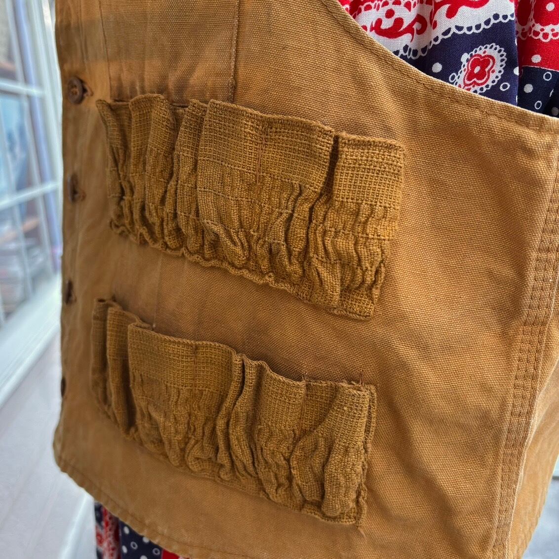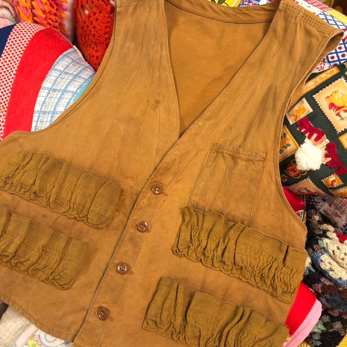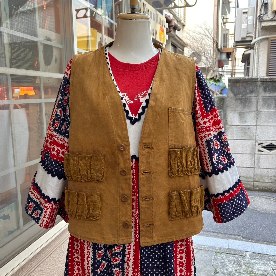 当時 狩猟に行く際に着ていたアイテムでキャメルカラーの風合いのある生地感やハンティングベストならではなデザインがとっても可愛い1着です。