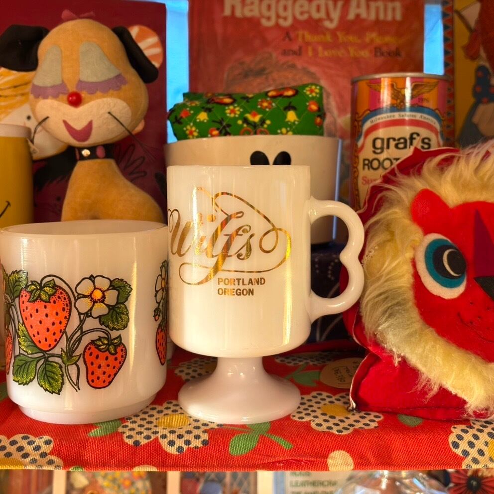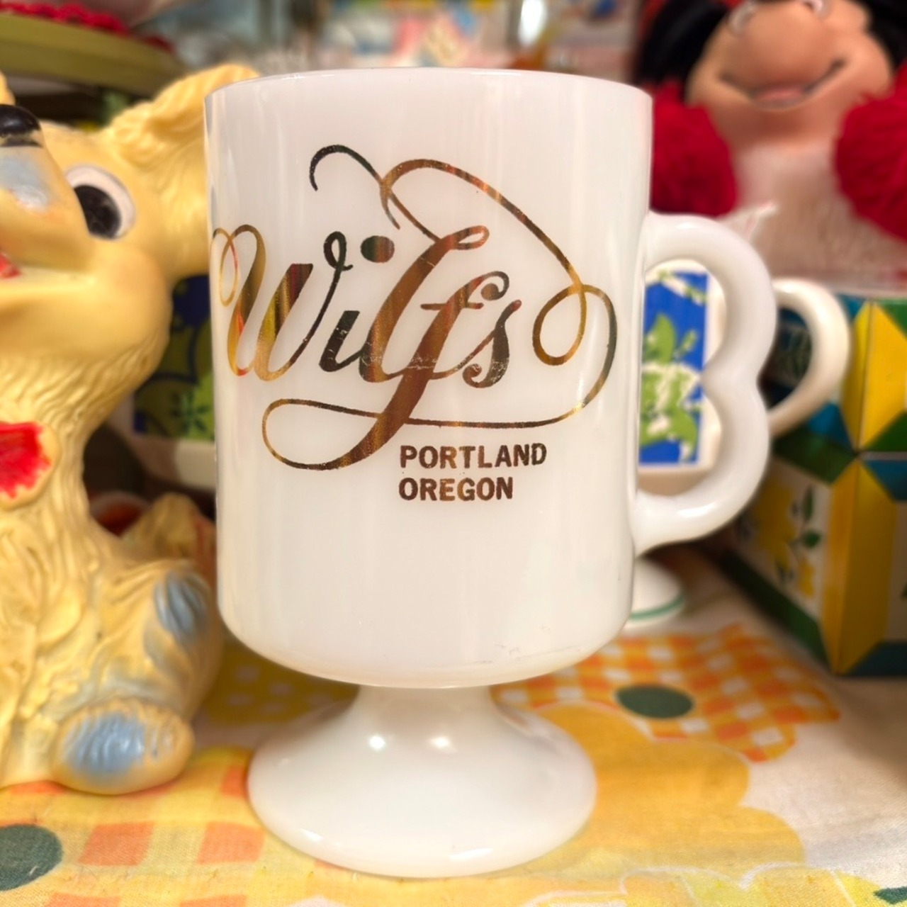 70年代 ヴィンテージ オレゴン州 ポートランド 当時の販促用 脚付きミルクガラス マグカップです。