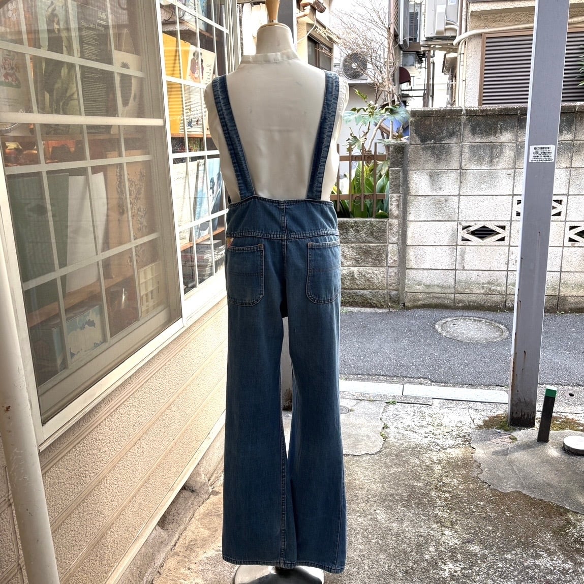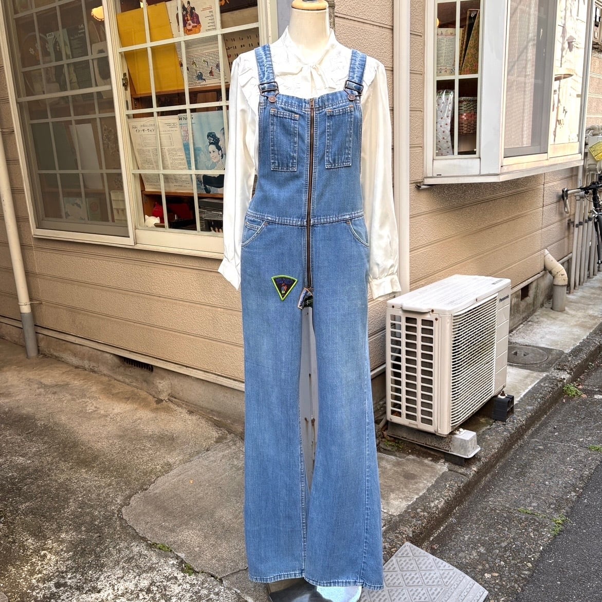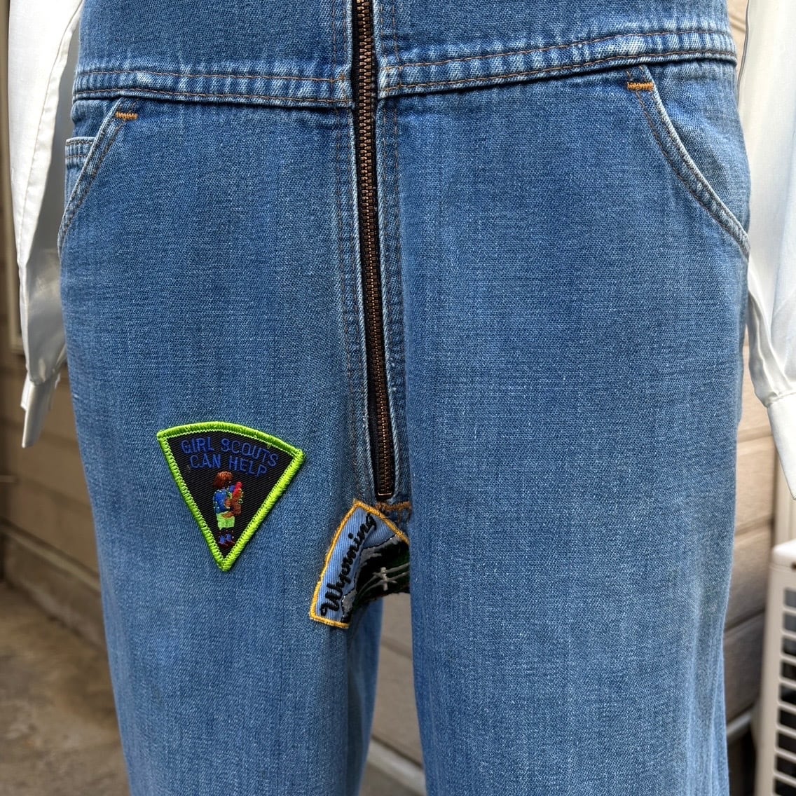70年代 ヴィンテージ パッチがカスタマイズされた デニム フレア サロペットパンツです。