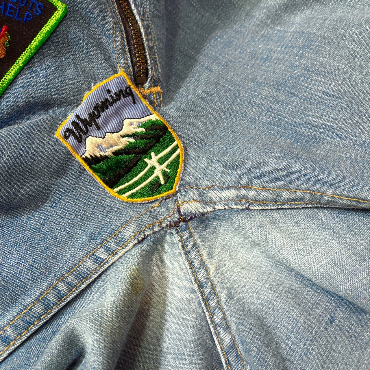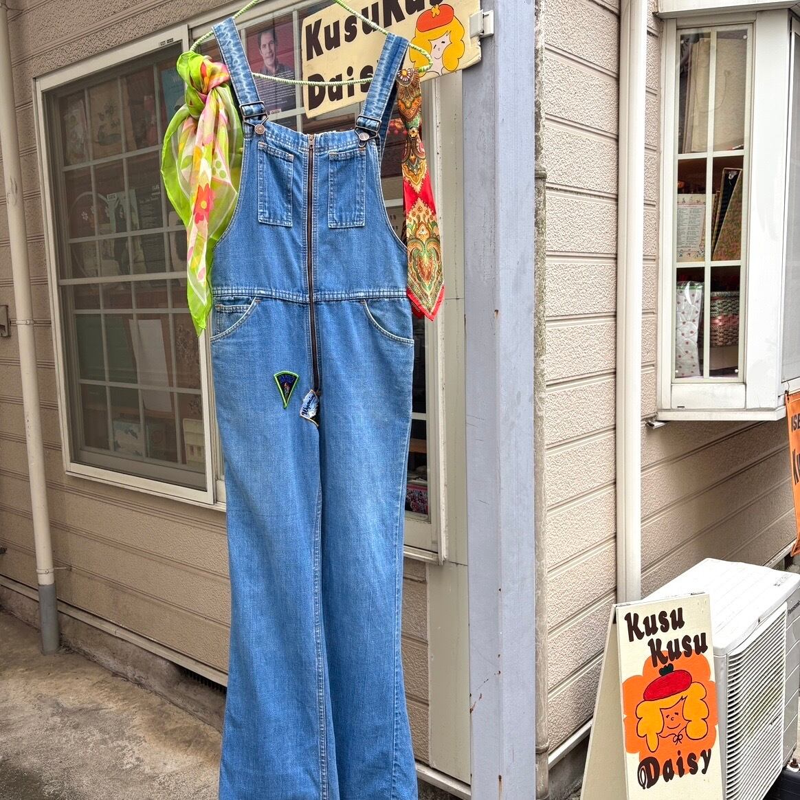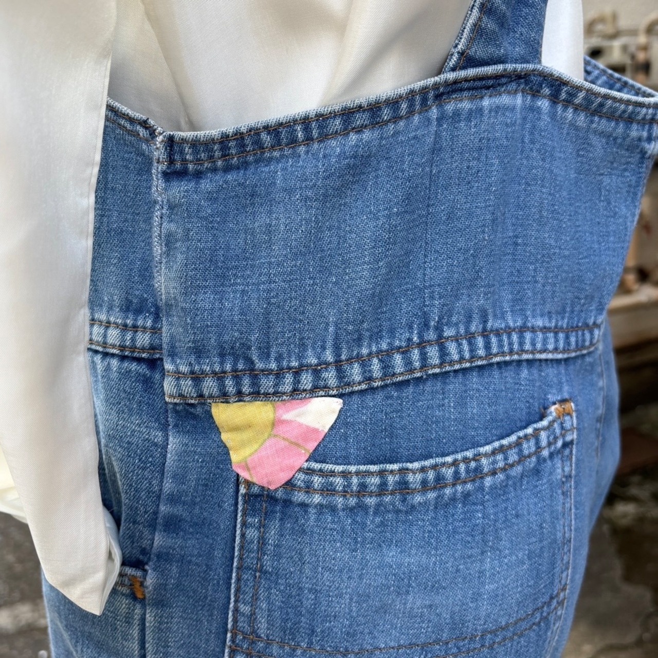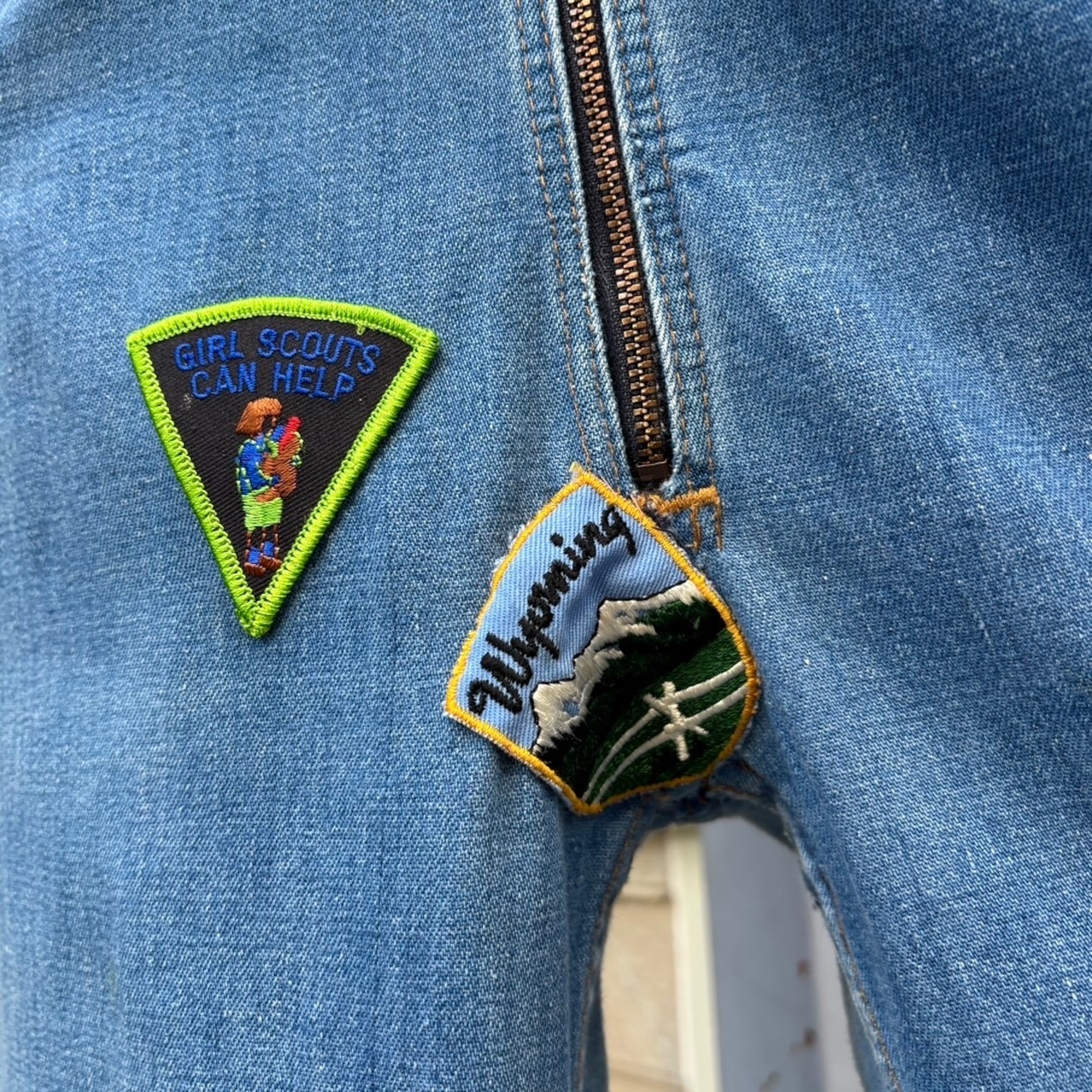 70年代 ヴィンテージ パッチがカスタマイズされた デニム フレア サロペットパンツです。