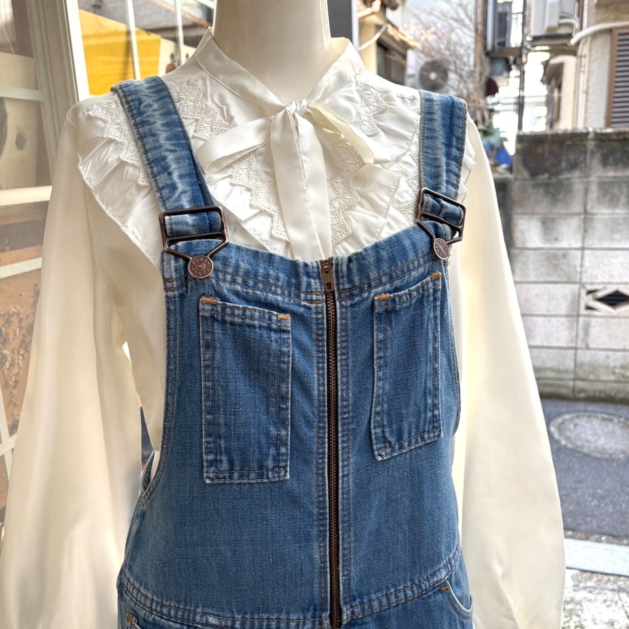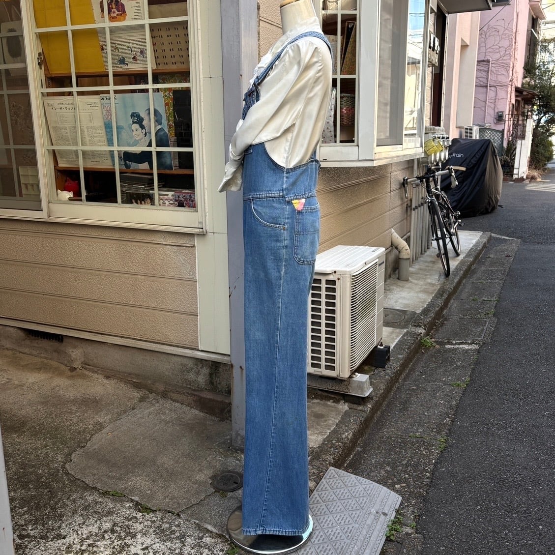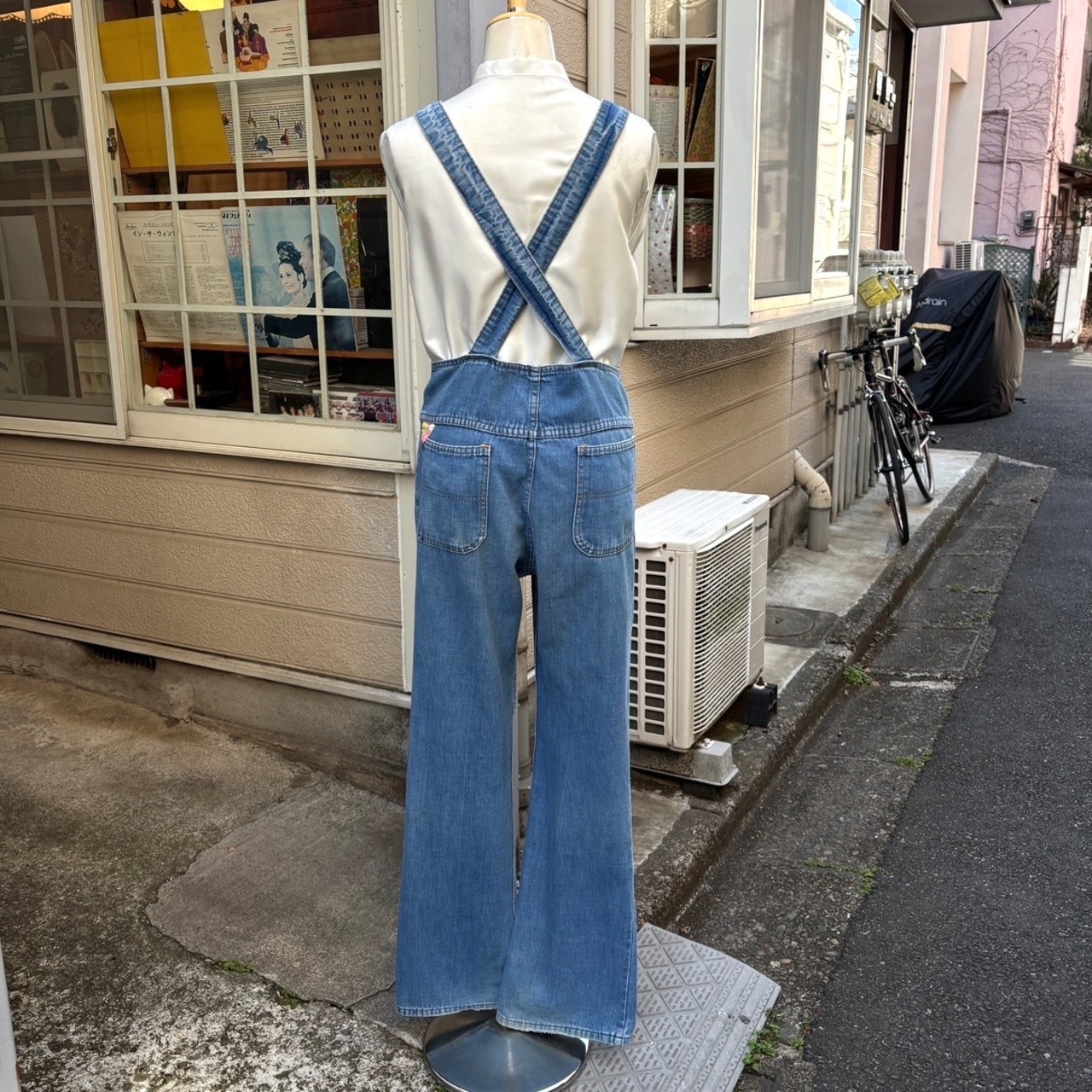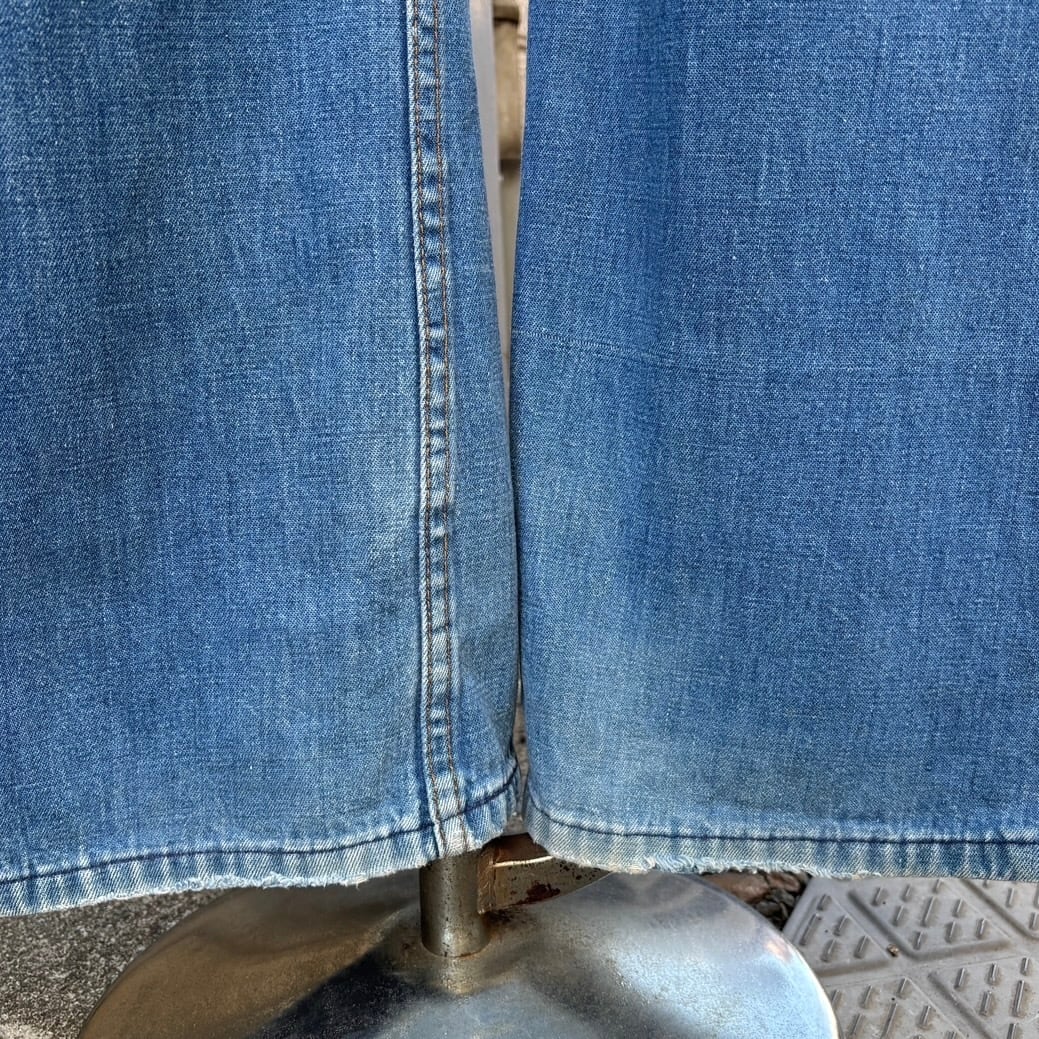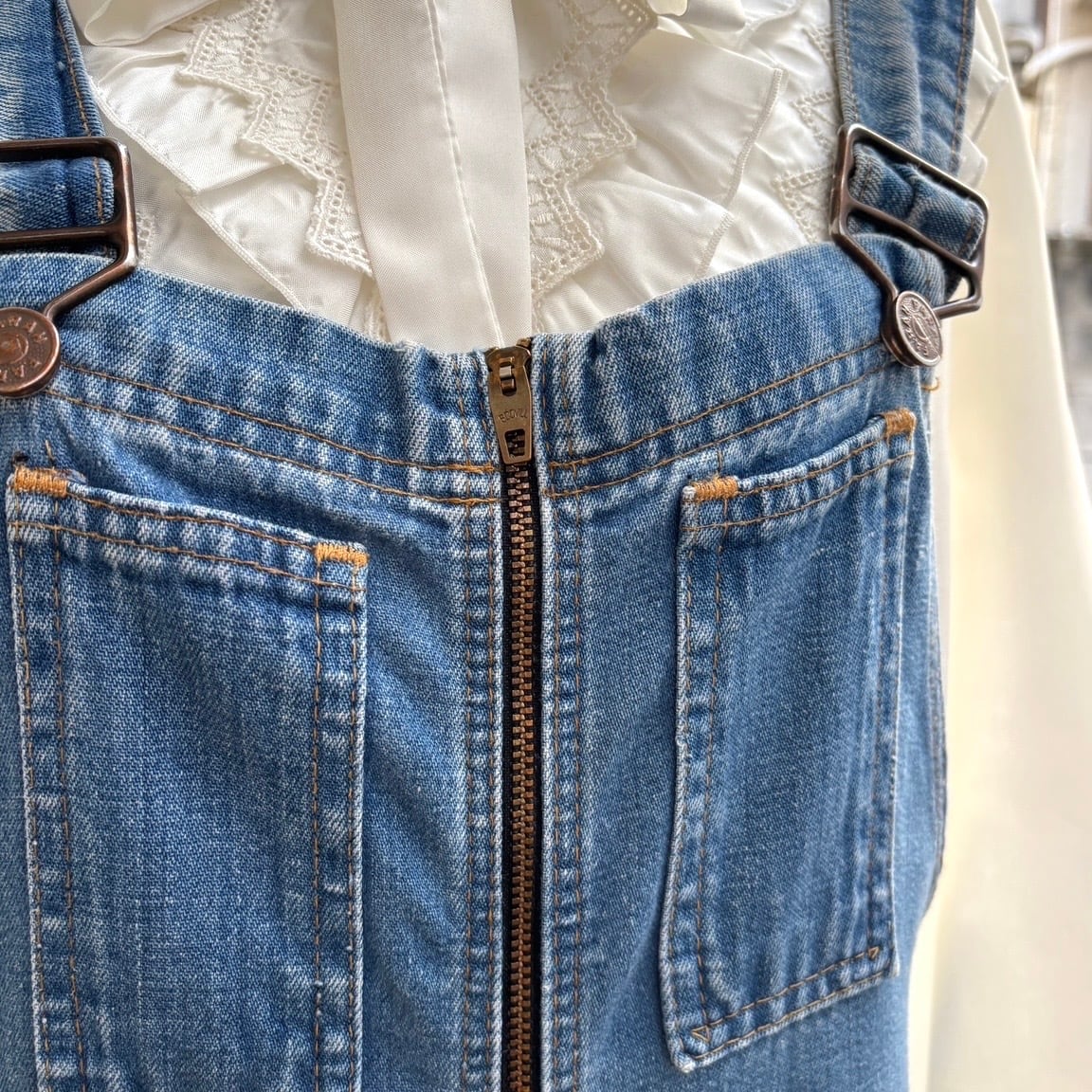 背面側左足やに薄っすらとしたシミ、背面側右足に引っ掛かりのような線のような擦れや股下にシミ、背面側のショルダー紐の縫い目にリペア、股の中央に縫い目のリペア、ヴィンテージデニム特有の色むらや色褪せ、所々僅かな生地の擦れ、背面側の裾に生地の擦れなど多少の経年感はありますが、ヴィンテージのあじとして捉えて頂けたらと思います。